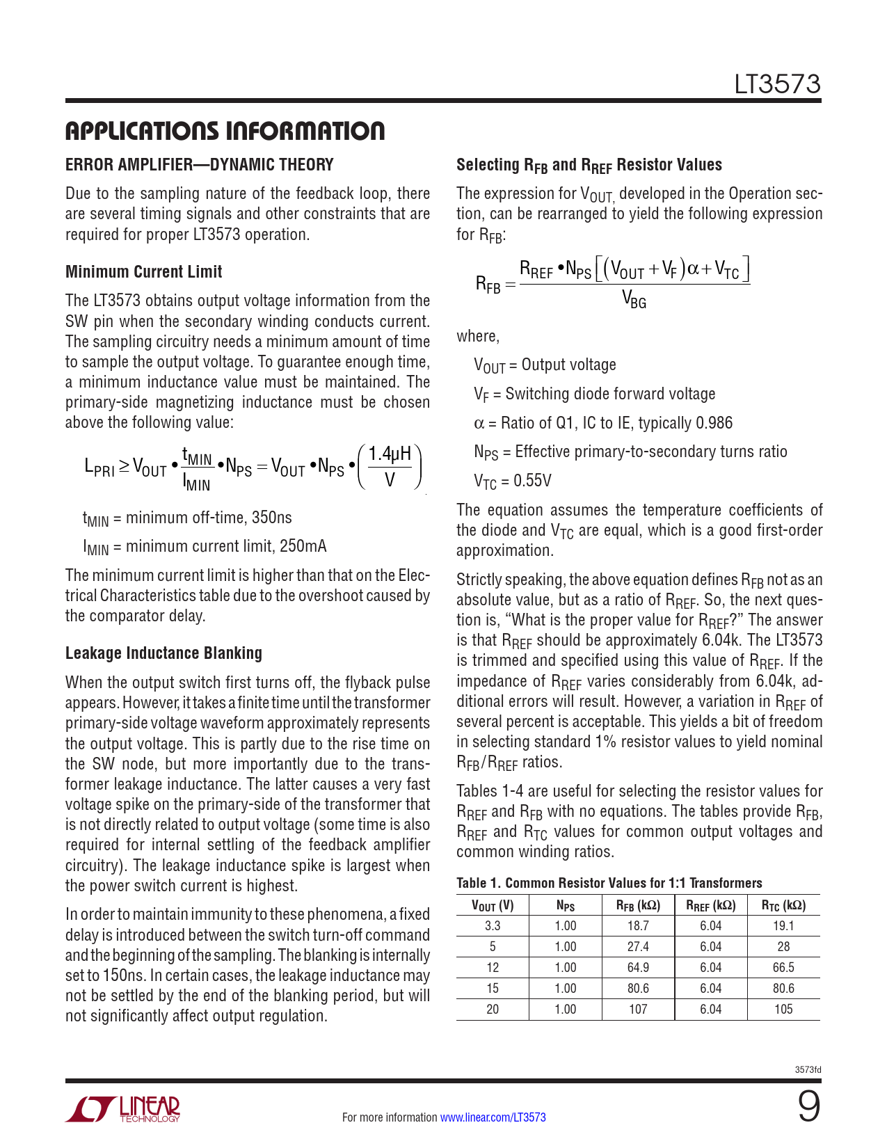 R ( )a+V  R REF •NPS VOUT + VF TC  FB = The LT3573 obtains output voltage information from the VBG SW pin when the secondary winding conducts current. The sampling circuitry needs a minimum amount of time where, to sample the output voltage. To guarantee enough time, VOUT = Output voltage a minimum inductance value must be maintained. The primary-side magnetizing inductance must be chosen VF = Switching diode forward voltage above the following value: a = Ratio of Q1, IC to IE, typically 0.986 t  1.4µH N L MIN  PS = Effective primary-to-secondary turns ratio PRI ≥ VOUT • •NPS = VOUT •NPS • IMIN  V  VTC = 0.55V t The equation assumes the temperature coefficients of MIN = minimum off-time, 350ns the diode and VTC are equal, which is a good first-order IMIN = minimum current limit, 250mA approximation. The minimum current limit is higher than that on the Elec- Strictly speaking, the above equation defines RFB not as an trical Characteristics table due to the overshoot caused by absolute value, but as a ratio of RREF. So, the next ques- the comparator delay. tion is, “What is the proper value for RREF?” The answer is that R