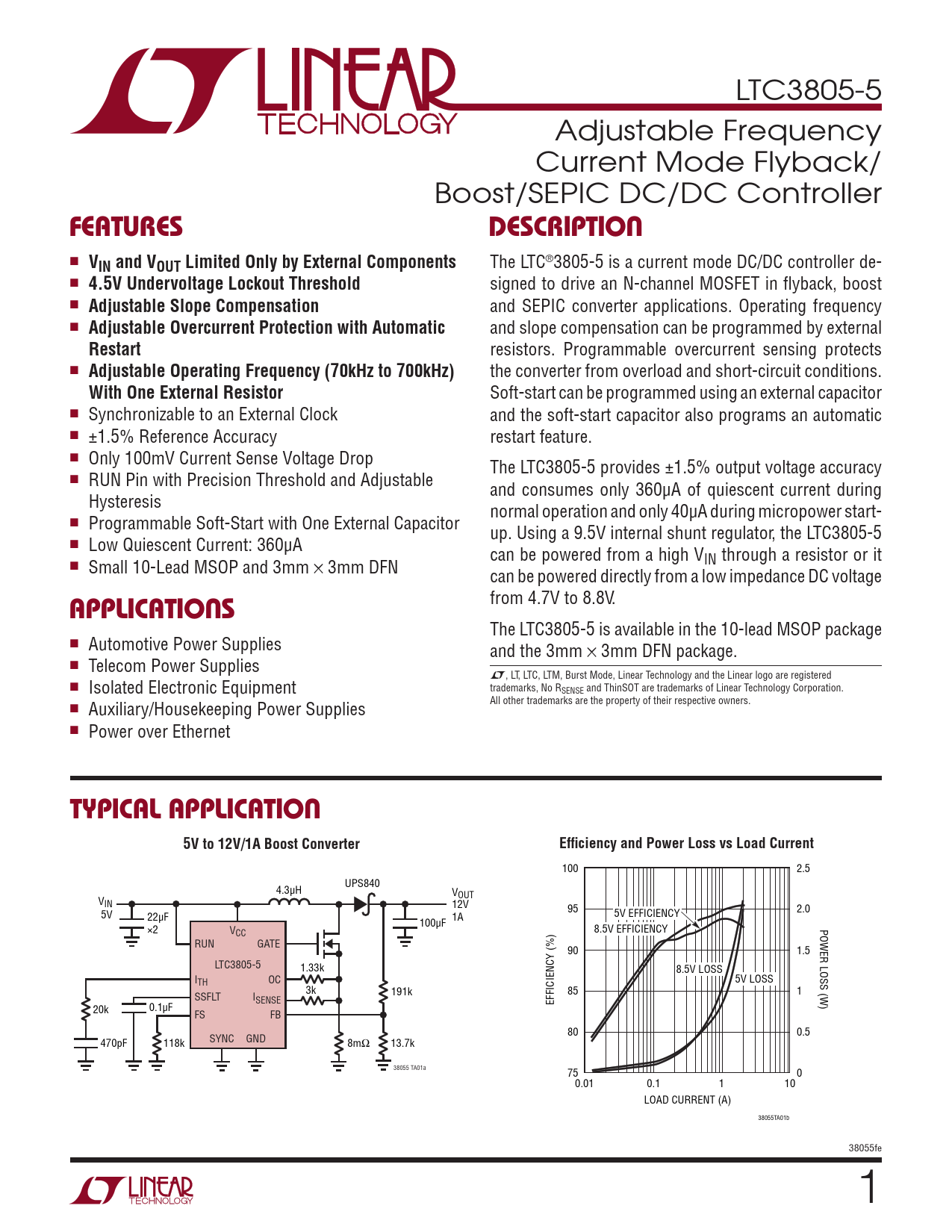 The LTC3805-5 is available in the 10-lead MSOP package n Automotive Power Supplies and the 3mm × 3mm DFN package. n Telecom Power Supplies L, LT, LTC, LTM, Burst Mode, Linear Technology and the Linear logo are registered n Isolated Electronic Equipment trademarks, No RSENSE and ThinSOT are trademarks of Linear Technology Corporation. All other trademarks are the property of their respective owners. n Auxiliary/Housekeeping Power Supplies n Power over Ethernet