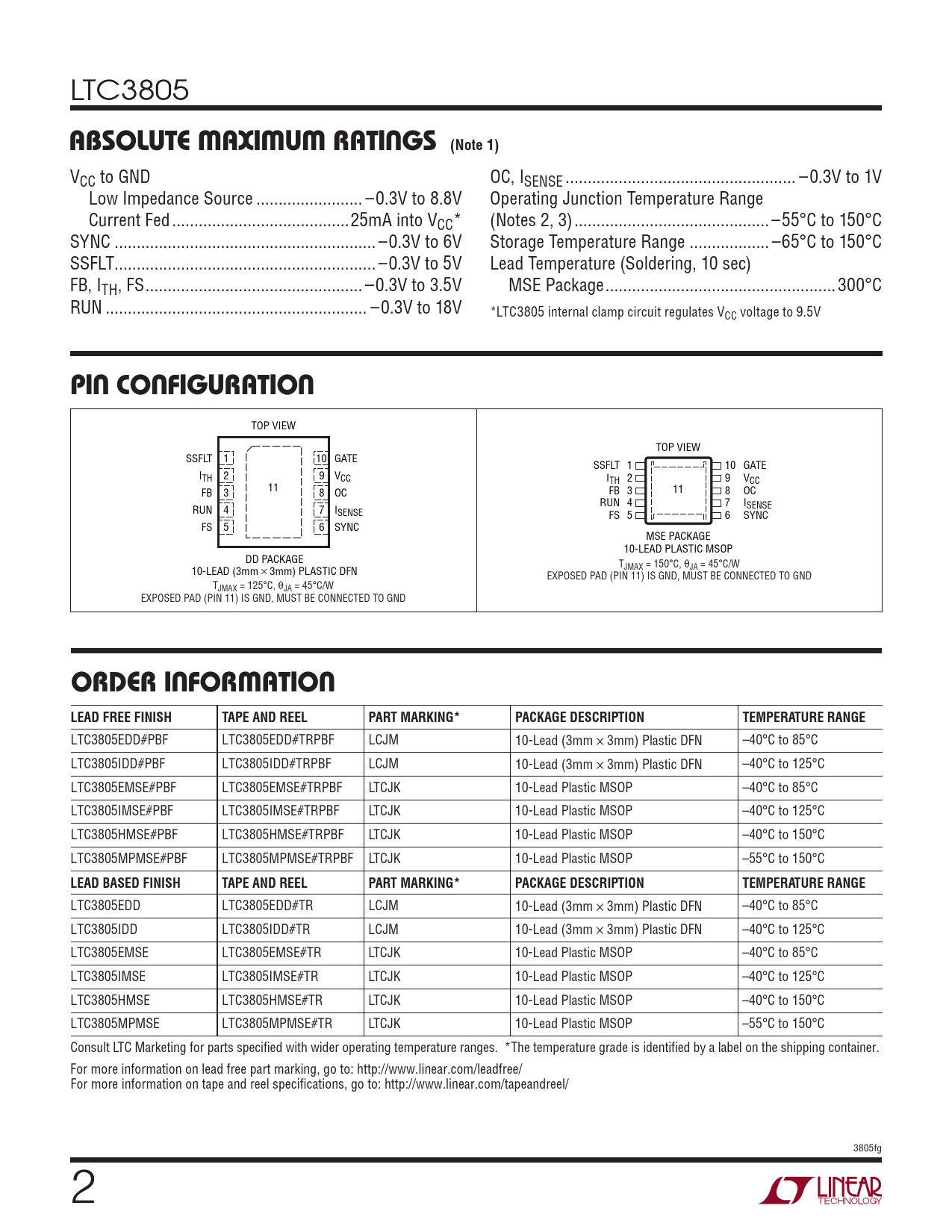 LTC3805 absolute MaxiMuM ratings (Note 1) VCC to GND OC, ISENSE .. –0.3V to 1V Low Impedance Source .. –0.3V to 8.8V Operating Junction Temperature Range Current Fed ..25mA into VCC* (Notes 2, 3) ..–55°C to 150°C SYNC ... –0.3V to 6V Storage Temperature Range .. –65°C to 150°C SSFLT... –0.3V to 5V Lead Temperature (Soldering, 10 sec) FB, ITH, FS ... –0.3V to 3.5V MSE Package ..300°C RUN ... –0.3V to 18V *LTC3805 internal clamp circuit regulates VCC voltage to 9.5V pin conFiguration TOP VIEW TOP VIEW SSFLT 1 10 GATE SSFLT 1 10 GATE ITH 2 9 VCC ITH 2 9 V 11 CC FB 3 8 OC FB 3 11 8 OC RUN 4 7 I RUN 4 7 I SENSE SENSE FS 5 6 SYNC FS 5 6 SYNC MSE PACKAGE 10-LEAD PLASTIC MSOP DD PACKAGE T 10-LEAD (3mm × 3mm) PLASTIC DFN JMAX = 150°C, θJA = 45°C/W EXPOSED PAD (PIN 11) IS GND, MUST BE CONNECTED TO GND TJMAX = 125°C, θJA = 45°C/W EXPOSED PAD (PIN 11) IS GND, MUST BE CONNECTED TO GND orDer inForMation LEAD FREE FINISHTAPE AND REELPART MARKING*PACKAGE DESCRIPTIONTEMPERATURE RANGE LTC3805EDD#PBF LTC3805EDD#TRPBF LCJM 10-Lead (3mm × 3mm) Plastic DFN –40°C to 85°C LTC3805IDD#PBF LTC3805IDD#TRPBF LCJM 10-Lead (3mm × 3mm) Plastic DFN –40°C to 125°C LTC3805EMSE#PBF LTC3805EMSE#TRPBF LTCJK 10-Lead Plastic MSOP –40°C to 85°C LTC3805IMSE#PBF LTC3805IMSE#TRPBF LTCJK 10-Lead Plastic MSOP –40°C to 125°C LTC3805HMSE#PBF LTC3805HMSE#TRPBF LTCJK 10-Lead Plastic MSOP –40°C to 150°C LTC3805MPMSE#PBF LTC3805MPMSE#TRPBF LTCJK 10-Lead Plastic MSOP –55°C to 150°C LEAD BASED FINISHTAPE AND REELPART MARKING*PACKAGE DESCRIPTIONTEMPERATURE RANGE LTC3805EDD LTC3805EDD#TR LCJM 10-Lead (3mm × 3mm) Plastic DFN –40°C to 85°C LTC3805IDD LTC3805IDD#TR LCJM 10-Lead (3mm × 3mm) Plastic DFN –40°C to 125°C LTC3805EMSE LTC3805EMSE#TR LTCJK 10-Lead Plastic MSOP –40°C to 85°C LTC3805IMSE LTC3805IMSE#TR LTCJK 10-Lead Plastic MSOP –40°C to 125°C LTC3805HMSE LTC3805HMSE#TR LTCJK 10-Lead Plastic MSOP –40°C to 150°C LTC3805MPMSE LTC3805MPMSE#TR LTCJK 10-Lead Plastic MSOP –55°C to 150°C Consult LTC Marketing for parts specified with wider operating temperature ranges. *The temperature grade is identified by a label on the shipping container. For more information on lead free part marking, go to: http://www.linear.com/leadfree/ For more information on tape and reel specifications, go to: http://www.linear.com/tapeandreel/ 3805fg 2 Document Outline Features Applications Description Typical Application Absolute Maximum Ratings Pin Configuration 0rder Information Electrical Characteristics Typical Performance Characteristics Pin Functions Block Diagram Operation Applications Information Typical Application Package Description Revision History Typical Application Related Parts