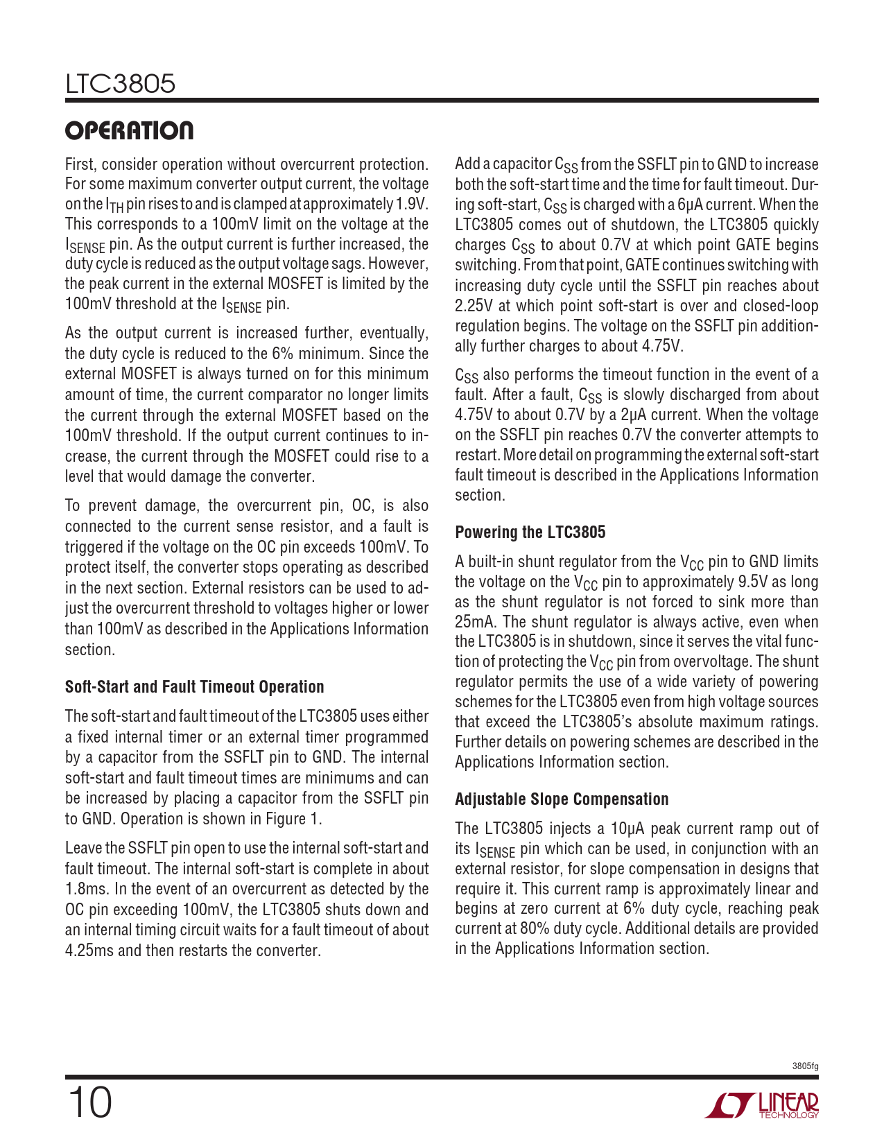 operation Powering the LTC3805 Soft-Start and Fault Timeout Operation Adjustable Slope Compensation