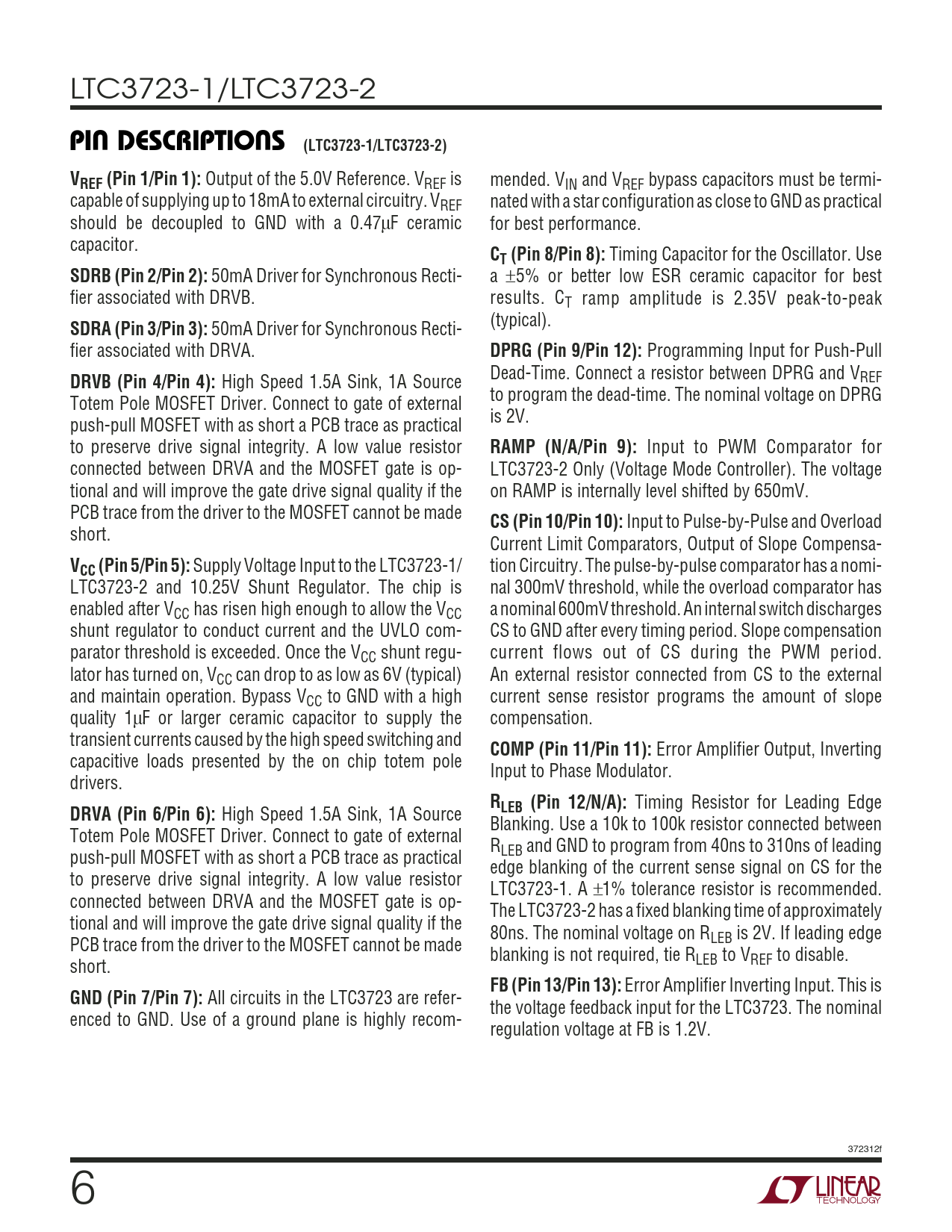 页数 / 页20 / 6 — PI DESCRIPTIO S (LTC3723-1/LTC3723-2). VREF (Pin 1/Pin 1):. CT (Pin 8/Pin …
