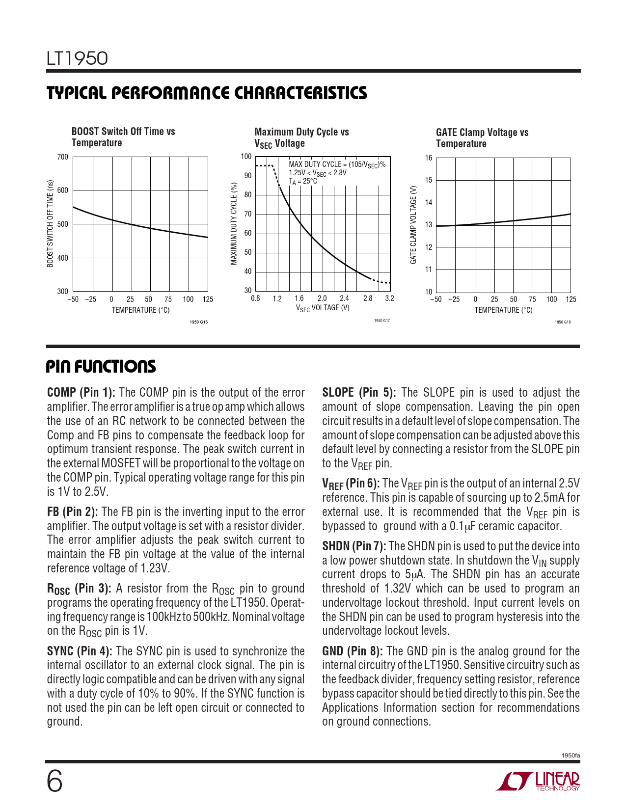 700 100 16 MAX DUTY CYCLE = (105/VSEC)% 90 1.25V < VSEC < 2.8V T 15 A = 25°C 600 80 14 70 500 13 60 12 50 400 MAXIMUM DUTY CYCLE (%) GATE CLAMP VOLTAGE (V) BOOST SWITCH OFF TIME (ns) 40 11 300 30 10 –50 –25 0 25 50 75 100 125 0.8 1.2 1.6 2.0 2.4 2.8 3.2 –50 –25 0 25 50 75 100 125 V TEMPERATURE ( SEC VOLTAGE (V) °C) TEMPERATURE (°C) 1950 G17 1950 G16 1950 G18