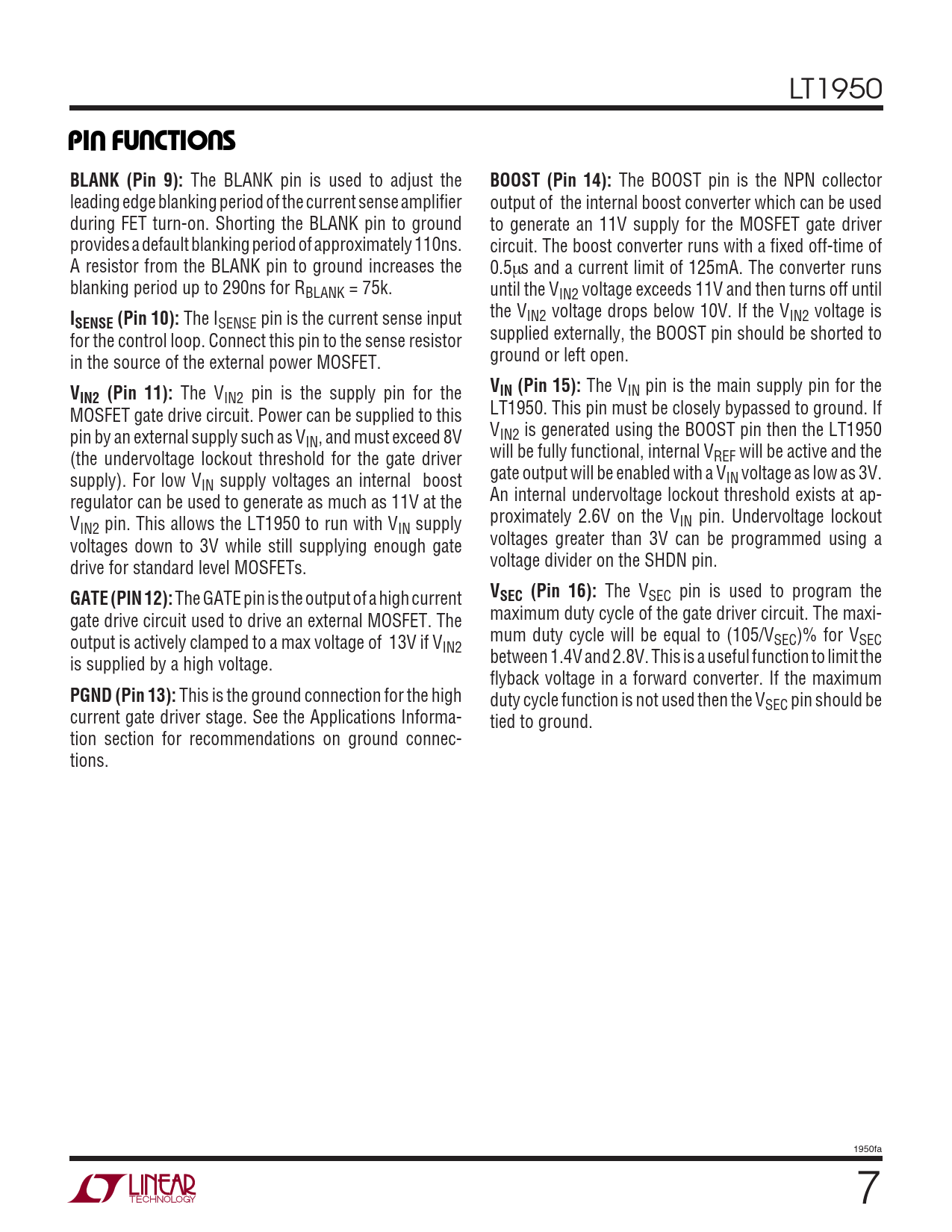 LT1950 UUUPI FU CTIO SBLANK (Pin 9): The BLANK pin is used to adjust the BOOST (Pin 14): The BOOST pin is the NPN collector leading edge blanking period of the current sense amplifier output of the internal boost converter which can be used during FET turn-on. Shorting the BLANK pin to ground to generate an 11V supply for the MOSFET gate driver provides a default blanking period of approximately 110ns. circuit. The boost converter runs with a fixed off-time of A resistor from the BLANK pin to ground increases the 0.5µs and a current limit of 125mA. The converter runs blanking period up to 290ns for RBLANK = 75k. until the VIN2 voltage exceeds 11V and then turns off until I the VIN2 voltage drops below 10V. If the VIN2 voltage is SENSE (Pin 10): The ISENSE pin is the current sense input for the control loop. Connect this pin to the sense resistor supplied externally, the BOOST pin should be shorted to in the source of the external power MOSFET. ground or left open. VVIN (Pin 15): The VIN pin is the main supply pin for the IN2 (Pin 11): The VIN2 pin is the supply pin for the MOSFET gate drive circuit. Power can be supplied to this LT1950. This pin must be closely bypassed to ground. If pin by an external supply such as V VIN2 is generated using the BOOST pin then the LT1950 IN, and must exceed 8V (the undervoltage lockout threshold for the gate driver will be fully functional, internal VREF will be active and the supply). For low V gate output will be enabled with a VIN voltage as low as 3V. IN supply voltages an internal boost regulator can be used to generate as much as 11V at the An internal undervoltage lockout threshold exists at ap- V proximately 2.6V on the VIN pin. Undervoltage lockout IN2 pin. This allows the LT1950 to run with VIN supply voltages down to 3V while still supplying enough gate voltages greater than 3V can be programmed using a drive for standard level MOSFETs. voltage divider on the SHDN pin. GATE (PIN 12): The GATE pin is the output of a high current VSEC (Pin 16): The VSEC pin is used to program the gate drive circuit used to drive an external MOSFET. The maximum duty cycle of the gate driver circuit. The maxi- output is actively clamped to a max voltage of 13V if V mum duty cycle will be equal to (105/VSEC)% for VSEC IN2 is supplied by a high voltage. between 1.4V and 2.8V. This is a useful function to limit the flyback voltage in a forward converter. If the maximum PGND (Pin 13): This is the ground connection for the high duty cycle function is not used then the VSEC pin should be current gate driver stage. See the Applications Informa- tied to ground. tion section for recommendations on ground connec- tions. 1950fa 7