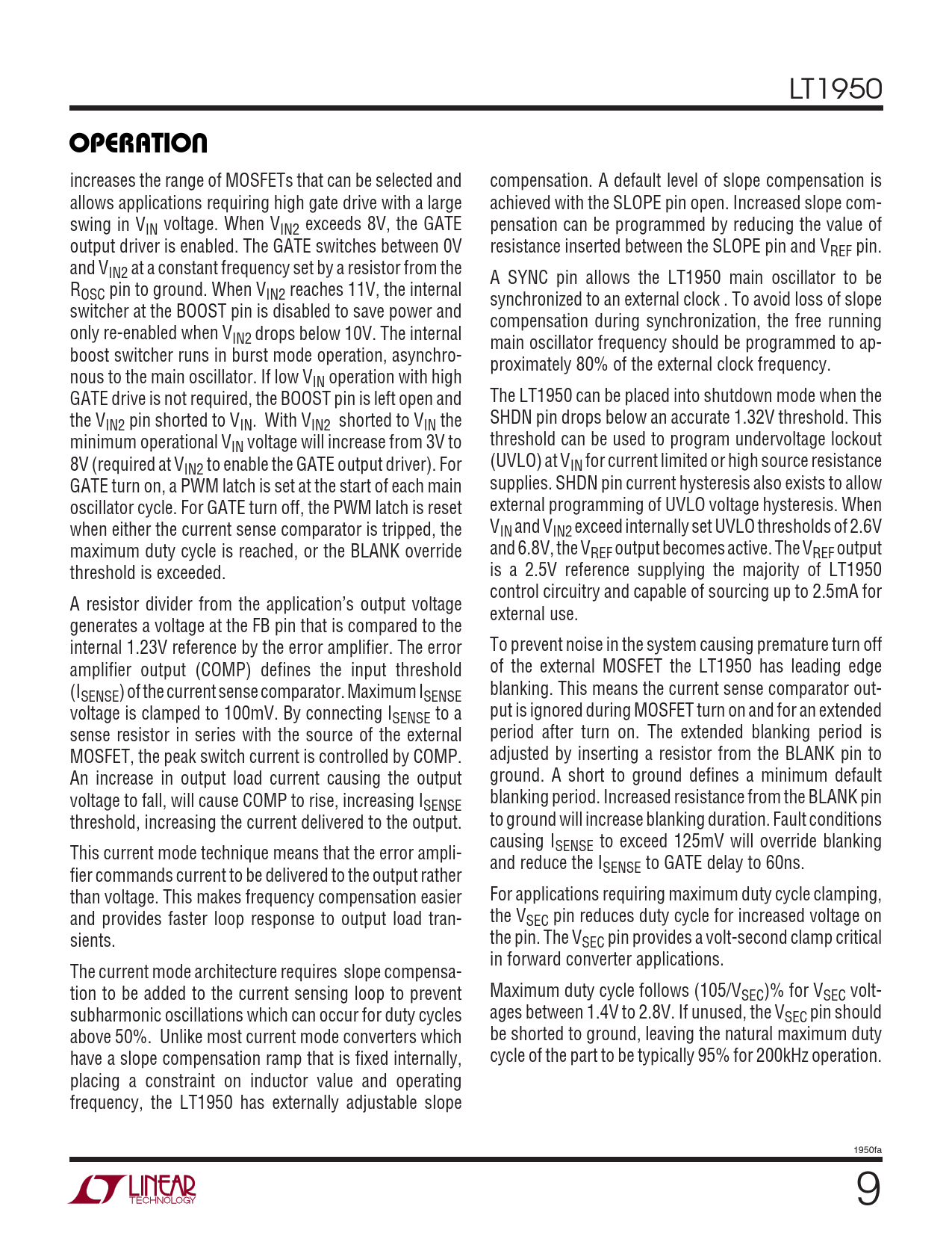 LT1950 UOPERATIO increases the range of MOSFETs that can be selected and compensation. A default level of slope compensation is allows applications requiring high gate drive with a large achieved with the SLOPE pin open. Increased slope com- swing in VIN voltage. When VIN2 exceeds 8V, the GATE pensation can be programmed by reducing the value of output driver is enabled. The GATE switches between 0V resistance inserted between the SLOPE pin and VREF pin. and VIN2 at a constant frequency set by a resistor from the A SYNC pin allows the LT1950 main oscillator to be ROSC pin to ground. When VIN2 reaches 11V, the internal synchronized to an external clock . To avoid loss of slope switcher at the BOOST pin is disabled to save power and compensation during synchronization, the free running only re-enabled when VIN2 drops below 10V. The internal main oscillator frequency should be programmed to ap- boost switcher runs in burst mode operation, asynchro- proximately 80% of the external clock frequency. nous to the main oscillator. If low VIN operation with high GATE drive is not required, the BOOST pin is left open and The LT1950 can be placed into shutdown mode when the the V SHDN pin drops below an accurate 1.32V threshold. This IN2 pin shorted to VIN. With VIN2 shorted to VIN the minimum operational V threshold can be used to program undervoltage lockout IN voltage will increase from 3V to 8V (required at V (UVLO) at V IN2 to enable the GATE output driver). For IN for current limited or high source resistance GATE turn on, a PWM latch is set at the start of each main supplies. SHDN pin current hysteresis also exists to allow oscillator cycle. For GATE turn off, the PWM latch is reset external programming of UVLO voltage hysteresis. When when either the current sense comparator is tripped, the VIN and VIN2 exceed internally set UVLO thresholds of 2.6V maximum duty cycle is reached, or the BLANK override and 6.8V, the VREF output becomes active. The VREF output threshold is exceeded. is a 2.5V reference supplying the majority of LT1950 control circuitry and capable of sourcing up to 2.5mA for A resistor divider from the application’s output voltage external use. generates a voltage at the FB pin that is compared to the internal 1.23V reference by the error amplifier. The error To prevent noise in the system causing premature turn off amplifier output (COMP) defines the input threshold of the external MOSFET the LT1950 has leading edge (I blanking. This means the current sense comparator out- SENSE) of the current sense comparator. Maximum ISENSE voltage is clamped to 100mV. By connecting I put is ignored during MOSFET turn on and for an extended SENSE to a sense resistor in series with the source of the external period after turn on. The extended blanking period is MOSFET, the peak switch current is controlled by COMP. adjusted by inserting a resistor from the BLANK pin to An increase in output load current causing the output ground. A short to ground defines a minimum default voltage to fall, will cause COMP to rise, increasing I blanking period. Increased resistance from the BLANK pin SENSE threshold, increasing the current delivered to the output. to ground will increase blanking duration. Fault conditions causing I This current mode technique means that the error ampli- SENSE to exceed 125mV will override blanking and reduce the I fier commands current to be delivered to the output rather SENSE to GATE delay to 60ns. than voltage. This makes frequency compensation easier For applications requiring maximum duty cycle clamping, and provides faster loop response to output load tran- the VSEC pin reduces duty cycle for increased voltage on sients. the pin. The VSEC pin provides a volt-second clamp critical in forward converter applications. The current mode architecture requires slope compensa- tion to be added to the current sensing loop to prevent Maximum duty cycle follows (105/VSEC)% for VSEC volt- subharmonic oscillations which can occur for duty cycles ages between 1.4V to 2.8V. If unused, the VSEC pin should above 50%. Unlike most current mode converters which be shorted to ground, leaving the natural maximum duty have a slope compensation ramp that is fixed internally, cycle of the part to be typically 95% for 200kHz operation. placing a constraint on inductor value and operating frequency, the LT1950 has externally adjustable slope 1950fa 9