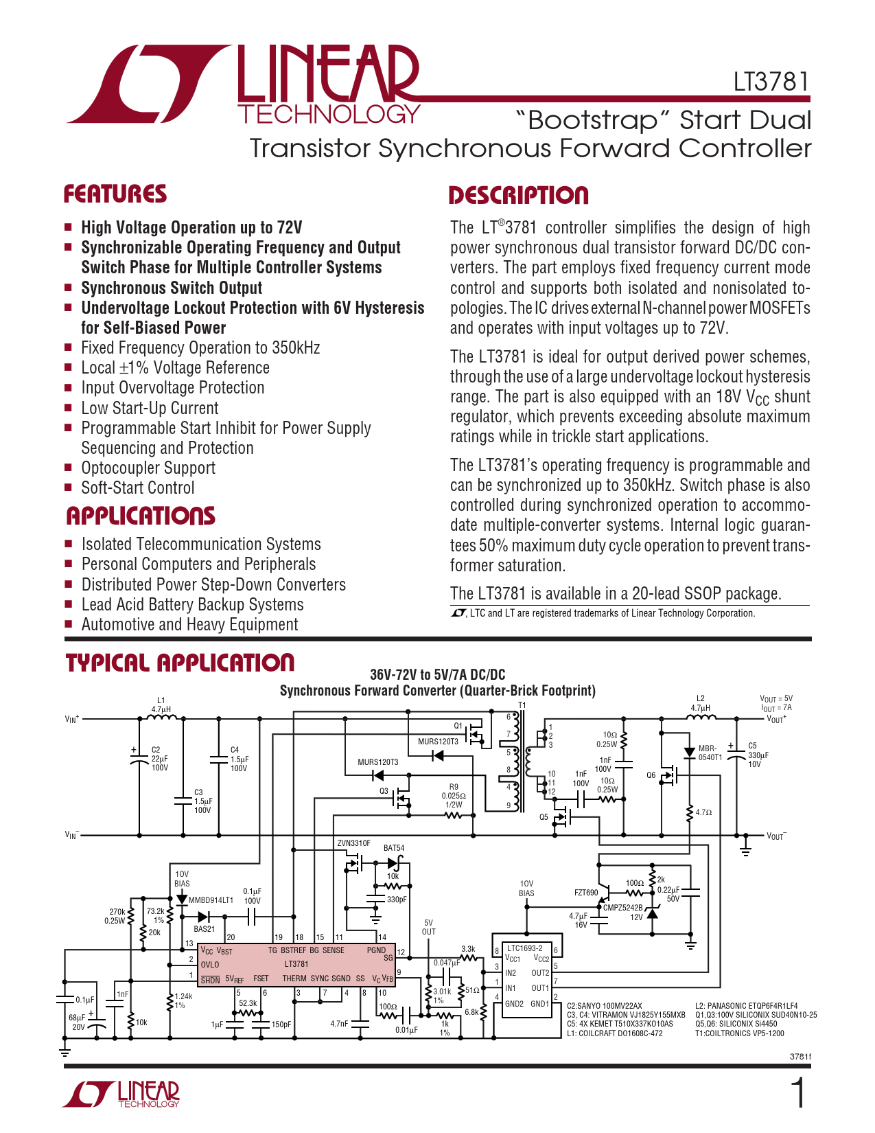 LT3781 “Bootstrap” Start Dual Transistor Synchronous Forward Controller UFEATURESDESCRIPTIO ■ High Voltage Operation up to 72V The LT®3781 controller simplifies the design of high ■ Synchronizable Operating Frequency and Output power synchronous dual transistor forward DC/DC con- Switch Phase for Multiple Controller Systems verters. The part employs fixed frequency current mode ■ Synchronous Switch Output control and supports both isolated and nonisolated to- ■ Undervoltage Lockout Protection with 6V Hysteresis pologies. The IC drives external N-channel power MOSFETs for Self-Biased Power and operates with input voltages up to 72V. ■ Fixed Frequency Operation to 350kHz The LT3781 is ideal for output derived power schemes, ■ Local ±1% Voltage Reference through the use of a large undervoltage lockout hysteresis ■ Input Overvoltage Protection range. The part is also equipped with an 18V VCC shunt ■ Low Start-Up Current regulator, which prevents exceeding absolute maximum ■ Programmable Start Inhibit for Power Supply ratings while in trickle start applications. Sequencing and Protection ■ Optocoupler Support The LT3781’s operating frequency is programmable and ■ can be synchronized up to 350kHz. Switch phase is also U Soft-Start Control controlled during synchronized operation to accommo- APPLICATIO S date multiple-converter systems. Internal logic guaran- ■ Isolated Telecommunication Systems tees 50% maximum duty cycle operation to prevent trans- ■ Personal Computers and Peripherals former saturation. ■ Distributed Power Step-Down Converters The LT3781 is available in a 20-lead SSOP package. ■ Lead Acid Battery Backup Systems , LTC and LT are registered trademarks of Linear Technology Corporation. ■ Automotive and Heavy Equipment UTYPICAL APPLICATIO36V-72V to 5V/7A DC/DCSynchronous Forward Converter (Quarter-Brick Footprint) L1 L2 VOUT = 5V T1 4.7µH 4.7µH I • OUT = 7A V + + 6 IN VOUT Q1 1 7 2 10Ω MURS120T3 3 0.25W + + C2 C5 C4 • • MBR- 5 22µF 330µF 1.5µF 1nF 0540T1 MURS120T3 100V 10V 100V 8 100V 10 1nF Q6 10 11 Ω R9 • 100V 4 C3 Q3 0.25W 12 0.025Ω 1.5µF 1/2W 9 100V 4.7Ω Q5 V – – IN VOUT ZVN3310F BAT54 1OV 10k BIAS 1OV 100Ω 2k 0.1µF BIAS FZT690 0.22µF MMBD914LT1 330pF 50V 100V 270k 73.2k CMPZ5242B 4.7µF 0.25W 1% 12V 5V 16V BAS21 20k OUT 20 19 18 15 11 14 13 V LTC1693-2 CC V TG BSTREF BG SENSE PGND 3.3k BST 12 8 6 2 SG VCC1 VCC2 OVLO LT3781 0.047µF 3 5 1 9 IN2 OUT2 SHDN 5VREF FSET THERM SYNC SGND SS VC VFB 1 7 IN1 OUT1 1nF 5 6 3 7 4 8 10 3.01k 51Ω 0.1µF 1.24k 4 2 52.3k 1% 1% 100Ω GND2 GND1 C2:SANYO 100MV22AX L2: PANASONIC ETQP6F4R1LF4 6.8k + 68µF C3, C4: VITRAMON VJ1825Y155MXB Q1,Q3:100V SILICONIX SUD40N10-25 10k 1µF 150pF 20V 4.7nF 1k C5: 4X KEMET T510X337KO10AS Q5,Q6: SILICONIX Si4450 0.01µF 1% L1: COILCRAFT DO1608C-472 T1:COILTRONICS VP5-1200 3781f 1