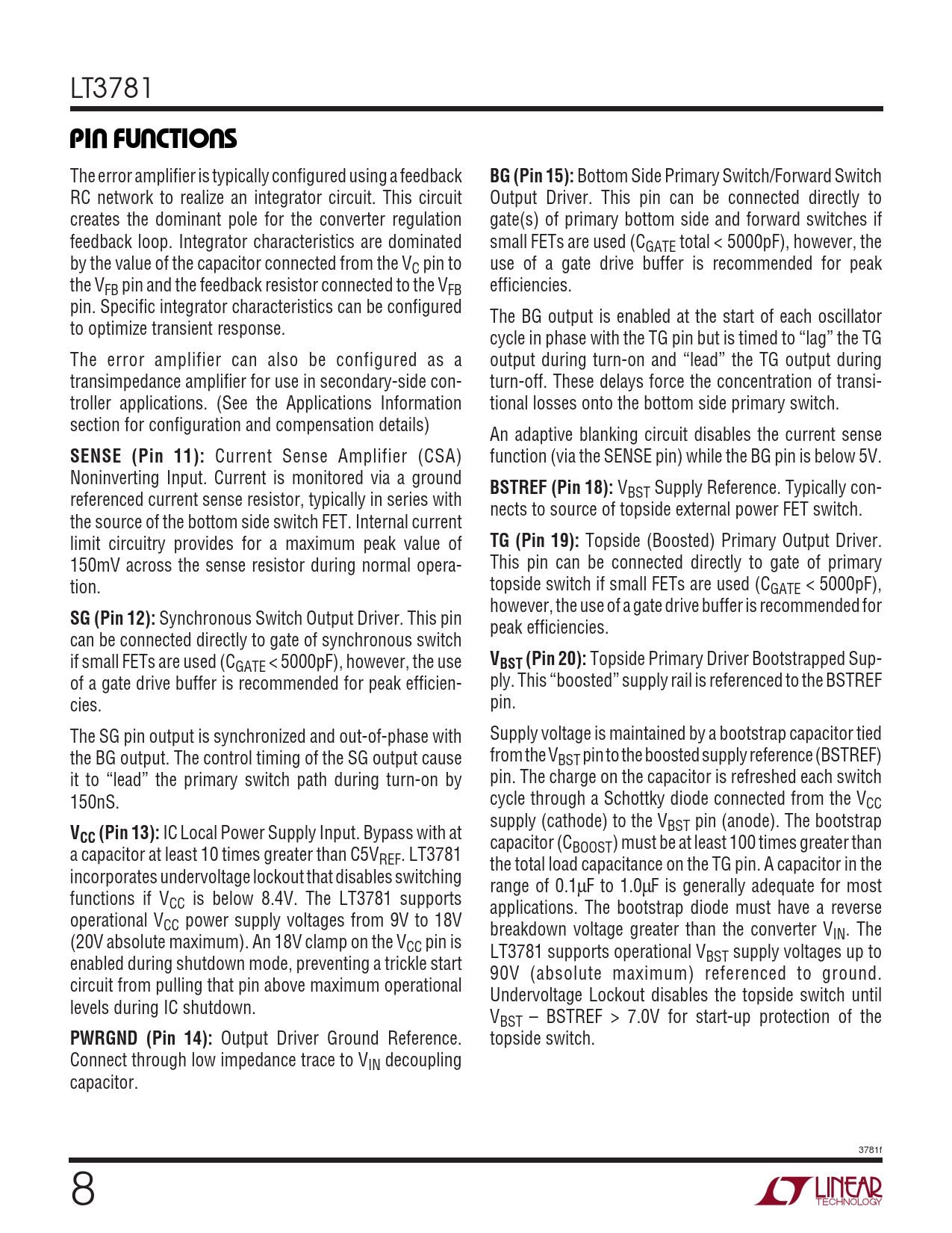 LT3781 UUUPI FU CTIO S The error amplifier is typically configured using a feedback BG (Pin 15): Bottom Side Primary Switch/Forward Switch RC network to realize an integrator circuit. This circuit Output Driver. This pin can be connected directly to creates the dominant pole for the converter regulation gate(s) of primary bottom side and forward switches if feedback loop. Integrator characteristics are dominated small FETs are used (CGATE total < 5000pF), however, the by the value of the capacitor connected from the VC pin to use of a gate drive buffer is recommended for peak the VFB pin and the feedback resistor connected to the VFB efficiencies. pin. Specific integrator characteristics can be configured The BG output is enabled at the start of each oscillator to optimize transient response. cycle in phase with the TG pin but is timed to “lag” the TG The error amplifier can also be configured as a output during turn-on and “lead” the TG output during transimpedance amplifier for use in secondary-side con- turn-off. These delays force the concentration of transi- troller applications. (See the Applications Information tional losses onto the bottom side primary switch. section for configuration and compensation details) An adaptive blanking circuit disables the current sense SENSE (Pin 11): Current Sense Amplifier (CSA) function (via the SENSE pin) while the BG pin is below 5V. Noninverting Input. Current is monitored via a ground BSTREF (Pin 18): V referenced current sense resistor, typically in series with BST Supply Reference. Typically con- nects to source of topside external power FET switch. the source of the bottom side switch FET. Internal current limit circuitry provides for a maximum peak value of TG (Pin 19): Topside (Boosted) Primary Output Driver. 150mV across the sense resistor during normal opera- This pin can be connected directly to gate of primary tion. topside switch if small FETs are used (CGATE < 5000pF), however, the use of a gate drive buffer is recommended for SG (Pin 12): Synchronous Switch Output Driver. This pin peak efficiencies. can be connected directly to gate of synchronous switch if small FETs are used (C V GATE < 5000pF), however, the use BST (Pin 20): Topside Primary Driver Bootstrapped Sup- of a gate drive buffer is recommended for peak efficien- ply. This “boosted” supply rail is referenced to the BSTREF cies. pin. The SG pin output is synchronized and out-of-phase with Supply voltage is maintained by a bootstrap capacitor tied the BG output. The control timing of the SG output cause from the VBST pin to the boosted supply reference (BSTREF) it to “lead” the primary switch path during turn-on by pin. The charge on the capacitor is refreshed each switch 150nS. cycle through a Schottky diode connected from the VCC supply (cathode) to the V V BST pin (anode). The bootstrap CC (Pin 13): IC Local Power Supply Input. Bypass with at capacitor (C a capacitor at least 10 times greater than C5V BOOST) must be at least 100 times greater than REF. LT3781 the total load capacitance on the TG pin. A capacitor in the incorporates undervoltage lockout that disables switching range of 0.1µF to 1.0µF is generally adequate for most functions if VCC is below 8.4V. The LT3781 supports applications. The bootstrap diode must have a reverse operational VCC power supply voltages from 9V to 18V breakdown voltage greater than the converter V (20V absolute maximum). An 18V clamp on the V IN. The CC pin is LT3781 supports operational V enabled during shutdown mode, preventing a trickle start BST supply voltages up to 90V (absolute maximum) referenced to ground. circuit from pulling that pin above maximum operational Undervoltage Lockout disables the topside switch until levels during IC shutdown. VBST – BSTREF > 7.0V for start-up protection of the PWRGND (Pin 14): Output Driver Ground Reference. topside switch. Connect through low impedance trace to VIN decoupling capacitor. 3781f 8