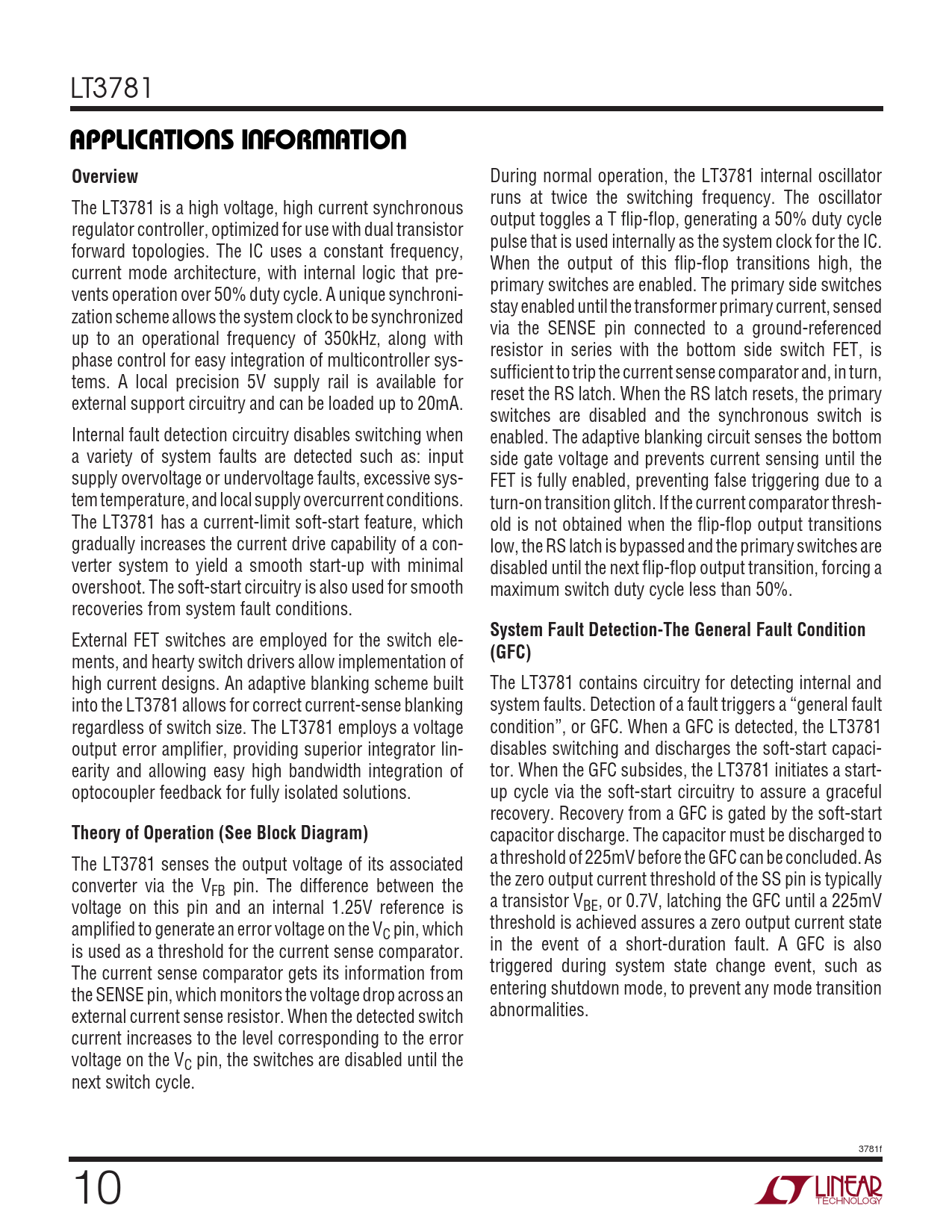 capacitor discharge. The capacitor must be discharged to The LT3781 senses the output voltage of its associated a threshold of 225mV before the GFC can be concluded. As converter via the V the zero output current threshold of the SS pin is typically FB pin. The difference between the voltage on this pin and an internal 1.25V reference is a transistor VBE, or 0.7V, latching the GFC until a 225mV amplified to generate an error voltage on the V threshold is achieved assures a zero output current state C pin, which is used as a threshold for the current sense comparator. in the event of a short-duration fault. A GFC is also The current sense comparator gets its information from triggered during system state change event, such as the SENSE pin, which monitors the voltage drop across an entering shutdown mode, to prevent any mode transition external current sense resistor. When the detected switch abnormalities. current increases to the level corresponding to the error voltage on the VC pin, the switches are disabled until the next switch cycle. 3781f 10