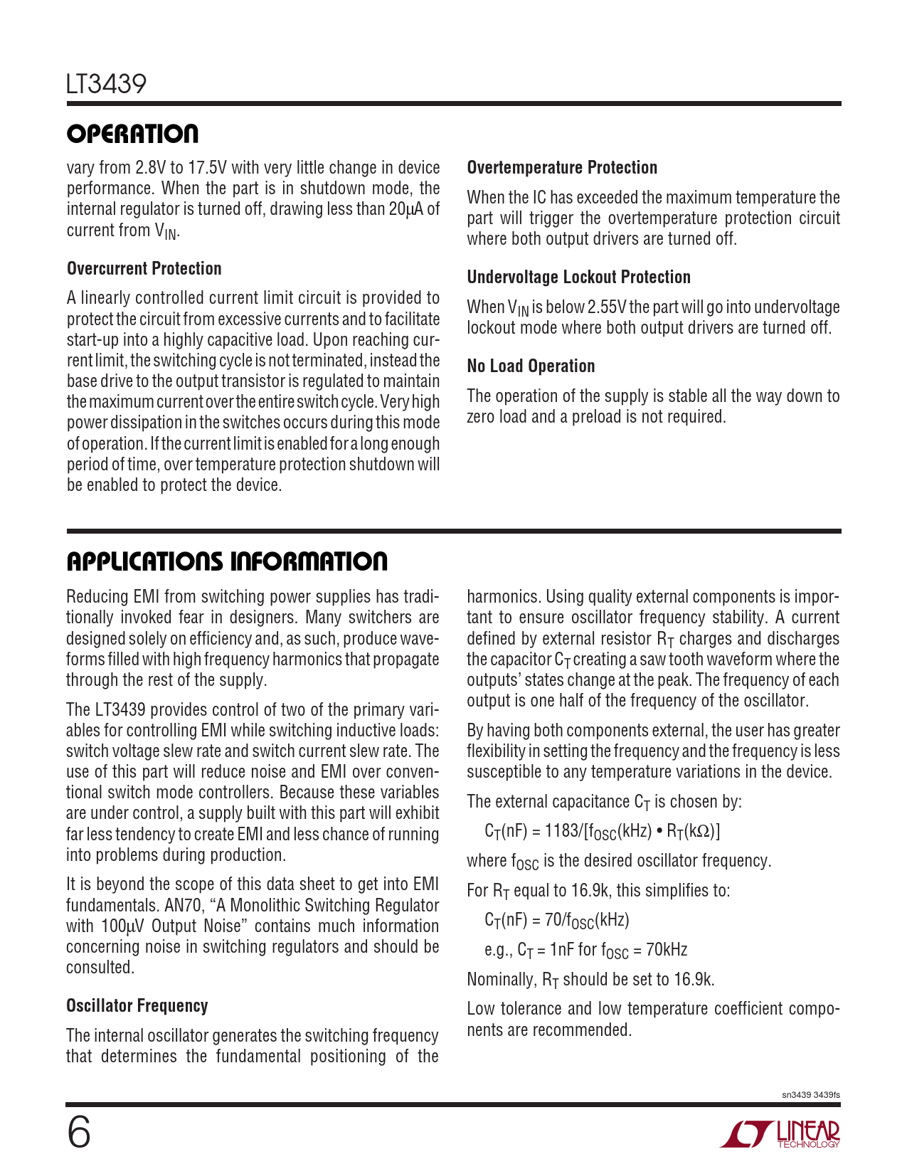 Reducing EMI from switching power supplies has tradi- harmonics. Using quality external components is impor- tionally invoked fear in designers. Many switchers are tant to ensure oscillator frequency stability. A current designed solely on efficiency and, as such, produce wave- defined by external resistor RT charges and discharges forms filled with high frequency harmonics that propagate the capacitor CT creating a saw tooth waveform where the through the rest of the supply. outputs’ states change at the peak. The frequency of each output is one half of the frequency of the oscillator. The LT3439 provides control of two of the primary vari- ables for controlling EMI while switching inductive loads: By having both components external, the user has greater switch voltage slew rate and switch current slew rate. The flexibility in setting the frequency and the frequency is less use of this part will reduce noise and EMI over conven- susceptible to any temperature variations in the device. tional switch mode controllers. Because these variables The external capacitance C are under control, a supply built with this part will exhibit T is chosen by: far less tendency to create EMI and less chance of running CT(nF) = 1183/[fOSC(kHz) • RT(kΩ)] into problems during production. where fOSC is the desired oscillator frequency. It is beyond the scope of this data sheet to get into EMI For RT equal to 16.9k, this simplifies to: fundamentals. AN70, “A Monolithic Switching Regulator with 100µV Output Noise” contains much information CT(nF) = 70/fOSC(kHz) concerning noise in switching regulators and should be e.g., CT = 1nF for fOSC = 70kHz consulted. Nominally, RT should be set to 16.9k.