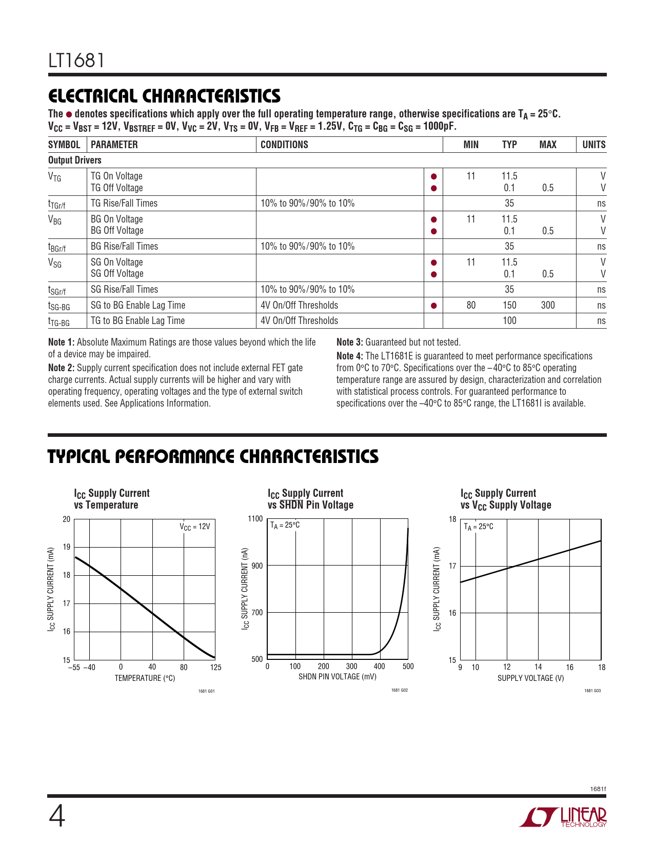 Supply current specification does not include external FET gate from 0°C to 70°C. Specifications over the – 40°C to 85°C operating charge currents. Actual supply currents will be higher and vary with temperature range are assured by design, characterization and correlation operating frequency, operating voltages and the type of external switch with statistical process controls. For guaranteed performance to elements used. See Applications Information. specifications over the –40°C to 85°C range, the LT1681I is available.