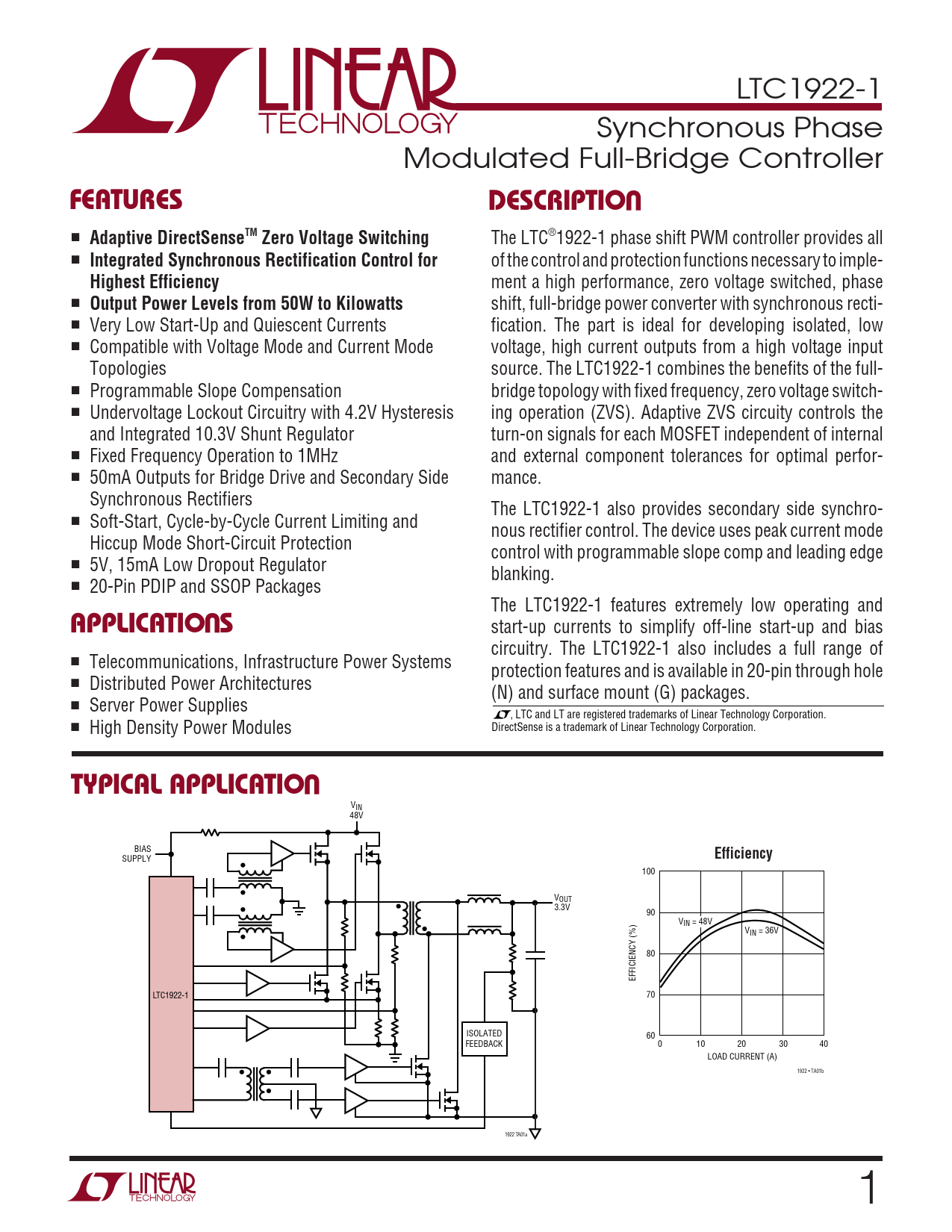 LTC1922-1 Synchronous Phase Modulated Full-Bridge Controller UFEATURESDESCRIPTIO ■ Adaptive DirectSenseTM Zero Voltage Switching The LTC®1922-1 phase shift PWM controller provides all ■ Integrated Synchronous Rectification Control for of the control and protection functions necessary to imple- Highest Efficiency ment a high performance, zero voltage switched, phase ■ Output Power Levels from 50W to Kilowatts shift, full-bridge power converter with synchronous recti- ■ Very Low Start-Up and Quiescent Currents fication. The part is ideal for developing isolated, low ■ Compatible with Voltage Mode and Current Mode voltage, high current outputs from a high voltage input Topologies source. The LTC1922-1 combines the benefits of the full- ■ Programmable Slope Compensation bridge topology with fixed frequency, zero voltage switch- ■ Undervoltage Lockout Circuitry with 4.2V Hysteresis ing operation (ZVS). Adaptive ZVS circuity controls the and Integrated 10.3V Shunt Regulator turn-on signals for each MOSFET independent of internal ■ Fixed Frequency Operation to 1MHz and external component tolerances for optimal perfor- ■ 50mA Outputs for Bridge Drive and Secondary Side mance. Synchronous Rectifiers The LTC1922-1 also provides secondary side synchro- ■ Soft-Start, Cycle-by-Cycle Current Limiting and nous rectifier control. The device uses peak current mode Hiccup Mode Short-Circuit Protection control with programmable slope comp and leading edge ■ 5V, 15mA Low Dropout Regulator blanking. ■ 20-Pin PDIP and SSOP Packages U The LTC1922-1 features extremely low operating and APPLICATIO S start-up currents to simplify off-line start-up and bias circuitry. The LTC1922-1 also includes a full range of ■ Telecommunications, Infrastructure Power Systems protection features and is available in 20-pin through hole ■ Distributed Power Architectures (N) and surface mount (G) packages. ■ Server Power Supplies , LTC and LT are registered trademarks of Linear Technology Corporation. ■ High Density Power Modules DirectSense is a trademark of Linear Technology Corporation. UTYPICAL APPLICATIO VIN 48V BIAS SUPPLY Efficiency 100 VOUT 3.3V 90 VIN = 48V VIN = 36V 80 EFFICIENCY (%) LTC1922-1 70 ISOLATED 60 FEEDBACK 0 10 20 30 40 LOAD CURRENT (A) 1922 • TA01b 1922 TA01a 1