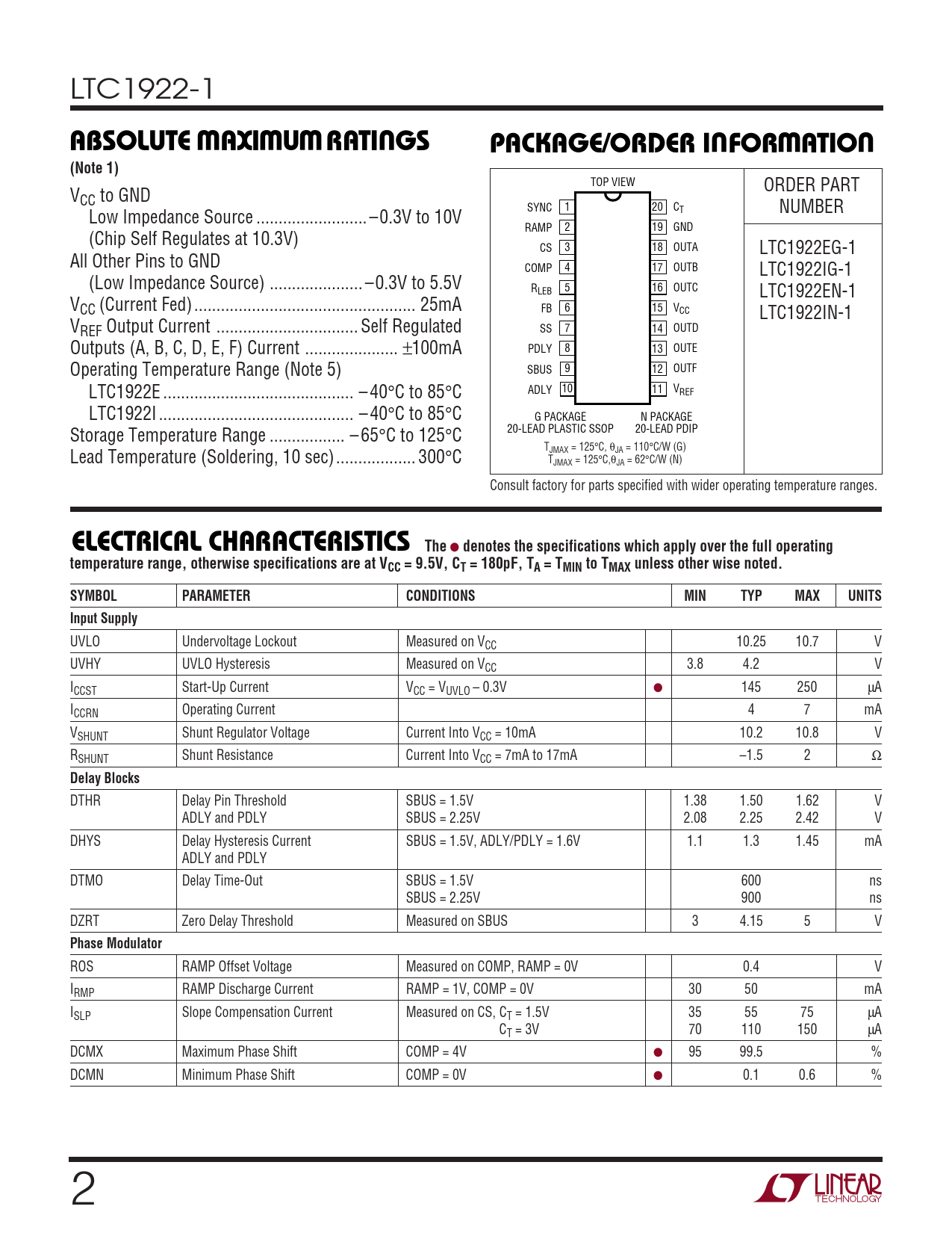 TOP VIEW ORDER PART VCC to GND SYNC 1 20 CT NUMBER Low Impedance Source ... –0.3V to 10V RAMP 2 19 GND (Chip Self Regulates at 10.3V) CS 3 18 OUTA LTC1922EG-1 All Other Pins to GND COMP 4 17 OUTB LTC1922IG-1 (Low Impedance Source) ... –0.3V to 5.5V R 5 16 LEB OUTC LTC1922EN-1 VCC (Current Fed).. 25mA FB 6 15 VCC LTC1922IN-1 VREF Output Current .. Self Regulated SS 7 14 OUTD Outputs (A, B, C, D, E, F) Current ... ±100mA PDLY 8 13 OUTE Operating Temperature Range (Note 5) SBUS 9 12 OUTF LTC1922E ... – 40°C to 85°C ADLY 10 11 VREF LTC1922I .. – 40°C to 85°C G PACKAGE N PACKAGE Storage Temperature Range ... – 65°C to 125°C 20-LEAD PLASTIC SSOP 20-LEAD PDIP T Lead Temperature (Soldering, 10 sec).. 300°C JMAX = 125°C, θJA = 110°C/W (G) TJMAX = 125°C,θJA = 62°C/W (N) Consult factory for parts specified with wider operating temperature ranges.