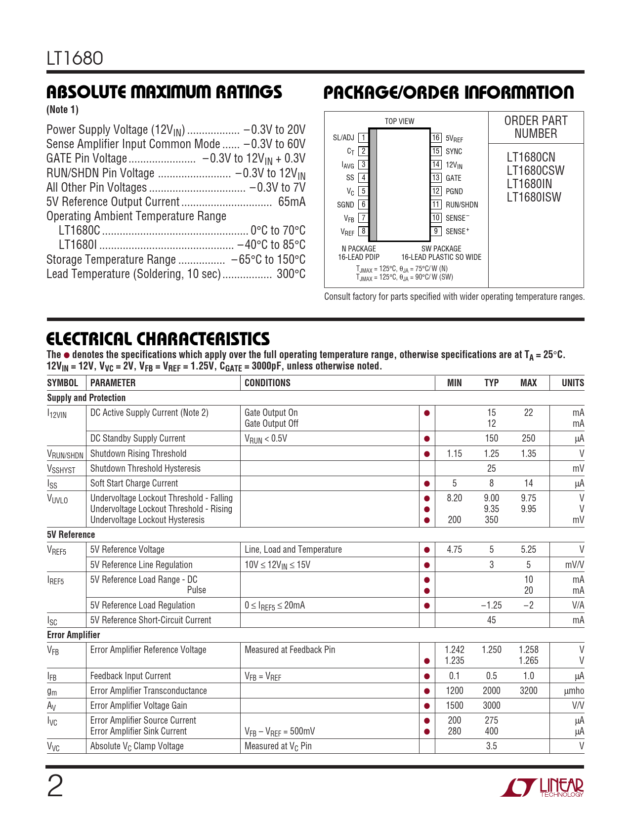 LT1680 WWWUUWUABSOLUTE AXI U RATI GSPACKAGE/ORDER I FOR ATIO(Note 1) TOP VIEW ORDER PART Power Supply Voltage (12VIN) .. – 0.3V to 20V NUMBER SL/ADJ 1 16 5VREF Sense Amplifier Input Common Mode .. – 0.3V to 60V C 2 15 T SYNC GATE Pin Voltage ... – 0.3V to 12V LT1680CN IN + 0.3V I 3 14 AVG 12VIN RUN/SHDN Pin Voltage ... – 0.3V to 12V LT1680CSW IN SS 4 13 GATE LT1680IN All Other Pin Voltages ... – 0.3V to 7V V 5 12 C PGND LT1680ISW 5V Reference Output Current ... 65mA SGND 6 11 RUN/SHDN Operating Ambient Temperature Range V 7 10 FB SENSE – LT1680C .. 0°C to 70°C V 8 9 REF SENSE + LT1680I .. – 40°C to 85°C N PACKAGE SW PACKAGE 16-LEAD PDIP 16-LEAD PLASTIC SO WIDE Storage Temperature Range .. – 65°C to 150°C TJMAX = 125°C, θJA = 75°C/ W (N) Lead Temperature (Soldering, 10 sec)... 300°C TJMAX = 125°C, θJA = 90°C/ W (SW) Consult factory for parts specified with wider operating temperature ranges. ELECTRICAL CHARACTERISTICSThe ● denotes the specifications which apply over the full operating temperature range, otherwise specifications are at TA = 25 ° C.12VIN = 12V, VVC = 2V, VFB = VREF = 1.25V, CGATE = 3000pF, unless otherwise noted.SYMBOLPARAMETERCONDITIONSMINTYPMAXUNITSSupply and Protection I12VIN DC Active Supply Current (Note 2) Gate Output On ● 15 22 mA Gate Output Off 12 mA DC Standby Supply Current VRUN < 0.5V ● 150 250 µA VRUN/SHDN Shutdown Rising Threshold ● 1.15 1.25 1.35 V VSSHYST Shutdown Threshold Hysteresis 25 mV ISS Soft Start Charge Current ● 5 8 14 µA VUVLO Undervoltage Lockout Threshold - Falling ● 8.20 9.00 9.75 V Undervoltage Lockout Threshold - Rising ● 9.35 9.95 V Undervoltage Lockout Hysteresis ● 200 350 mV 5V Reference VREF5 5V Reference Voltage Line, Load and Temperature ● 4.75 5 5.25 V 5V Reference Line Regulation 10V ≤ 12VIN ≤ 15V ● 3 5 mV/V IREF5 5V Reference Load Range - DC ● 10 mA Pulse ● 20 mA 5V Reference Load Regulation 0 ≤ IREF5 ≤ 20mA ● –1.25 – 2 V/A ISC 5V Reference Short-Circuit Current 45 mA Error Amplifier VFB Error Amplifier Reference Voltage Measured at Feedback Pin 1.242 1.250 1.258 V ● 1.235 1.265 V IFB Feedback Input Current VFB = VREF ● 0.1 0.5 1.0 µA gm Error Amplifier Transconductance ● 1200 2000 3200 µmho AV Error Amplifier Voltage Gain ● 1500 3000 V/V IVC Error Amplifier Source Current ● 200 275 µA Error Amplifier Sink Current VFB – VREF = 500mV ● 280 400 µA VVC Absolute VC Clamp Voltage Measured at VC Pin 3.5 V 2