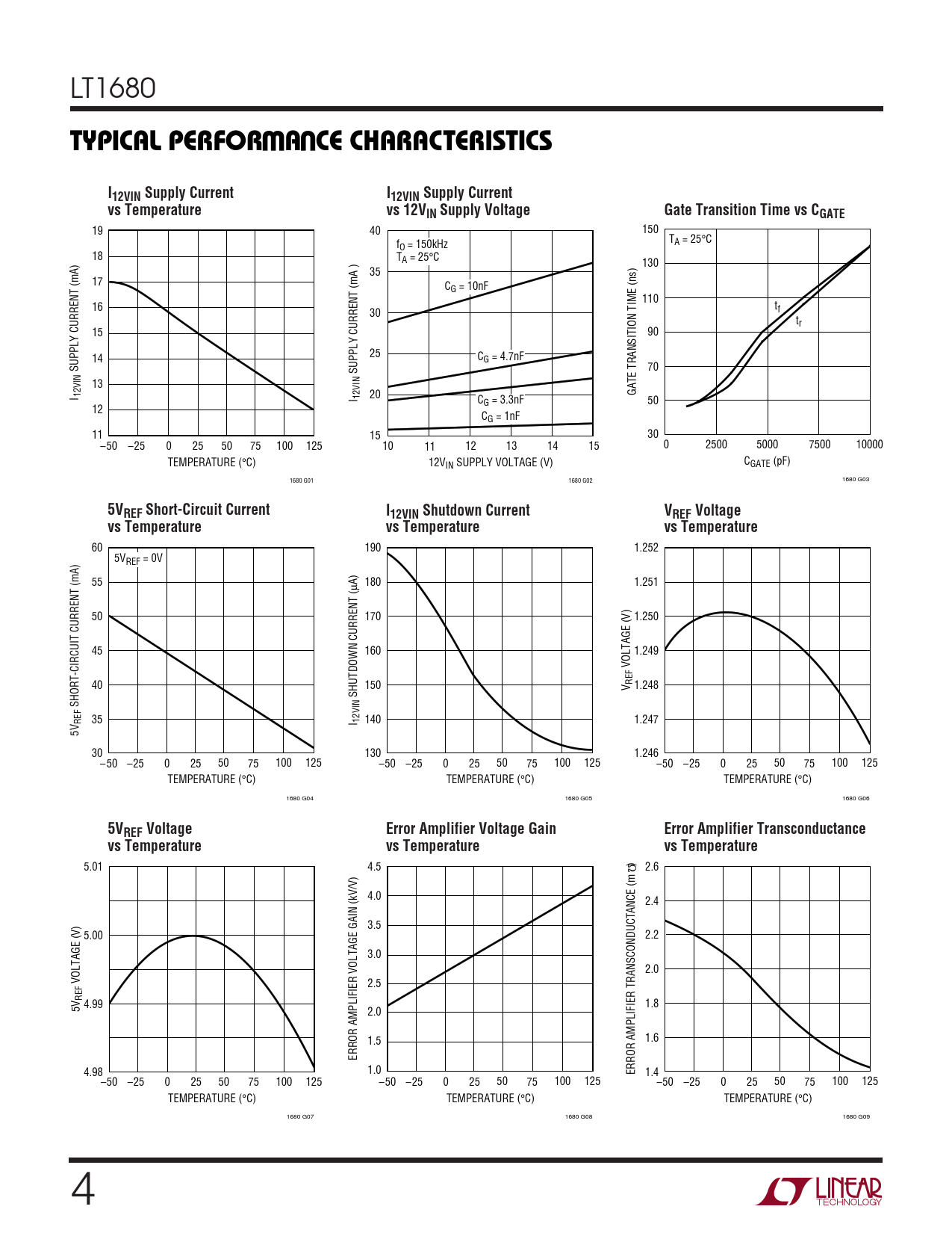 19 40 150 T f A = 25°C O = 150kHz • 18 TA = 25°C 130 35 17 CG = 10nF 110 • 16 t • 30 f tr 15 90 • • 25 14 CG = 4.7nF SUPPLY CURRENT (mA) 70 SUPPLY CURRENT (mA ) • 13 • I 12VIN GATE TRANSITION TIME (ns) I 12VIN 20 CG = 3.3nF 50 12 CG = 1nF 11 15 30 –50 –25 0 25 50 75 100 125 10 11 12 13 14 15 0 2500 5000 7500 10000 TEMPERATURE (°C) 12V C IN SUPPLY VOLTAGE (V) GATE (pF) 1680 G01 1680 G02 1680 G03