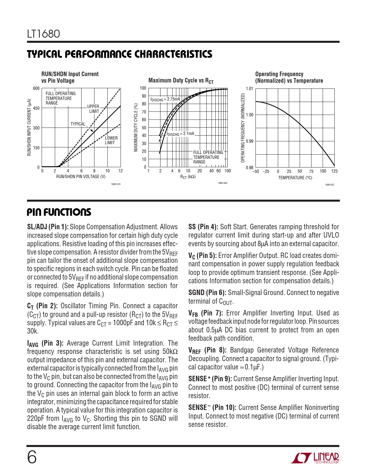 LT1680 WUTYPICAL PERFOR A CE CHARACTERISTICSRUN/SHDN Input CurrentOperating Frequencyvs Pin VoltageMaximum Duty Cycle vs RCT(Normalized) vs Temperature 600 100 1.01 FULL OPERATING 90 TEMPERATURE IDISCHG = 2.75mA µA) RANGE 80 450 UPPER LIMIT 70 1.00 60 TYPICAL 300 50 I 40 DISCHG = 2.1mA LOWER 0.99 LIMIT 30 150 MAXIMUM DUTY CYCLE (%) 20 FULL OPERATING RUN/SHDN INPUT CURRENT ( TEMPERATURE 10 RANGE OPERATING FREQUENCY (NORMALIZED) 0 0 0.98 0 2 4 6 8 10 12 1 2 4 6 10 20 40 60 100 –50 –25 0 25 50 75 100 125 RUN/SHDN PIN VOLTAGE (V) RCT (kΩ) TEMPERATURE (°C) 1680 G20 1680 G19 1680 G21 UUUPI FU CTIO SSL/ADJ (Pin 1): Slope Compensation Adjustment. Allows SS (Pin 4): Soft Start. Generates ramping threshold for increased slope compensation for certain high duty cycle regulator current limit during start-up and after UVLO applications. Resistive loading of this pin increases effec- events by sourcing about 8µA into an external capacitor. tive slope compensation. A resistor divider from the 5VREF V pin can tailor the onset of additional slope compensation C (Pin 5): Error Amplifier Output. RC load creates domi- nant compensation in power supply regulation feedback to specific regions in each switch cycle. Pin can be floated loop to provide optimum transient response. (See Appli- or connected to 5VREF if no additional slope compensation cations Information section for compensation details.) is required. (See Applications Information section for slope compensation details.) SGND (Pin 6): Small-Signal Ground. Connect to negative terminal of C C OUT. T (Pin 2): Oscillator Timing Pin. Connect a capacitor (C V CT) to ground and a pull-up resistor (RCT) to the 5VREF FB (Pin 7): Error Amplifier Inverting Input. Used as supply. Typical values are C voltage feedback input node for regulator loop. Pin sources CT = 1000pF and 10k ≤ RCT ≤ 30k. about 0.5µA DC bias current to protect from an open feedback path condition. IAVG (Pin 3): Average Current Limit Integration. The frequency response characteristic is set using 50kΩ VREF (Pin 8): Bandgap Generated Voltage Reference output impedance of this pin and external capacitor. The Decoupling. Connect a capacitor to signal ground. (Typi- external capacitor is typically connected from the I cal capacitor value ≈ 0.1µF.) AVG pin to the VC pin, but can also be connected from the IAVG pin SENSE + (Pin 9): Current Sense Amplifier Inverting Input. to ground. Connecting the capacitor from the IAVG pin to Connect to most positive (DC) terminal of current sense the VC pin uses an internal gain block to form an active resistor. integrator, minimizing the capacitance required for stable operation. A typical value for this integration capacitor is SENSE – (Pin 10): Current Sense Amplifier Noninverting 220pF from I Input. Connect to most negative (DC) terminal of current AVG to VC. Shorting this pin to SGND will disable the average current limit function. sense resistor. 6