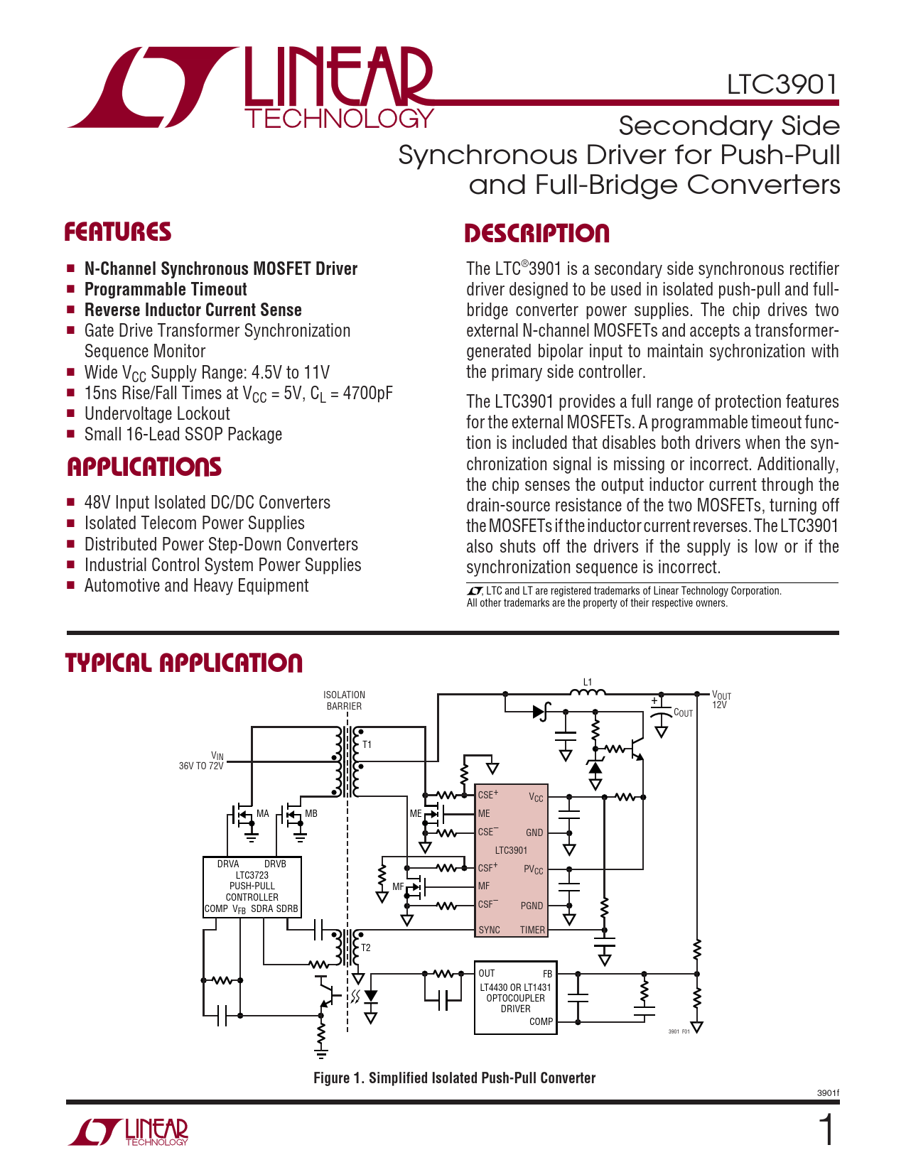 LTC3901 Secondary Side Synchronous Driver for Push-Pull and Full-Bridge Converters UFEATURESDESCRIPTIO ■ N-Channel Synchronous MOSFET Driver The LTC®3901 is a secondary side synchronous rectifier ■ Programmable Timeout driver designed to be used in isolated push-pull and full- ■ Reverse Inductor Current Sense bridge converter power supplies. The chip drives two ■ Gate Drive Transformer Synchronization external N-channel MOSFETs and accepts a transformer- Sequence Monitor generated bipolar input to maintain sychronization with ■ Wide VCC Supply Range: 4.5V to 11V the primary side controller. ■ 15ns Rise/Fall Times at VCC = 5V, CL = 4700pF The LTC3901 provides a full range of protection features ■ Undervoltage Lockout for the external MOSFETs. A programmable timeout func- ■ Small 16-Lead SSOP Package tion is included that disables both drivers when the syn- U chronization signal is missing or incorrect. Additionally, APPLICATIO S the chip senses the output inductor current through the ■ 48V Input Isolated DC/DC Converters drain-source resistance of the two MOSFETs, turning off ■ Isolated Telecom Power Supplies the MOSFETs if the inductor current reverses. The LTC3901 ■ Distributed Power Step-Down Converters also shuts off the drivers if the supply is low or if the ■ Industrial Control System Power Supplies synchronization sequence is incorrect. ■ Automotive and Heavy Equipment , LTC and LT are registered trademarks of Linear Technology Corporation. All other trademarks are the property of their respective owners. UTYPICAL APPLICATIO L1 ISOLATION VOUT + BARRIER 12V COUT T1 VIN 36V TO 72V CSE+ VCC MA MB ME ME CSE– GND LTC3901 DRVA DRVB CSF+ PV LTC3723 CC PUSH-PULL MF MF CONTROLLER CSF– COMP V PGND FB SDRA SDRB SYNC TIMER T2 OUT FB LT4430 OR LT1431 OPTOCOUPLER DRIVER COMP 3901 F01 Figure 1. Simplified Isolated Push-Pull Converter 3901f 1