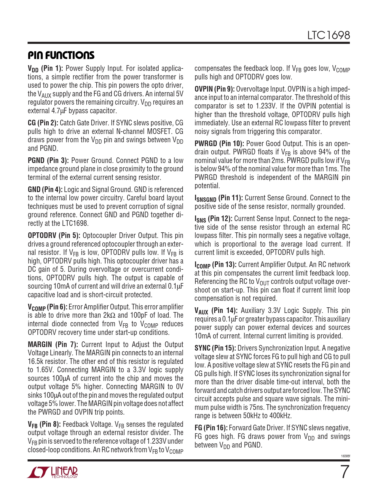 Optocoupler Driver Output. This pin lowpass filter. This pin normally sees a negative voltage, drives a ground referenced optocoupler through an exter- which is proportional to the average load current. If nal resistor. If VFB is low, OPTODRV pulls low. If VFB is current limit is exceeded, OPTODRV pulls high. high, OPTODRV pulls high. This optocoupler driver has a