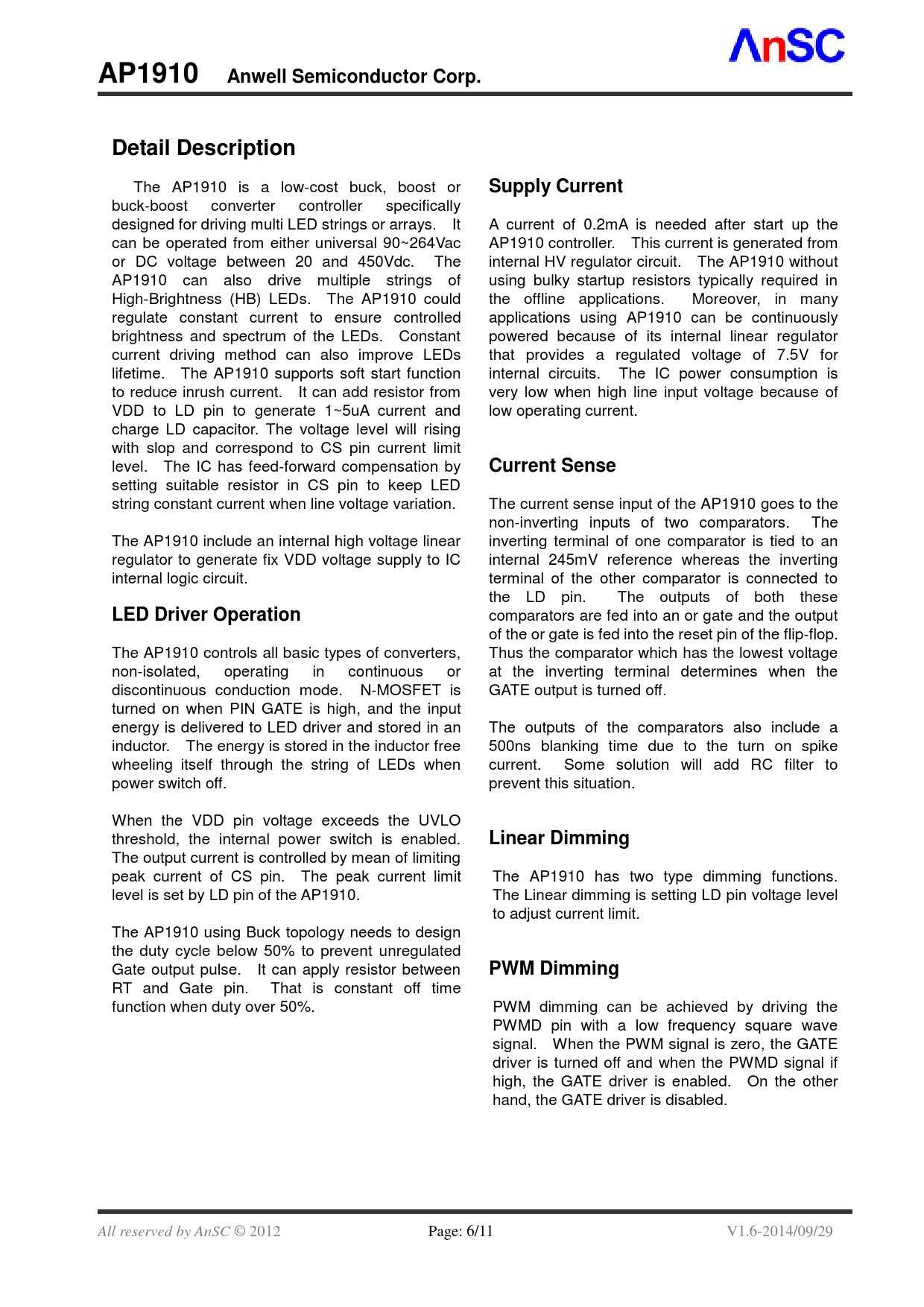 | 页数 / 页 | 11 / 6 — AP1910 Anwell Semiconductor Corp. Detail Description. Supply Current. … |