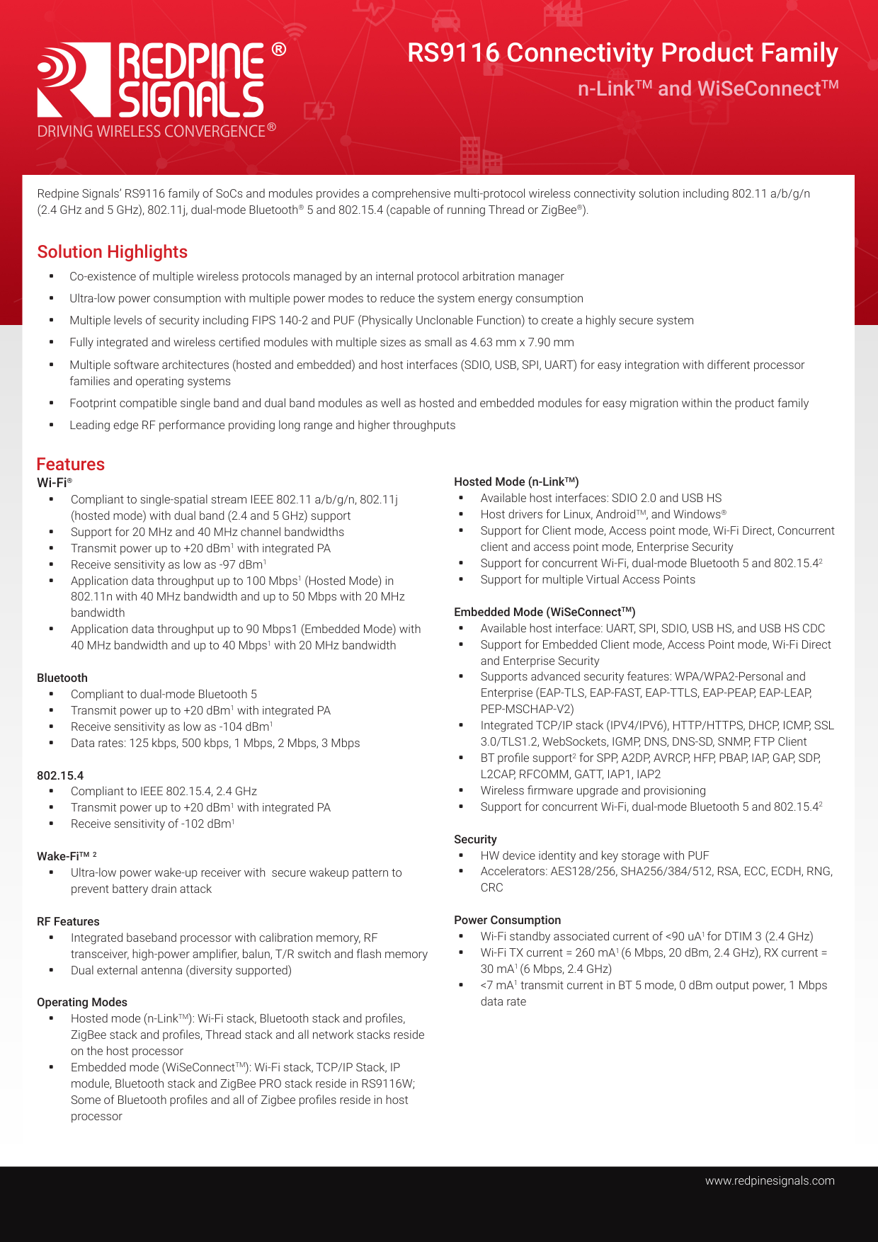 RS9116. Connectivity. Product. Family. n-LinkTM. and. WiSeConnectTM. Redpine. Signals’. RS9116. family. of. SoCs. and. modules. provides. a
