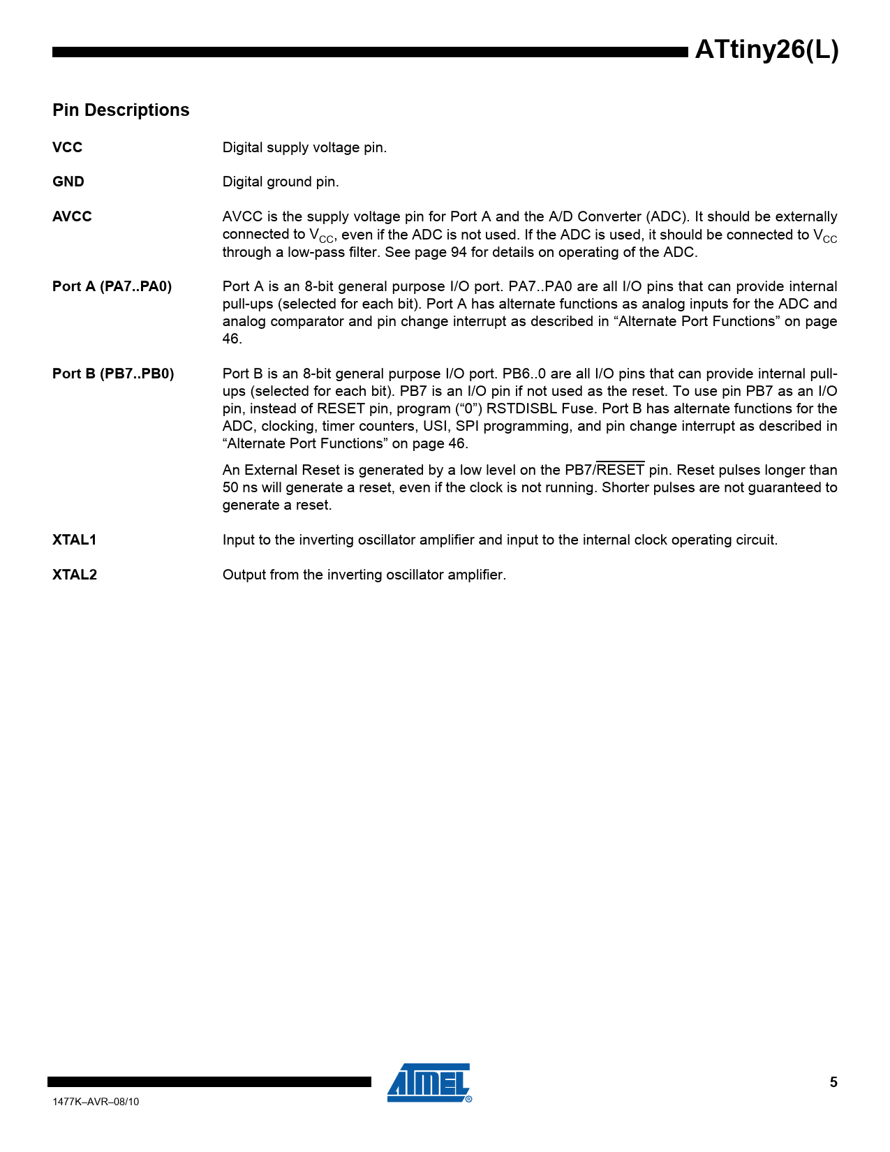 页数 / 页182 / 5 — ATtiny26(L). Pin Descriptions. VCC. GND. AVCC. Port A (PA7..PA0). Port B …