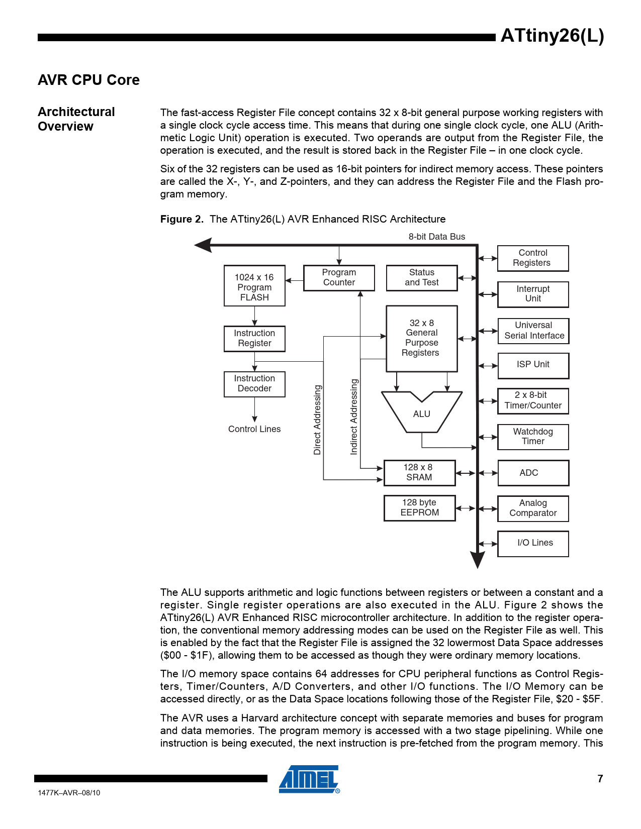 ATtiny26(L)AVR CPU CoreArchitectural The fast-access Register File concept contains 32 x 8-bit general purpose working registers with Overview a single clock cycle access time. This means that during one single clock cycle, one ALU (Arith- metic Logic Unit) operation is executed. Two operands are output from the Register File, the operation is executed, and the result is stored back in the Register File – in one clock cycle. Six of the 32 registers can be used as 16-bit pointers for indirect memory access. These pointers are called the X-, Y-, and Z-pointers, and they can address the Register File and the Flash pro- gram memory. Figure 2. The ATtiny26(L) AVR Enhanced RISC Architecture 8-bit Data Bus Control Registers Program Status 1024 x 16 Counter and Test Program Interrupt FLASH Unit 32 x 8 Universal Instruction General Serial Interface Register Purpose Registers ISP Unit Instruction Decoder 2 x 8-bit Timer/Counter ALU Control Lines Watchdog Timer Direct Addressing Indirect Addressing 128 x 8 ADC SRAM 128 byte Analog EEPROM Comparator I/O Lines The ALU supports arithmetic and logic functions between registers or between a constant and a register. Single register operations are also executed in the ALU. Figure 2 shows the ATtiny26(L) AVR Enhanced RISC microcontroller architecture. In addition to the register opera- tion, the conventional memory addressing modes can be used on the Register File as well. This is enabled by the fact that the Register File is assigned the 32 lowermost Data Space addresses ($00 - $1F), allowing them to be accessed as though they were ordinary memory locations. The I/O memory space contains 64 addresses for CPU peripheral functions as Control Regis- ters, Timer/Counters, A/D Converters, and other I/O functions. The I/O Memory can be accessed directly, or as the Data Space locations following those of the Register File, $20 - $5F. The AVR uses a Harvard architecture concept with separate memories and buses for program and data memories. The program memory is accessed with a two stage pipelining. While one instruction is being executed, the next instruction is pre-fetched from the program memory. This 7 1477K–AVR–08/10 Document Outline Features Pin Configuration Description Block Diagram Pin Descriptions VCC GND AVCC Port A (PA7..PA0) Port B (PB7..PB0) XTAL1 XTAL2 General Information Resources Code Examples AVR CPU Core Architectural Overview General Purpose Register File X-register, Y-register, and Z-register ALU – Arithmetic Logic Unit Status Register – SREG Stack Pointer – SP Program and Data Addressing Modes Register Direct, Single Register Rd Register Direct, Two Registers Rd and Rr I/O Direct Data Direct Data Indirect with Displacement Data Indirect Data Indirect with Pre- decrement Data Indirect with Post-increment Constant Addressing Using the LPM Instruction Indirect Program Addressing, IJMP and ICALL Relative Program Addressing, RJMP and RCALL Memories In-System Programmable Flash Program Memory SRAM Data Memory EEPROM Data Memory EEPROM Read/Write Access EEPROM Address Register – EEAR EEPROM Data Register – EEDR EEPROM Control Register – EECR EEPROM Write During Power-down Sleep Mode Preventing EEPROM Corruption I/O Memory System Clock and Clock Options Clock Systems and their Distribution CPU Clock – clkCPU I/O Clock – clkI/O Flash Clock – clkFLASH ADC Clock – clkADC Internal PLL for Fast Peripheral Clock Generation – clkPCK Clock Sources Default Clock Source Crystal Oscillator Low-frequency Crystal Oscillator External RC Oscillator Calibrated Internal RC Oscillator Oscillator Calibration Register – OSCCAL External Clock High Frequency PLL Clock – PLLCLK System Control and Reset Power-on Reset External Reset Brown-out Detection Watchdog Reset MCU Status Register – MCUSR Power Management and Sleep Modes MCU Control Register – MCUCR Idle Mode ADC Noise Reduction Mode Power-down Mode Standby Mode Minimizing Power Consumption Analog to Digital Converter Analog Comparator Brown-out Detector Internal Voltage Reference Watchdog Timer Port Pins I/O Ports Introduction Ports as General Digital I/O Configuring the Pin Reading the Pin Value Digital Input Enable and Sleep Modes Unconnected Pins Alternate Port Functions MCU Control Register – MCUCR Alternate Functions of Port A Alternate Functions Of Port B Register Description for I/O Ports Port A Data Register – PORTA Port A Data Direction Register – DDRA Port A Input Pins Address – PINA Port B Data Register – PORTB Port B Data Direction Register – DDRB Port B Input Pins Address – PINB Interrupts Interrupt Vectors Interrupt Handling Interrupt Response Time General Interrupt Mask Register – GIMSK General Interrupt Flag Register – GIFR Timer/Counter Interrupt Mask Register – TIMSK Timer/Counter Interrupt Flag Register – TIFR External Interrupt Pin Change Interrupt Timer/Counters Timer/Counter0 Prescaler Timer/Counter1 Prescaler 8-bit Timer/Counter0 Timer/Counter0 Control Register – TCCR0 Timer/Counter0 – TCNT0 8-bit Timer/Counter1 Timer/Counter1 Control Register A – TCCR1A Timer/Counter1 Control Register B – TCCR1B Timer/Counter1 – TCNT1 Timer/Counter1 Output Compare RegisterA – OCR1A Timer/Counter1 Output Compare RegisterB – OCR1B Timer/Counter1 Output Compare RegisterC – OCR1C PLL Control and Status Register – PLLCSR Timer/Counter1 Initialization for Asynchronous Mode Timer/Counter1 in PWM Mode Watchdog Timer Watchdog Timer Control Register – WDTCR Universal Serial Interface – USI Overview Register Descriptions USI Data Register – USIDR USI Status Register – USISR USI Control Register – USICR Functional Descriptions Three-wire Mode SPI Master Operation Example SPI Slave Operation Example Two-wire Mode Start Condition Detector Alternative USI Usage Half-duplex Asynchronous Data Transfer 4-bit Counter 12-bit Timer/Counter Edge Triggered External Interrupt Software Interrupt Analog Comparator Analog Comparator Control and Status