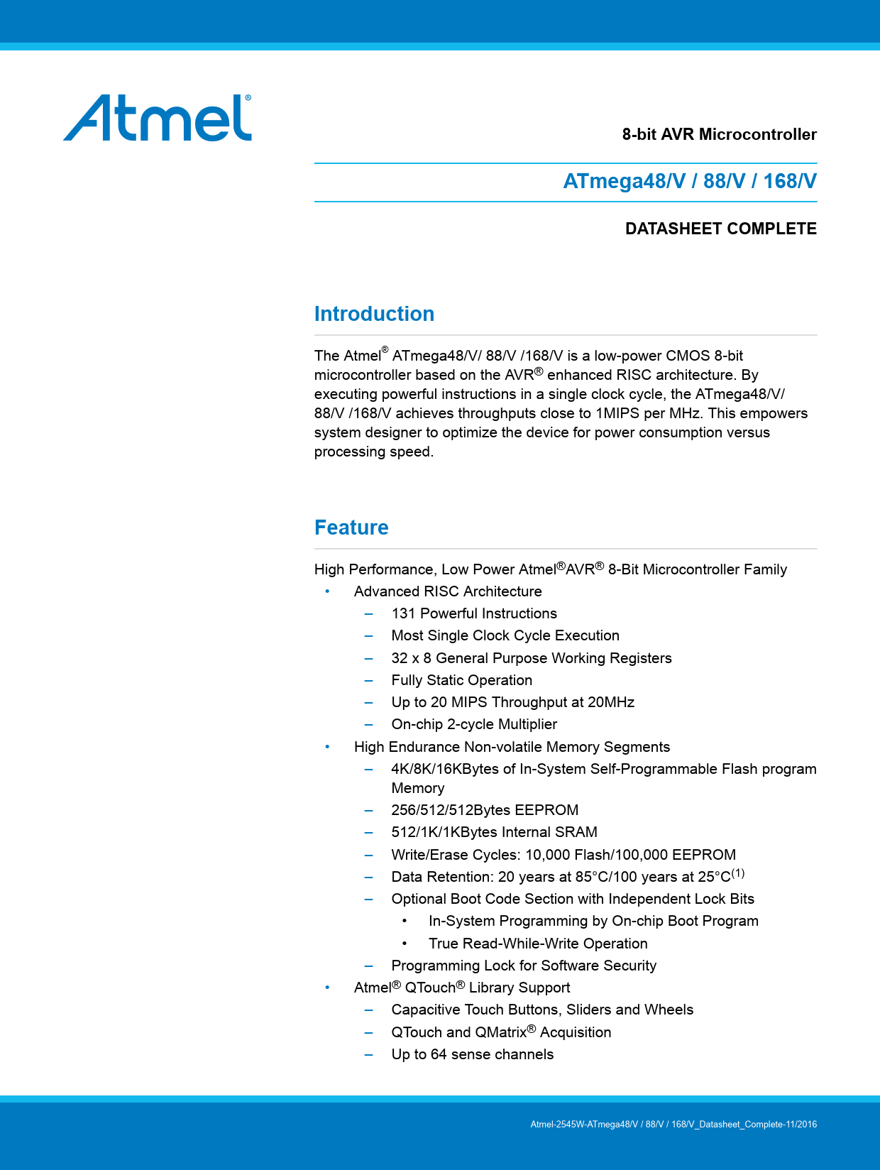 8-bit AVR MicrocontrollerATmega48/V / 88/V / 168/VDATASHEET COMPLETEIntroduction The Atmel® ATmega48/V/ 88/V /168/V is a low-power CMOS 8-bit microcontroller based on the AVR® enhanced RISC architecture. By executing powerful instructions in a single clock cycle, the ATmega48/V/ 88/V /168/V achieves throughputs close to 1MIPS per MHz. This empowers system designer to optimize the device for power consumption versus processing speed. Feature High Performance, Low Power Atmel®AVR® 8-Bit Microcontroller Family • Advanced RISC Architecture – 131 Powerful Instructions – Most Single Clock Cycle Execution – 32 x 8 General Purpose Working Registers – Fully Static Operation – Up to 20 MIPS Throughput at 20MHz – On-chip 2-cycle Multiplier • High Endurance Non-volatile Memory Segments – 4K/8K/16KBytes of In-System Self-Programmable Flash program Memory – 256/512/512Bytes EEPROM – 512/1K/1KBytes Internal SRAM – Write/Erase Cycles: 10,000 Flash/100,000 EEPROM – Data Retention: 20 years at 85°C/100 years at 25°C(1) – Optional Boot Code Section with Independent Lock Bits • In-System Programming by On-chip Boot Program • True Read-While-Write Operation – Programming Lock for Software Security • Atmel® QTouch® Library Support – Capacitive Touch Buttons, Sliders and Wheels – QTouch and QMatrix® Acquisition – Up to 64 sense channels Atmel-2545W-ATmega48/V / 88/V / 168/V_Datasheet_Complete-11/2016 Document Outline Introduction Feature Table of Contents 1. Description 2. Configuration Summary 3. Ordering Information 3.1. ATmega48/V 3.2. ATmega88/V 3.3. ATmega168/V 4. Block Diagram 5. Pin Configurations 5.1. Pin-out 5.2. Pin Descriptions 5.2.1. VCC 5.2.2. GND 5.2.3. Port B (PB[7:0]) XTAL1/XTAL2/TOSC1/TOSC2 5.2.4. Port C (PC[5:0]) 5.2.5. PC6/RESET 5.2.6. Port D (PD[7:0]) 5.2.7. AVCC 5.2.8. AREF 5.2.9. ADC[7:6] (TQFP and VFQFN Package Only) 6. I/O Multiplexing 7. Resources 8. Data Retention 9. About Code Examples 10. Capacitive Touch Sensing 10.1. QTouch Library 11. AVR CPU Core 11.1. Overview 11.2. ALU – Arithmetic Logic Unit 11.3. Status Register 11.3.1. Status Register 11.4. General Purpose Register File 11.4.1. The X-register, Y-register, and Z-register 11.5. Stack Pointer 11.5.1. Stack Pointer Register High byte 11.5.2. Stack Pointer Register Low byte 11.6. Instruction Execution Timing 11.7. Reset and Interrupt Handling 11.7.1. Interrupt Response Time 12. AVR Memories 12.1. Overview 12.2. In-System Reprogrammable Flash Program Memory 12.3. SRAM Data Memory 12.3.1. Data Memory Access Times 12.4. EEPROM Data Memory 12.4.1. EEPROM Read/Write Access 12.4.2. Preventing EEPROM Corruption 12.5. I/O Memory 12.5.1. General Purpose I/O Registers 12.6. Register Description 12.6.1. EEPROM Address Register High 12.6.2. EEPROM Address Register Low 12.6.3. EEPROM Data Register 12.6.4. EEPROM Control Register 12.6.5. GPIOR2 – General Purpose I/O Register 2 12.6.6. GPIOR1 – General Purpose I/O Register 1 12.6.7. GPIOR0 – General Purpose I/O Register 0 13. System Clock and Clock Options 13.1. Clock Systems and Their Distribution 13.1.1. CPU Clock – clkCPU 13.1.2. I/O Clock – clkI/O 13.1.3. Flash Clock – clkFLASH 13.1.4. Asynchronous Timer Clock – clkASY 13.1.5. ADC Clock – clkADC 13.2. Clock Sources 13.2.1. Default Clock Source 13.2.2. Clock Startup Sequence 13.2.3. Clock Source Connections 13.3. Low Power Crystal Oscillator 13.4. Full Swing Crystal Oscillator 13.5. Low Frequency Crystal Oscillator 13.6. Calibrated Internal RC Oscillator 13.7. 128kHz Internal Oscillator 13.8. External Clock 13.9. Timer/Counter Oscillator 13.10. Clock Output Buffer 13.11. System Clock Prescaler 13.12. Register Description 13.12.1. Oscillator Calibration Register 13.12.2. Clock Prescaler Register 14. PM - Power Management and Sleep Modes 14.1. Overview 14.2. Sleep Modes 14.3. Idle Mode 14.4. ADC Noise Reduction Mode 14.5. Power-Down Mode 14.6. Power-save Mode 14.7. Standby Mode 14.8. Extended Standby Mode 14.9. Power Reduction Register 14.10. Minimizing Power Consumption 14.10.1. Analog to Digital Converter 14.10.2. Analog Comparator 14.10.3. Brown-Out Detector 14.10.4. Internal Voltage Reference 14.10.5. Watchdog Timer 14.10.6. Port Pins 14.10.7. On-chip Debug System 14.11. Register Description 14.11.1. Sleep Mode Control Register 14.11.2. MCU Control Register 14.11.3. Power Reduction Register 15. SCRST - System Control and Reset 15.1. Resetting the AVR 15.2. Reset Sources 15.3. Power-on Reset 15.4. External Reset 15.5. Brown-out Detection 15.6. Watchdog System Reset 15.7. Internal Voltage Reference 15.7.1. Voltage Reference Enable Signals and Start-up Time 15.8. Watchdog Timer 15.8.1. Features 15.8.2. Overview 15.9. Register Description 15.9.1. MCU Status Register 15.9.2. WDTCSR – Watchdog Timer Control Register 16. Interrupts 16.1. Interrupt Vectors in ATmega48/V 16.2. Interrupt Vectors in ATmega88/V 16.3. Interrupt Vectors in ATmega168/V 16.4. Register Description 16.4.1. Moving Interrupts Between Application and Boot Space 16.4.2. MCU Control Register 17. EXINT - External Interrupts 17.1. Pin Change Interrupt Timing 17.2. Register Description 17.2.1. External Interrupt Control Register A 17.2.2. External Interrupt Mask Register 17.2.3. External Interrupt Flag Register 17.2.4. Pin Change Interrupt Control Register 17.2.5. Pin Change Interrupt Flag Register 17.2.6. Pin Change Mask Register 2 17.2.7. Pin Change Mask Register 1 17.2.8. Pin Change Mask Register 0 18. I/O-Ports 18.1. Overview 18.2. Ports as General Digital I/O 18.2.1. Configuring the Pin 18.2.2. Toggling the Pin 18.2.3. Switching Between Input and Output 18.2.4. Reading the Pin Value 18.2.5. Digital Input Enable and Sleep Modes 18.2.6. Unconnected Pins 18.3. Alternate Port Functions 18.3.1. Alternate Functions of Port B 18.3.2. Alternate Functions of Port C 18.3.3. Alternate Functions of Port D 18.4. Register Description 18.4.1. MCU Control Register 18.4.2. Port B Data Register 18.4.3. Port B Data Direction