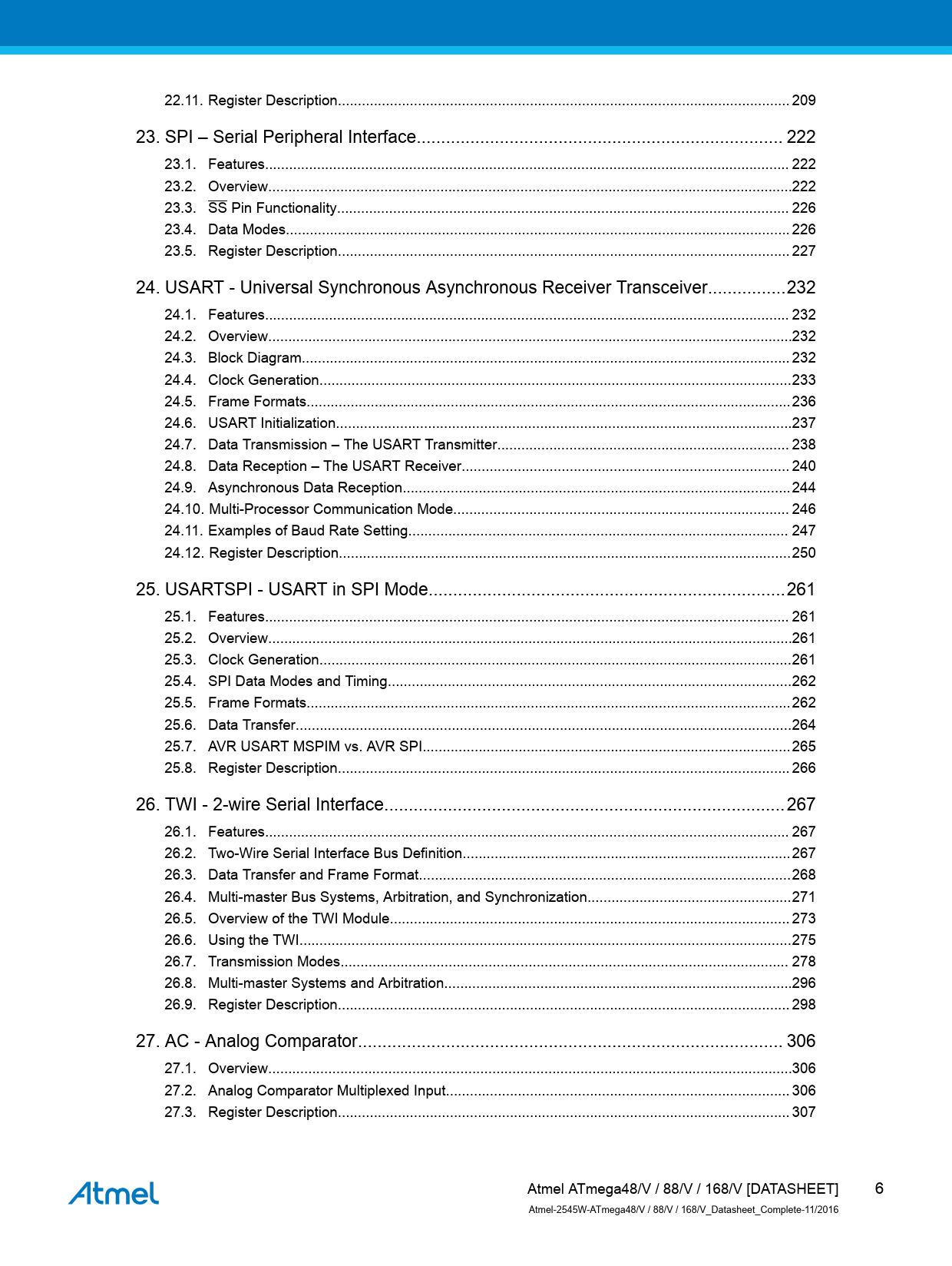 link to page 209 link to page 222 link to page 222 link to page 222 link to page 226 link to page 226 link to page 227 link to page 232 link to page 232 link to page 232 link to page 232 link to page 233 link to page 236 link to page 237 link to page 238 link to page 240 link to page 244 link to page 246 link to page 247 link to page 250 link to page 261 link to page 261 link to page 261 link to page 261 link to page 262 link to page 262 link to page 264 link to page 265 link to page 266 link to page 267 link to page 267 link to page 267 link to page 268 link to page 271 link to page 273 link to page 275 link to page 278 link to page 296 link to page 298 link to page 306 link to page 306 link to page 306 link to page 307 22.11. Register Description... 209 23. SPI – Serial Peripheral Interface... 222 23.1. Features... 222 23.2. Overview...222 23.3. SS Pin Functionality... 226 23.4. Data Modes.. 226 23.5. Register Description... 227 24. USART - Universal Synchronous Asynchronous Receiver Transceiver..232 24.1. Features... 232 24.2. Overview...232 24.3. Block Diagram.. 232 24.4. Clock Generation..233 24.5. Frame Formats...236 24.6. USART Initialization..237 24.7. Data Transmission – The USART Transmitter... 238 24.8. Data Reception – The USART Receiver.. 240 24.9. Asynchronous Data Reception...244 24.10. Multi-Processor Communication Mode.. 246 24.11. Examples of Baud Rate Setting... 247 24.12. Register Description...250 25. USARTSPI - USART in SPI Mode...261 25.1. Features... 261 25.2. Overview...261 25.3. Clock Generation..261 25.4. SPI Data Modes and Timing...262 25.5. Frame Formats...262 25.6. Data Transfer..264 25.7. AVR USART MSPIM vs. AVR SPI..265 25.8. Register Description... 266 26. TWI - 2-wire Serial Interface..267 26.1. Features... 267 26.2. Two-Wire Serial Interface Bus Definition..267 26.3. Data Transfer and Frame Format...268 26.4. Multi-master Bus Systems, Arbitration, and Synchronization...271 26.5. Overview of the TWI Module.. 273 26.6. Using the TWI...275 26.7. Transmission Modes.. 278 26.8. Multi-master Systems and Arbitration...296 26.9. Register Description... 298 27. AC - Analog Comparator... 306 27.1. Overview...306 27.2. Analog Comparator Multiplexed Input.. 306 27.3. Register Description... 307 Atmel ATmega48/V / 88/V / 168/V [DATASHEET] 6 Atmel-2545W-ATmega48/V / 88/V / 168/V_Datasheet_Complete-11/2016 Document Outline Introduction Feature Table of Contents 1. Description 2. Configuration Summary 3. Ordering Information 3.1. ATmega48/V 3.2. ATmega88/V 3.3. ATmega168/V 4. Block Diagram 5. Pin Configurations 5.1. Pin-out 5.2. Pin Descriptions 5.2.1. VCC 5.2.2. GND 5.2.3. Port B (PB[7:0]) XTAL1/XTAL2/TOSC1/TOSC2 5.2.4. Port C (PC[5:0]) 5.2.5. PC6/RESET 5.2.6. Port D (PD[7:0]) 5.2.7. AVCC 5.2.8. AREF 5.2.9. ADC[7:6] (TQFP and VFQFN Package Only) 6. I/O Multiplexing 7. Resources 8. Data Retention 9. About Code Examples 10. Capacitive Touch Sensing 10.1. QTouch Library 11. AVR CPU Core 11.1. Overview 11.2. ALU – Arithmetic Logic Unit 11.3. Status Register 11.3.1. Status Register 11.4. General Purpose Register File 11.4.1. The X-register, Y-register, and Z-register 11.5. Stack Pointer 11.5.1. Stack Pointer Register High byte 11.5.2. Stack Pointer Register Low byte 11.6. Instruction Execution Timing 11.7. Reset and Interrupt Handling 11.7.1. Interrupt Response Time 12. AVR Memories 12.1. Overview 12.2. In-System Reprogrammable Flash Program Memory 12.3. SRAM Data Memory 12.3.1. Data Memory Access Times 12.4. EEPROM Data Memory 12.4.1. EEPROM Read/Write Access 12.4.2. Preventing EEPROM Corruption 12.5. I/O Memory 12.5.1. General Purpose I/O Registers 12.6. Register Description 12.6.1. EEPROM Address Register High 12.6.2. EEPROM Address Register Low 12.6.3. EEPROM Data Register 12.6.4. EEPROM Control Register 12.6.5. GPIOR2 – General Purpose I/O Register 2 12.6.6. GPIOR1 – General Purpose I/O Register 1 12.6.7. GPIOR0 – General Purpose I/O Register 0 13. System Clock and Clock Options 13.1. Clock Systems and Their Distribution 13.1.1. CPU Clock – clkCPU 13.1.2. I/O Clock – clkI/O 13.1.3. Flash Clock – clkFLASH 13.1.4. Asynchronous Timer Clock – clkASY 13.1.5. ADC Clock – clkADC 13.2. Clock Sources 13.2.1. Default Clock Source 13.2.2. Clock Startup Sequence 13.2.3. Clock Source Connections 13.3. Low Power Crystal Oscillator 13.4. Full Swing Crystal Oscillator 13.5. Low Frequency Crystal Oscillator 13.6. Calibrated Internal RC Oscillator 13.7. 128kHz Internal Oscillator 13.8. External Clock 13.9. Timer/Counter Oscillator 13.10. Clock Output Buffer 13.11. System Clock Prescaler 13.12. Register Description 13.12.1. Oscillator Calibration Register 13.12.2. Clock Prescaler Register 14. PM - Power Management and Sleep Modes 14.1. Overview 14.2. Sleep Modes 14.3. Idle Mode 14.4. ADC Noise Reduction Mode 14.5. Power-Down Mode 14.6. Power-save Mode 14.7. Standby Mode 14.8. Extended Standby Mode 14.9. Power Reduction Register 14.10. Minimizing Power Consumption 14.10.1. Analog to Digital Converter 14.10.2. Analog Comparator 14.10.3. Brown-Out Detector 14.10.4. Internal Voltage Reference 14.10.5. Watchdog Timer 14.10.6. Port Pins 14.10.7. On-chip Debug System 14.11. Register Description 14.11.1. Sleep Mode Control Register 14.11.2. MCU Control Register 14.11.3. Power Reduction Register 15. SCRST - System Control and Reset 15.1. Resetting the AVR 15.2. Reset Sources 15.3. Power-on Reset 15.4. External Reset 15.5. Brown-out Detection 15.6. Watchdog System Reset 15.7. Internal Voltage Reference 15.7.1. Voltage Reference Enable Signals and Start-up Time 15.8. Watchdog Timer 15.8.1. Features 15.8.2. Overview 15.9. Register Description 15.9.1. MCU Status Register 15.9.2. WDTCSR – Watchdog Timer Control Register 16. Interrupts 16.1. Interrupt Vectors in ATmega48/V 16.2. Interrupt Vectors in ATmega88/V 16.3. Interrupt Vectors in ATmega168/V 16.4. Register Description 16.4.1. Moving Interrupts Between Application and Boot Space 16.4.2. MCU Control Register 17. EXINT - 