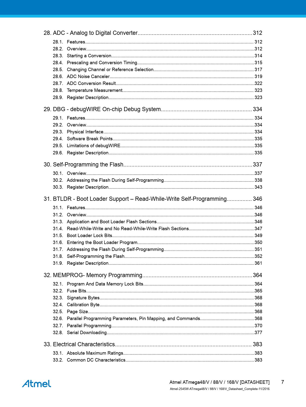 link to page 312 link to page 312 link to page 312 link to page 314 link to page 315 link to page 317 link to page 319 link to page 322 link to page 323 link to page 323 link to page 334 link to page 334 link to page 334 link to page 334 link to page 335 link to page 335 link to page 335 link to page 337 link to page 337 link to page 338 link to page 343 link to page 346 link to page 346 link to page 346 link to page 346 link to page 347 link to page 349 link to page 350 link to page 351 link to page 352 link to page 361 link to page 364 link to page 364 link to page 365 link to page 368 link to page 368 link to page 368 link to page 368 link to page 370 link to page 377 link to page 383 link to page 383 link to page 383 28. ADC - Analog to Digital Converter...312 28.1. Features... 312 28.2. Overview...312 28.3. Starting a Conversion...314 28.4. Prescaling and Conversion Timing...315 28.5. Changing Channel or Reference Selection.. 317 28.6. ADC Noise Canceler.. 319 28.7. ADC Conversion Result..322 28.8. Temperature Measurement.. 323 28.9. Register Description... 323 29. DBG - debugWIRE On-chip Debug System.. 334 29.1. Features... 334 29.2. Overview...334 29.3. Physical Interface... 334 29.4. Software Break Points..335 29.5. Limitations of debugWIRE..335 29.6. Register Description... 335 30. Self-Programming the Flash..337 30.1. Overview...337 30.2. Addressing the Flash During Self-Programming.. 338 30.3. Register Description... 343 31. BTLDR - Boot Loader Support – Read-While-Write Self-Programming.. 346 31.1. Features... 346 31.2. Overview...346 31.3. Application and Boot Loader Flash Sections..346 31.4. Read-While-Write and No Read-While-Write Flash Sections...347 31.5. Boot Loader Lock Bits.. 349 31.6. Entering the Boot Loader Program...350 31.7. Addressing the Flash During Self-Programming.. 351 31.8. Self-Programming the Flash...352 31.9. Register Description... 361 32. MEMPROG- Memory Programming..364 32.1. Program And Data Memory Lock Bits.. 364 32.2. Fuse Bits...365 32.3. Signature Bytes.. 368 32.4. Calibration Byte.. 368 32.5. Page Size... 368 32.6. Parallel Programming Parameters, Pin Mapping, and Commands..368 32.7. Parallel Programming...370 32.8. Serial Downloading...377 33. Electrical Characteristics... 383 33.1. Absolute Maximum Ratings..383 33.2. Common DC Characteristics..383 Atmel ATmega48/V / 88/V / 168/V [DATASHEET] 7 Atmel-2545W-ATmega48/V / 88/V / 168/V_Datasheet_Complete-11/2016 Document Outline Introduction Feature Table of Contents 1. Description 2. Configuration Summary 3. Ordering Information 3.1. ATmega48/V 3.2. ATmega88/V 3.3. ATmega168/V 4. Block Diagram 5. Pin Configurations 5.1. Pin-out 5.2. Pin Descriptions 5.2.1. VCC 5.2.2. GND 5.2.3. Port B (PB[7:0]) XTAL1/XTAL2/TOSC1/TOSC2 5.2.4. Port C (PC[5:0]) 5.2.5. PC6/RESET 5.2.6. Port D (PD[7:0]) 5.2.7. AVCC 5.2.8. AREF 5.2.9. ADC[7:6] (TQFP and VFQFN Package Only) 6. I/O Multiplexing 7. Resources 8. Data Retention 9. About Code Examples 10. Capacitive Touch Sensing 10.1. QTouch Library 11. AVR CPU Core 11.1. Overview 11.2. ALU – Arithmetic Logic Unit 11.3. Status Register 11.3.1. Status Register 11.4. General Purpose Register File 11.4.1. The X-register, Y-register, and Z-register 11.5. Stack Pointer 11.5.1. Stack Pointer Register High byte 11.5.2. Stack Pointer Register Low byte 11.6. Instruction Execution Timing 11.7. Reset and Interrupt Handling 11.7.1. Interrupt Response Time 12. AVR Memories 12.1. Overview 12.2. In-System Reprogrammable Flash Program Memory 12.3. SRAM Data Memory 12.3.1. Data Memory Access Times 12.4. EEPROM Data Memory 12.4.1. EEPROM Read/Write Access 12.4.2. Preventing EEPROM Corruption 12.5. I/O Memory 12.5.1. General Purpose I/O Registers 12.6. Register Description 12.6.1. EEPROM Address Register High 12.6.2. EEPROM Address Register Low 12.6.3. EEPROM Data Register 12.6.4. EEPROM Control Register 12.6.5. GPIOR2 – General Purpose I/O Register 2 12.6.6. GPIOR1 – General Purpose I/O Register 1 12.6.7. GPIOR0 – General Purpose I/O Register 0 13. System Clock and Clock Options 13.1. Clock Systems and Their Distribution 13.1.1. CPU Clock – clkCPU 13.1.2. I/O Clock – clkI/O 13.1.3. Flash Clock – clkFLASH 13.1.4. Asynchronous Timer Clock – clkASY 13.1.5. ADC Clock – clkADC 13.2. Clock Sources 13.2.1. Default Clock Source 13.2.2. Clock Startup Sequence 13.2.3. Clock Source Connections 13.3. Low Power Crystal Oscillator 13.4. Full Swing Crystal Oscillator 13.5. Low Frequency Crystal Oscillator 13.6. Calibrated Internal RC Oscillator 13.7. 128kHz Internal Oscillator 13.8. External Clock 13.9. Timer/Counter Oscillator 13.10. Clock Output Buffer 13.11. System Clock Prescaler 13.12. Register Description 13.12.1. Oscillator Calibration Register 13.12.2. Clock Prescaler Register 14. PM - Power Management and Sleep Modes 14.1. Overview 14.2. Sleep Modes 14.3. Idle Mode 14.4. ADC Noise Reduction Mode 14.5. Power-Down Mode 14.6. Power-save Mode 14.7. Standby Mode 14.8. Extended Standby Mode 14.9. Power Reduction Register 14.10. Minimizing Power Consumption 14.10.1. Analog to Digital Converter 14.10.2. Analog Comparator 14.10.3. Brown-Out Detector 14.10.4. Internal Voltage Reference 14.10.5. Watchdog Timer 14.10.6. Port Pins 14.10.7. On-chip Debug System 14.11. Register Description 14.11.1. Sleep Mode Control Register 14.11.2. MCU Control Register 14.11.3. Power Reduction Register 15. SCRST - System Control and Reset 15.1. Resetting the AVR 15.2. Reset Sources 15.3. Power-on Reset 15.4. External Reset 15.5. Brown-out Detection 15.6. Watchdog System Reset 15.7. Internal Voltage Reference 15.7.1. Voltage Reference Enable Signals and Start-up Time 15.8. Watchdog Timer 15.8.1. Features 15.8.2. Overview 15.9. Register Description 15.9.1. MCU Status Register 15.9.2. WDTCSR – Watchdog Timer Control Register 16. Interrupts 16.1. Interrupt Vectors in ATmega48/V 16.2. Interrupt Vectors in ATmega88/V 16.3. Interrupt Vectors in ATmega168/V 16.4. Register Description 16.4.1. Moving Interrupts Bet