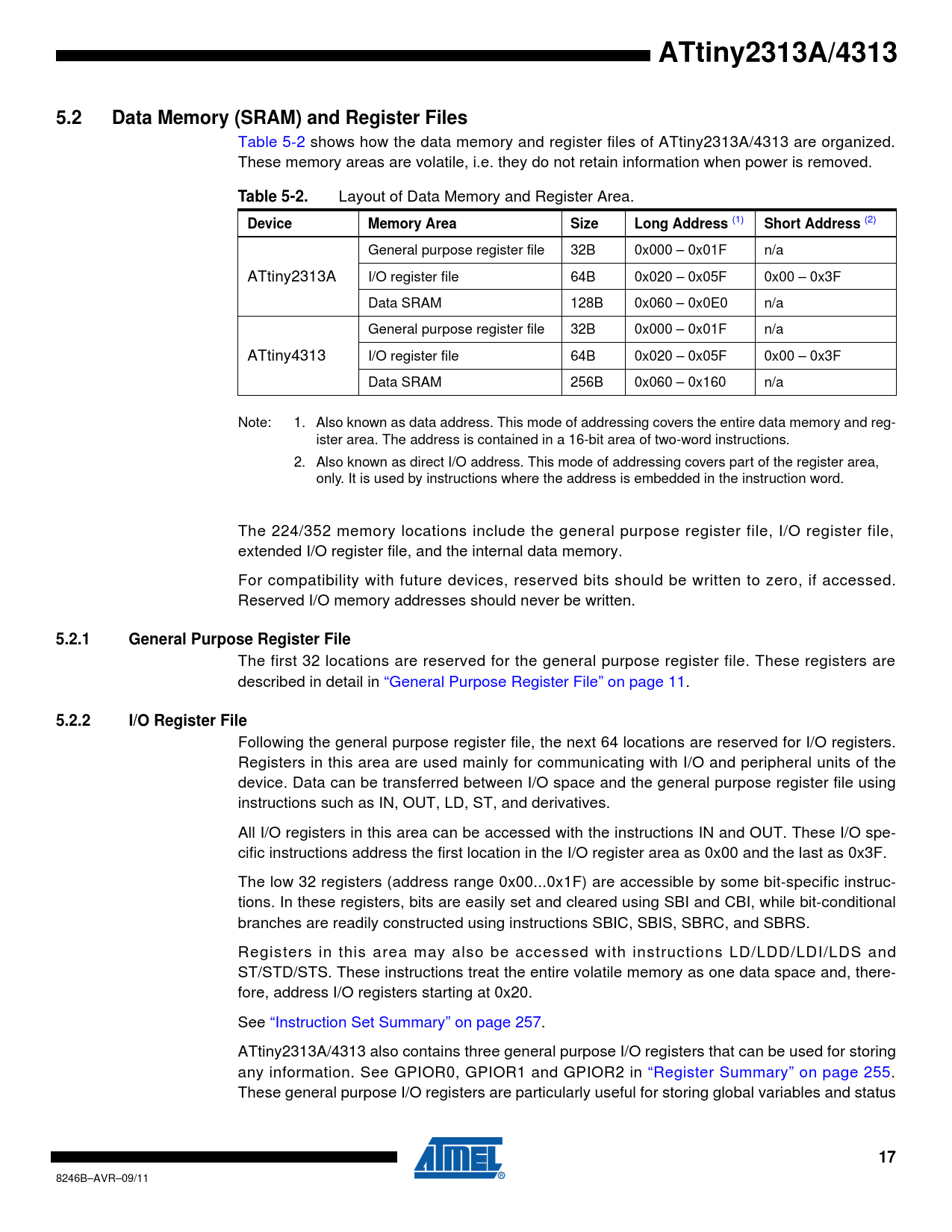 ATtiny2313A/4313. 5.2. Data Memory (SRAM) and Register Files. Table 5-2. Device. Memory Area. Size. Long Address. Short Address. 5.2.1