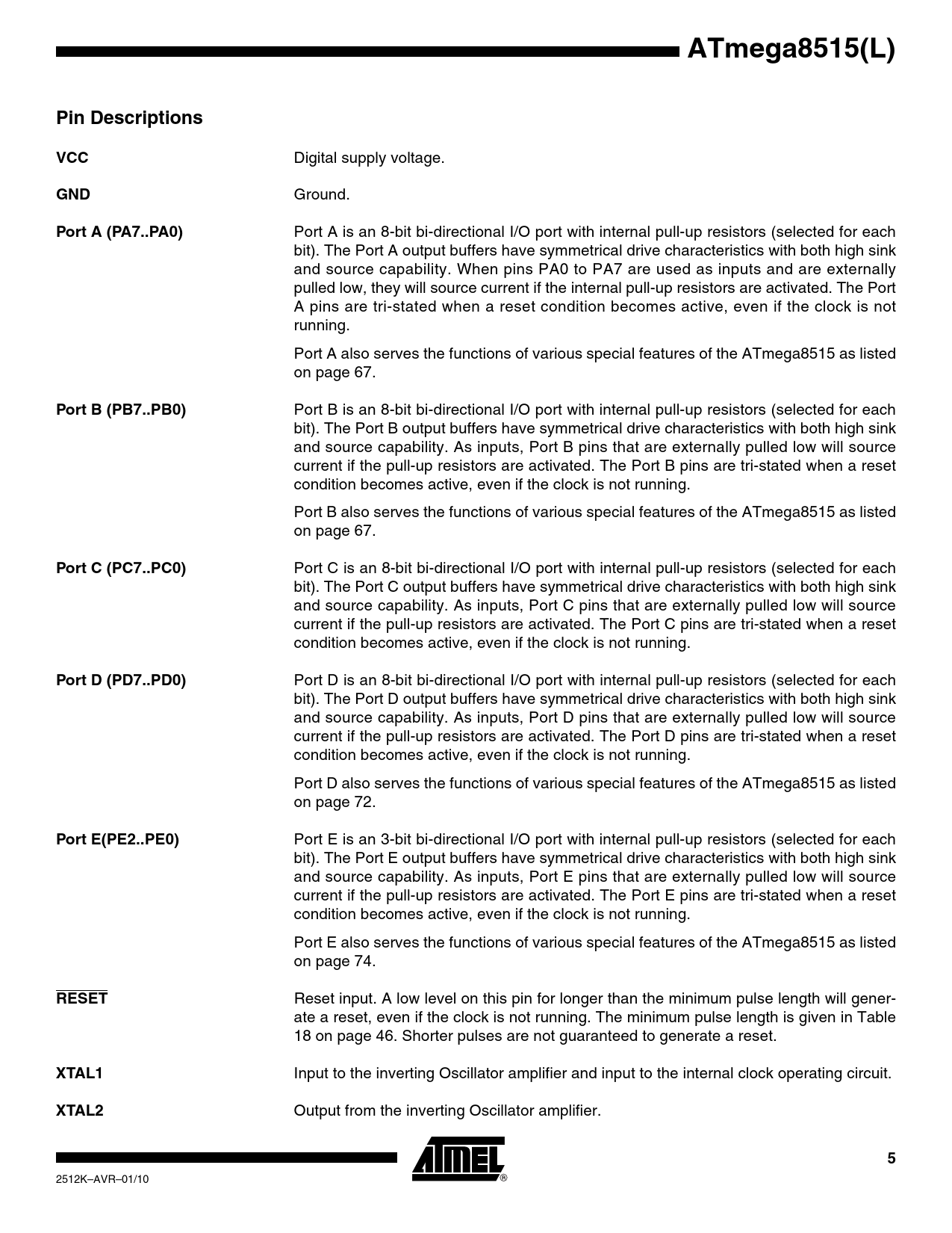 link to page 67 link to page 67 link to page 72 link to page 74 ATmega8515(L)Pin DescriptionsVCC Digital supply voltage. GND Ground. Port A (PA7..PA0) Port A is an 8-bit bi-directional I/O port with internal pull-up resistors (selected for each bit). The Port A output buffers have symmetrical drive characteristics with both high sink and source capability. When pins PA0 to PA7 are used as inputs and are externally pulled low, they will source current if the internal pull-up resistors are activated. The Port A pins are tri-stated when a reset condition becomes active, even if the clock is not running. Port A also serves the functions of various special features of the ATmega8515 as listed on page 67. Port B (PB7..PB0) Port B is an 8-bit bi-directional I/O port with internal pull-up resistors (selected for each bit). The Port B output buffers have symmetrical drive characteristics with both high sink and source capability. As inputs, Port B pins that are externally pulled low will source current if the pull-up resistors are activated. The Port B pins are tri-stated when a reset condition becomes active, even if the clock is not running. Port B also serves the functions of various special features of the ATmega8515 as listed on page 67. Port C (PC7..PC0) Port C is an 8-bit bi-directional I/O port with internal pull-up resistors (selected for each bit). The Port C output buffers have symmetrical drive characteristics with both high sink and source capability. As inputs, Port C pins that are externally pulled low will source current if the pull-up resistors are activated. The Port C pins are tri-stated when a reset condition becomes active, even if the clock is not running. Port D (PD7..PD0) Port D is an 8-bit bi-directional I/O port with internal pull-up resistors (selected for each bit). The Port D output buffers have symmetrical drive characteristics with both high sink and source capability. As inputs, Port D pins that are externally pulled low will source current if the pull-up resistors are activated. The Port D pins are tri-stated when a reset condition becomes active, even if the clock is not running. Port D also serves the functions of various special features of the ATmega8515 as listed on page 72. Port E(PE2..PE0) Port E is an 3-bit bi-directional I/O port with internal pull-up resistors (selected for each bit). The Port E output buffers have symmetrical drive characteristics with both high sink and source capability. As inputs, Port E pins that are externally pulled low will source current if the pull-up resistors are activated. The Port E pins are tri-stated when a reset condition becomes active, even if the clock is not running. Port E also serves the functions of various special features of the ATmega8515 as listed on page 74. RESET Reset input. A low level on this pin for longer than the minimum pulse length will gener- ate a reset, even if the clock is not running. The minimum pulse length is given in Table 18 on page 46. Shorter pulses are not guaranteed to generate a reset. XTAL1 Input to the inverting Oscillator amplifier and input to the internal clock operating circuit. XTAL2 Output from the inverting Oscillator amplifier. 5 2512K–AVR–01/10 Document Outline Features Pin Configurations Overview Block Diagram Disclaimer AT90S4414/8515 and ATmega8515 Compatibility AT90S4414/8515 Compatibility Mode Pin Descriptions VCC GND Port A (PA7..PA0) Port B (PB7..PB0) Port C (PC7..PC0) Port D (PD7..PD0) Port E(PE2..PE0) RESET XTAL1 XTAL2 Resources About Code Examples AVR CPU Core Introduction Architectural Overview ALU – Arithmetic Logic Unit Status Register General Purpose Register File The X-register, Y-register, and Z-register Stack Pointer Instruction Execution Timing Reset and Interrupt Handling Interrupt Response Time AVR ATmega8515 Memories In-System Reprogrammable Flash Program memory SRAM Data Memory Data Memory Access Times EEPROM Data Memory EEPROM Read/Write Access The EEPROM Address Register – EEARH and EEARL The EEPROM Data Register – EEDR The EEPROM Control Register – EECR EEPROM Write During Power- down Sleep Mode Preventing EEPROM Corruption I/O Memory External Memory Interface Overview Using the External Memory Interface Address Latch Requirements Pull-up and Bus Keeper Timing XMEM Register Description MCU Control Register – MCUCR Extended MCU Control Register – EMCUCR Special Function IO Register – SFIOR Using all Locations of External Memory Smaller than 64 KB Using all 64KB Locations of External Memory System Clock and Clock Options Clock Systems and their Distribution CPU Clock – clkCPU I/O Clock – clkI/O Flash Clock – clkFLASH Clock Sources Default Clock Source Crystal Oscillator Low-frequency Crystal Oscillator External RC Oscillator Calibrated Internal RC Oscillator Oscillator Calibration Register – OSCCAL External Clock Power Management and Sleep Modes MCU Control Register – MCUCR MCU Control and Status Register – MCUCSR Extended MCU Control Register – EMCUCR Idle Mode Power-down Mode Standby Mode Minimizing Power Consumption Analog Comparator Brown-out Detector Internal Voltage Reference Watchdog Timer Port Pins System Control and Reset Resetting the AVR Reset Sources Power-on Reset External Reset Brown-out Detection Watchdog Reset MCU Control and Status Register – MCUCSR Internal Voltage Reference Voltage Reference Enable Signals and Start-up Time Watchdog Timer Watchdog Timer Control Register – WDTCR Timed Sequences for Changing the Configuration of the Watchdog Timer Safety Level 0 Safety Level 1 Safety Level 2 Interrupts Interrupt Vectors in ATmega8515 Moving Interrupts between Application and Boot Space General Interrupt Control Register – GICR I/O Ports Introduction Ports as General Digital I/O Configuring the Pin Reading the Pin Value Digital Input Enable and Sleep Modes Unconnected pins Alternate Port Functions Special Function IO Register – SFIOR Alternate Functions of Port A Alternate Functions Of Port B Alte