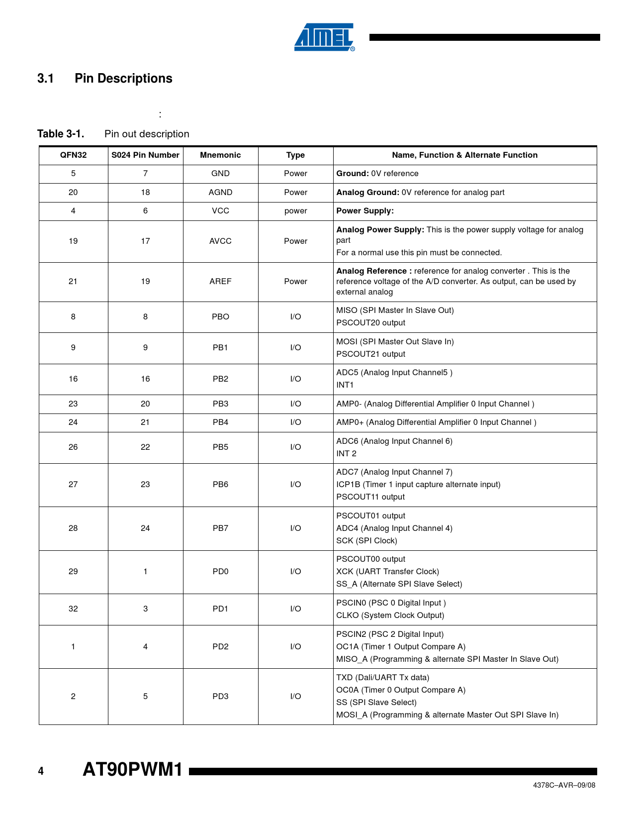 3.1. Pin Descriptions. Table 3-1. QFN32. S024 Pin Number. Mnemonic. Type. Name, Function & Alternate Function. Ground: