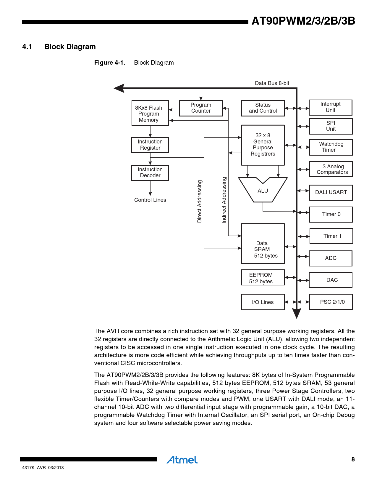 AT90PWM2/3/2B/3B4.1Block DiagramFigure 4-1. Block Diagram Data Bus 8-bit Program Status Interrupt 8Kx8 Flash Counter and Control Unit Program Memory SPI Unit 32 x 8 Instruction General Watchdog Register Purpose Timer Registrers 3 Analog Instruction Comparators Decoder ALU DALI USART Control Lines Timer 0 Direct Addressing Indirect Addressing Timer 1 Data SRAM 512 bytes ADC EEPROM 512 bytes DAC I/O Lines PSC 2/1/0 The AVR core combines a rich instruction set with 32 general purpose working registers. All the 32 registers are directly connected to the Arithmetic Logic Unit (ALU), allowing two independent registers to be accessed in one single instruction executed in one clock cycle. The resulting architecture is more code efficient while achieving throughputs up to ten times faster than con- ventional CISC microcontrollers. The AT90PWM2/2B/3/3B provides the following features: 8K bytes of In-System Programmable Flash with Read-While-Write capabilities, 512 bytes EEPROM, 512 bytes SRAM, 53 general purpose I/O lines, 32 general purpose working registers, three Power Stage Controllers, two flexible Timer/Counters with compare modes and PWM, one USART with DALI mode, an 11- channel 10-bit ADC with two differential input stage with programmable gain, a 10-bit DAC, a programmable Watchdog Timer with Internal Oscillator, an SPI serial port, an On-chip Debug system and four software selectable power saving modes. 8 4317K–AVR–03/2013 Document Outline Features 1. History 2. Disclaimer 3. Pin Configurations 3.1 Pin Descriptions 4. Overview 4.1 Block Diagram 4.2 Pin Descriptions 4.2.1 VCC 4.2.2 GND 4.2.3 Port B (PB7..PB0) 4.2.4 Port C (PC7..PC0) 4.2.5 Port D (PD7..PD0) 4.2.6 Port E (PE2..0) RESET/ XTAL1/ XTAL2 4.2.7 AVCC 4.2.8 AREF 4.3 About Code Examples 5. AVR CPU Core 5.1 Introduction 5.2 Architectural Overview 5.3 ALU – Arithmetic Logic Unit 5.4 Status Register 5.5 General Purpose Register File 5.5.1 The X-register, Y-register, and Z-register 5.6 Stack Pointer 5.7 Instruction Execution Timing 5.8 Reset and Interrupt Handling 5.8.1 Interrupt Behavior 5.8.2 Interrupt Response Time 6. Memories 6.1 In-System Reprogrammable Flash Program Memory 6.2 SRAM Data Memory 6.2.1 SRAM Data Access Times 6.3 EEPROM Data Memory 6.3.1 EEPROM Read/Write Access 6.3.2 The EEPROM Address Registers – EEARH and EEARL 6.3.3 The EEPROM Data Register – EEDR 6.3.4 The EEPROM Control Register – EECR 6.3.5 Preventing EEPROM Corruption 6.4 I/O Memory 6.5 General Purpose I/O Registers 6.5.1 General Purpose I/O Register 0 – GPIOR0 6.5.2 General Purpose I/O Register 1 – GPIOR1 6.5.3 General Purpose I/O Register 2 – GPIOR2 6.5.4 General Purpose I/O Register 3– GPIOR3 7. System Clock 7.1 Clock Systems and their Distribution 7.1.1 CPU Clock – clkCPU 7.1.2 I/O Clock – clkI/O 7.1.3 Flash Clock – clkFLASH 7.1.4 PLL Clock – clkPLL 7.1.5 ADC Clock – clkADC 7.2 Clock Sources 7.3 Default Clock Source 7.4 Low Power Crystal Oscillator 7.5 Calibrated Internal RC Oscillator 7.6 PLL 7.6.1 Internal PLL for PSC 7.6.2 PLL Control and Status Register – PLLCSR 7.7 128 kHz Internal Oscillator 7.8 External Clock 7.9 Clock Output Buffer 7.10 System Clock Prescaler 7.10.1 Clock Prescaler Register – CLKPR 8. Power Management and Sleep Modes 8.1 Sleep Mode Control Register – SMCR 8.2 Idle Mode 8.3 ADC Noise Reduction Mode 8.4 Power-down Mode 8.5 Standby Mode 8.6 Power Reduction Register 8.6.1 Power Reduction Register - PRR 8.7 Minimizing Power Consumption 8.7.1 Analog to Digital Converter 8.7.2 Analog Comparator 8.7.3 Brown-out Detector 8.7.4 Internal Voltage Reference 8.7.5 Watchdog Timer 8.7.6 Port Pins 8.7.7 On-chip Debug System 9. System Control and Reset 9.0.1 Resetting the AVR 9.0.2 Reset Sources 9.0.3 Power-on Reset 9.0.4 External Reset 9.0.5 Brown-out Detection 9.0.6 Watchdog Reset 9.0.7 MCU Status Register – MCUSR 9.1 Internal Voltage Reference 9.1.1 Voltage Reference Enable Signals and Start-up Time 9.1.2 Voltage Reference Characteristics 9.2 Watchdog Timer 9.2.1 Watchdog Timer Control Register - WDTCSR 10. Interrupts 10.1 Interrupt Vectors in AT90PWM2/2B/3/3B 10.1.1 Moving Interrupts Between Application and Boot Space 10.1.2 MCU Control Register – MCUCR 11. I/O-Ports 11.1 Introduction 11.2 Ports as General Digital I/O 11.2.1 Configuring the Pin 11.2.2 Toggling the Pin 11.2.3 Switching Between Input and Output 11.2.4 Reading the Pin Value 11.2.5 Digital Input Enable and Sleep Modes 11.3 Alternate Port Functions 11.3.1 MCU Control Register – MCUCR 11.3.2 Alternate Functions of Port B 11.3.3 Alternate Functions of Port C 11.3.4 Alternate Functions of Port D 11.3.5 Alternate Functions of Port E 11.4 Register Description for I/O-Ports 11.4.1 Port B Data Register – PORTB 11.4.2 Port B Data Direction Register – DDRB 11.4.3 Port B Input Pins Address – PINB 11.4.4 Port C Data Register – PORTC 11.4.5 Port C Data Direction Register – DDRC 11.4.6 Port C Input Pins Address – PINC 11.4.7 Port D Data Register – PORTD 11.4.8 Port D Data Direction Register – DDRD 11.4.9 Port D Input Pins Address – PIND 11.4.10 Port E Data Register – PORTE 11.4.11 Port E Data Direction Register – DDRE 11.4.12 Port E Input Pins Address – PINE 12. External Interrupts 12.0.1 External Interrupt Control Register A – EICRA 12.0.2 External Interrupt Mask Register – EIMSK 12.0.3 External Interrupt Flag Register – EIFR 13. Timer/Counter0 and Timer/Counter1 Prescalers 13.1 Internal Clock Source 13.2 Prescaler Reset 13.3 External Clock Source 13.4 General Timer/Counter Control Register – GTCCR 14. 8-bit Timer/Counter0 with PWM 14.1 Overview 14.1.1 Definitions 14.1.2 Registers 14.2 Timer/Counter Clock Sources 14.3 Counter Unit 14.4 Output Compare Unit 14.4.1 Force Output Compare 14.4.2 Compare Match Blocking by TCNT0 Write 14.4.3 Using the Output Compare Unit 14.5 Compare Match Output Unit 14.5.1 Compare Output Mode and Waveform Generation 14.6 Modes of Operation 14.6.1 Normal Mode 14.6.2 Clear Timer on Compare Match (