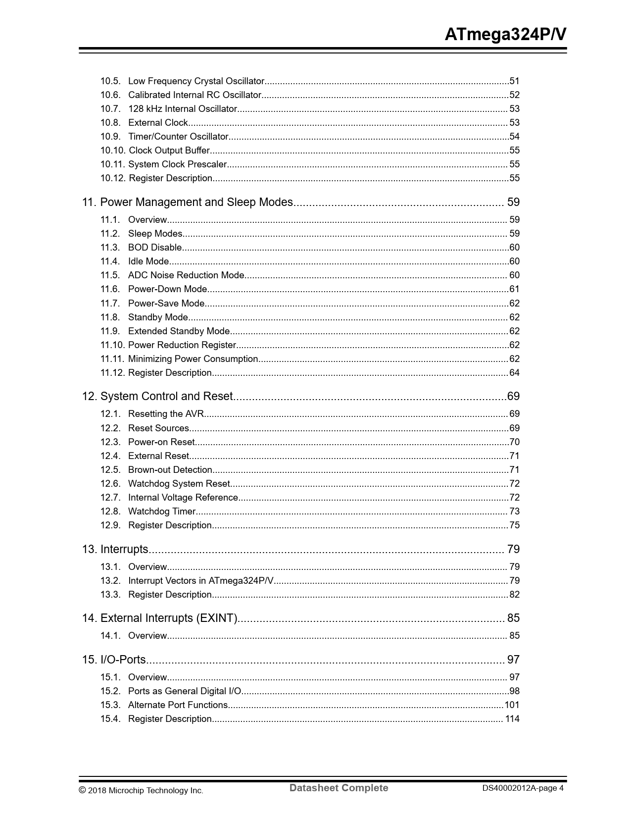 10.5. Low Frequency Crystal Oscillator...51 10.6. Calibrated Internal RC Oscillator..52 10.7. 128 kHz Internal Oscillator... 53 10.8. External Clock.. 53 10.9. Timer/Counter Oscillator...54 10.10. Clock Output Buffer..55 10.11. System Clock Prescaler... 55 10.12. Register Description...55 11. Power Management and Sleep Modes... 59 11.1. Overview.. 59 11.2. Sleep Modes.. 59 11.3. BOD Disable...60 11.4. Idle Mode..60 11.5. ADC Noise Reduction Mode.. 60 11.6. Power-Down Mode...61 11.7. Power-Save Mode..62 11.8. Standby Mode.. 62 11.9. Extended Standby Mode.. 62 11.10. Power Reduction Register..62 11.11. Minimizing Power Consumption... 62 11.12. Register Description... 64 12. System Control and Reset...69 12.1. Resetting the AVR.. 69 12.2. Reset Sources..69 12.3. Power-on Reset..70 12.4. External Reset..71 12.5. Brown-out Detection...71 12.6. Watchdog System Reset..72 12.7. Internal Voltage Reference...72 12.8. Watchdog Timer... 73 12.9. Register Description... 75 13. Interrupts... 79 13.1. Overview.. 79 13.2. Interrupt Vectors in ATmega324P/V... 79 13.3. Register Description... 82 14. External Interrupts (EXINT)... 85 14.1. Overview.. 85 15. I/O-Ports.. 97 15.1. Overview.. 97 15.2. Ports as General Digital I/O..98 15.3. Alternate Port Functions...101 15.4. Register Description... 114 © 2018 Microchip Technology Inc.