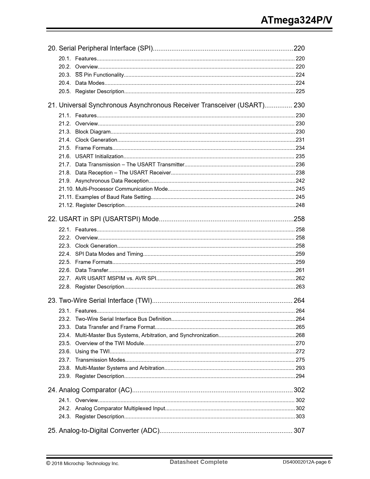20. Serial Peripheral Interface (SPI)..220 20.1. Features... 220 20.2. Overview.. 220 20.3. SS Pin Functionality... 224 20.4. Data Modes.. 224 20.5. Register Description... 225 21. Universal Synchronous Asynchronous Receiver Transceiver (USART)... 230 21.1. Features... 230 21.2. Overview.. 230 21.3. Block Diagram.. 230 21.4. Clock Generation..231 21.5. Frame Formats...234 21.6. USART Initialization... 235 21.7. Data Transmission – The USART Transmitter... 236 21.8. Data Reception – The USART Receiver.. 238 21.9. Asynchronous Data Reception...242 21.10. Multi-Processor Communication Mode.. 245 21.11. Examples of Baud Rate Setting... 245 21.12. Register Description...248 22. USART in SPI (USARTSPI) Mode...258 22.1. Features... 258 22.2. Overview.. 258 22.3. Clock Generation..258 22.4. SPI Data Modes and Timing...259 22.5. Frame Formats...259 22.6. Data Transfer..261 22.7. AVR USART MSPIM vs. AVR SPI..262 22.8. Register Description... 263 23. Two-Wire Serial Interface (TWI).. 264 23.1. Features... 264 23.2. Two-Wire Serial Interface Bus Definition..264 23.3. Data Transfer and Frame Format...265 23.4. Multi-Master Bus Systems, Arbitration, and Synchronization...268 23.5. Overview of the TWI Module.. 270 23.6. Using the TWI...272 23.7. Transmission Modes.. 275 23.8. Multi-Master Systems and Arbitration.. 293 23.9. Register Description... 294 24. Analog Comparator (AC)... 302 24.1. Overview.. 302 24.2. Analog Comparator Multiplexed Input.. 302 24.3. Register Description... 303 25. Analog-to-Digital Converter (ADC).. 307 © 2018 Microchip Technology Inc.