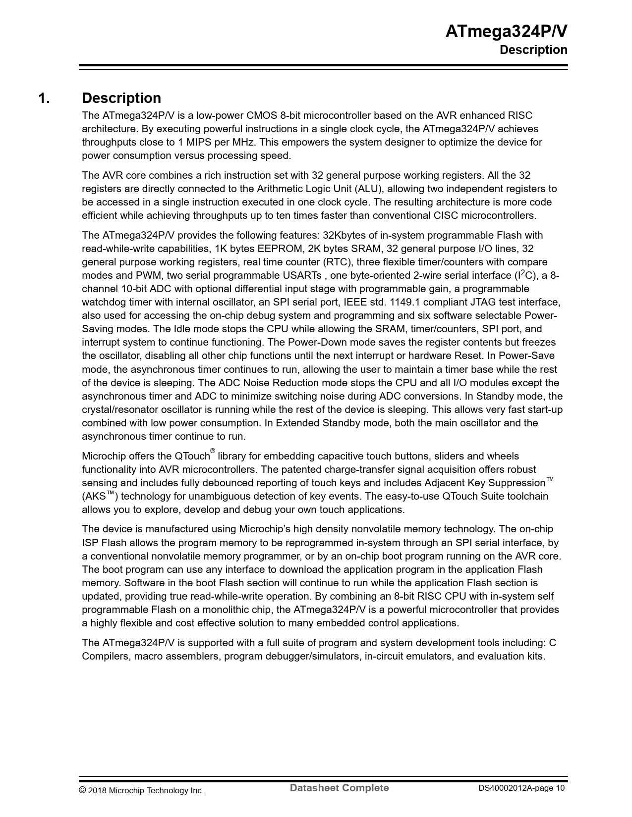 The ATmega324P/V is a low-power CMOS 8-bit microcontroller based on the AVR enhanced RISC architecture. By executing powerful instructions in a single clock cycle, the ATmega324P/V achieves throughputs close to 1 MIPS per MHz. This empowers the system designer to optimize the device for power consumption versus processing speed. The AVR core combines a rich instruction set with 32 general purpose working registers. All the 32 registers are directly connected to the Arithmetic Logic Unit (ALU), allowing two independent registers to be accessed in a single instruction executed in one clock cycle. The resulting architecture is more code efficient while achieving throughputs up to ten times faster than conventional CISC microcontrollers. The ATmega324P/V provides the following features: 32Kbytes of in-system programmable Flash with read-while-write capabilities, 1K bytes EEPROM, 2K bytes SRAM, 32 general purpose I/O lines, 32 general purpose working registers, real time counter (RTC), three flexible timer/counters with compare modes and PWM, two serial programmable USARTs , one byte-oriented 2-wire serial interface (I2C), a 8- channel 10-bit ADC with optional differential input stage with programmable gain, a programmable watchdog timer with internal oscillator, an SPI serial port, IEEE std. 1149.1 compliant JTAG test interface, also used for accessing the on-chip debug system and programming and six software selectable Power- Saving modes. The Idle mode stops the CPU while allowing the SRAM, timer/counters, SPI port, and interrupt system to continue functioning. The Power-Down mode saves the register contents but freezes the oscillator, disabling all other chip functions until the next interrupt or hardware Reset. In Power-Save mode, the asynchronous timer continues to run, allowing the user to maintain a timer base while the rest of the device is sleeping. The ADC Noise Reduction mode stops the CPU and all I/O modules except the asynchronous timer and ADC to minimize switching noise during ADC conversions. In Standby mode, the crystal/resonator oscillator is running while the rest of the device is sleeping. This allows very fast start-up combined with low power consumption. In Extended Standby mode, both the main oscillator and the asynchronous timer continue to run. Microchip offers the QTouch® library for embedding capacitive touch buttons, sliders and wheels functionality into AVR microcontrollers. The patented charge-transfer signal acquisition offers robust sensing and includes fully debounced reporting of touch keys and includes Adjacent Key Suppression™ (AKS™) technology for unambiguous detection of key events. The easy-to-use QTouch Suite toolchain allows you to explore, develop and debug your own touch applications. The device is manufactured using Microchip’s high density nonvolatile memory technology. The on-chip ISP Flash allows the program memory to be reprogrammed in-system through an SPI serial interface, by a conventional nonvolatile memory programmer, or by an on-chip boot program running on the AVR core. The boot program can use any interface to download the application program in the application Flash memory. Software in the boot Flash section will continue to run while the application Flash section is updated, providing true read-while-write operation. By combining an 8-bit RISC CPU with in-system self programmable Flash on a monolithic chip, the ATmega324P/V is a powerful microcontroller that provides a highly flexible and cost effective solution to many embedded control applications. The ATmega324P/V is supported with a full suite of program and system development tools including: C Compilers, macro assemblers, program debugger/simulators, in-circuit emulators, and evaluation kits. © 2018 Microchip Technology Inc.