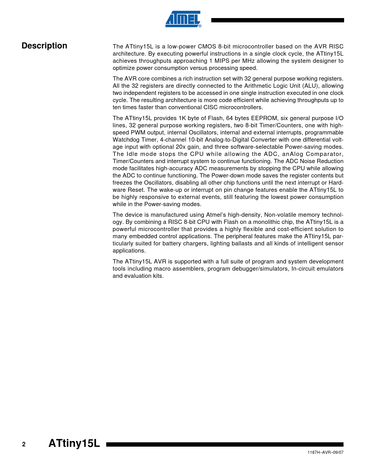 The ATtiny15L is a low-power CMOS 8-bit microcontroller based on the AVR RISC architecture. By executing powerful instructions in a single clock cycle, the ATtiny15L achieves throughputs approaching 1 MIPS per MHz allowing the system designer to optimize power consumption versus processing speed. The AVR core combines a rich instruction set with 32 general purpose working registers. All the 32 registers are directly connected to the Arithmetic Logic Unit (ALU), allowing two independent registers to be accessed in one single instruction executed in one clock cycle. The resulting architecture is more code efficient while achieving throughputs up to ten times faster than conventional CISC microcontrollers. The ATtiny15L provides 1K byte of Flash, 64 bytes EEPROM, six general purpose I/O lines, 32 general purpose working registers, two 8-bit Timer/Counters, one with high- speed PWM output, internal Oscillators, internal and external interrupts, programmable Watchdog Timer, 4-channel 10-bit Analog-to-Digital Converter with one differential volt- age input with optional 20x gain, and three software-selectable Power-saving modes. The Idle mode stops the CPU while allowing the ADC, anAlog Comparator, Timer/Counters and interrupt system to continue functioning. The ADC Noise Reduction mode facilitates high-accuracy ADC measurements by stopping the CPU while allowing the ADC to continue functioning. The Power-down mode saves the register contents but freezes the Oscillators, disabling all other chip functions until the next interrupt or Hard- ware Reset. The wake-up or interrupt on pin change features enable the ATtiny15L to be highly responsive to external events, still featuring the lowest power consumption while in the Power-saving modes. The device is manufactured using Atmel’s high-density, Non-volatile memory technol- ogy. By combining a RISC 8-bit CPU with Flash on a monolithic chip, the ATtiny15L is a powerful microcontroller that provides a highly flexible and cost-efficient solution to many embedded control applications. The peripheral features make the ATtiny15L par- ticularly suited for battery chargers, lighting ballasts and all kinds of intelligent sensor applications. The ATtiny15L AVR is supported with a full suite of program and system development tools including macro assemblers, program debugger/simulators, In-circuit emulators and evaluation kits.