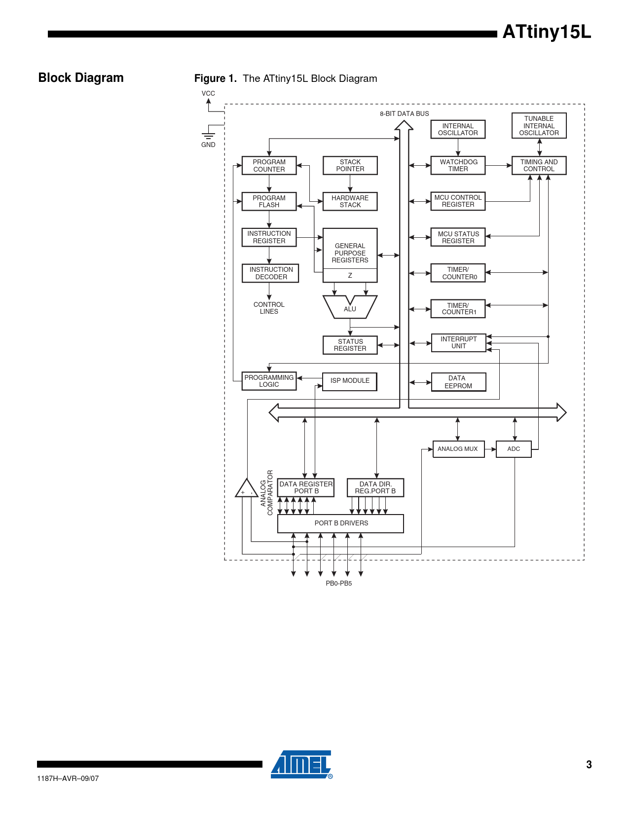 ATtiny15LBlock DiagramFigure 1. The ATtiny15L Block Diagram VCC 8-BIT DATA BUS TUNABLE INTERNAL INTERNAL OSCILLATOR OSCILLATOR GND PROGRAM STACK WATCHDOG TIMING AND COUNTER POINTER TIMER CONTROL PROGRAM HARDWARE MCU CONTROL FLASH STACK REGISTER INSTRUCTION MCU STATUS REGISTER REGISTER GENERAL PURPOSE REGISTERS INSTRUCTION TIMER/ DECODER Z COUNTER0 CONTROL TIMER/ ALU LINES COUNTER1 STATUS INTERRUPT REGISTER UNIT PROGRAMMING ISP MODULE DATA LOGIC EEPROM ANALOG MUX ADC DATA REGISTER DATA DIR. + - PORT B REG.PORT B ANALOG COMPARATOR PORT B DRIVERS PB0-PB5 3 1187H–AVR–09/07 Document Outline Features Pin Configuration Description Block Diagram Pin Descriptions VCC GND Port B (PB5..PB0) Analog Pins Internal Oscillators ATtiny15L Architectural Overview The General Purpose Register File The ALU - Arithmetic Logic Unit The Flash Program Memory The Program and Data Addressing Modes Register Direct, Single- register Rd Register Indirect Register Direct, Two Registers Rd and Rr I/O Direct Relative Program Addressing, RJMP and RCALL Constant Addressing using the LPM Instruction Subroutine and Interrupt Hardware Stack The EEPROM Data Memory Memory Access and Instruction Execution Timing I/O Memory The Status Register - SREG Reset and Interrupt Handling ATtiny15L Reset Sources Power-on Reset External Reset Brown-out Detection Watchdog Reset MCU Status Register - MCUSR Internal Voltage Reference Voltage Reference Enable Signals and Start-up Time Interrupt Handling Interrupt Response Time The General Interrupt Mask Register - GIMSK The General Interrupt Flag Register - GIFR The Timer/Counter Interrupt Mask Register - TIMSK The Timer/Counter Interrupt Flag Register - TIFR External Interrupt Pin Change Interrupt The MCU Control Register - MCUCR Sleep Modes Idle Mode ADC Noise Reduction Mode Power-down Mode Tuneable Internal RC Oscillator The System Clock Oscillator Calibration Register - OSCCAL Internal PLL for Fast Peripheral Clock Generation Timer/Counters The Timer/Counter0 Prescaler The Timer/Counter1 Prescaler The Special Function IO Register - SFIOR The 8-bit Timer/Counter0 The Timer/Counter0 Control Register - TCCR0 The Timer Counter 0 - TCNT0 The 8-bit Timer/Counter1 The Timer/Counter1 Control Register - TCCR1 The Timer/Counter1 - TCNT1 Timer/Counter1 Output Compare RegisterA - OCR1A Timer/Counter1 in PWM Mode Timer/Counter1 Output Compare RegisterB - OCR1B The Watchdog Timer The Watchdog Timer Control Register - WDTCR EEPROM Read/Write Access The EEPROM Address Register - EEAR The EEPROM Data Register - EEDR The EEPROM Control Register - EECR Preventing EEPROM Corruption The Analog Comparator The Analog Comparator Control and Status Register - ACSR The Analog-to-Digital Converter, Analog Multiplexer, and Gain Stages Features Operation Prescaling and Conversion Timing ADC Noise Canceler Function The ADC Multiplexer Selection Register - ADMUX The ADC Control and Status Register - ADCSR The ADC Data Register - ADCL and ADCH ADLAR = 0 ADLAR = 1 Scanning Multiple Channels ADC Noise-canceling Techniques ADC Characteristics I/O Port B Unconnected Pins Alternative Functions of Port B The Port B Data Register - PORTB The Port B Data Direction Register - DDRB The Port B Input Pins Address - PINB PORT B as General Digital I/O Alternate Functions of Port B Memory Programming Program and Data Memory Lock Bits Fuse Bits Signature Bytes Calibration Byte Programming the Flash High-voltage Serial Programming High-voltage Serial Programming Algorithm High-voltage Serial Programming Characteristics Low-voltage Serial Downloading Low-voltage Serial Programming Algorithm Data Polling Low-voltage Serial Programming Characteristics Electrical Characteristics Absolute Maximum Ratings DC Characteristics Typical Characteristics ATtiny15L Register Summary ATtiny15L Instruction Set Summary Ordering Information Packaging Information 8P3 8S2 Datasheet revision history Rev H - 09/07 Rev G - 06/07 Rev F - 06/05 Table of Contents