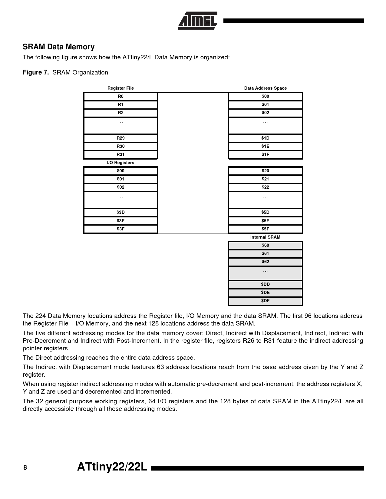 The following figure shows how the ATtiny22/L Data Memory is organized: