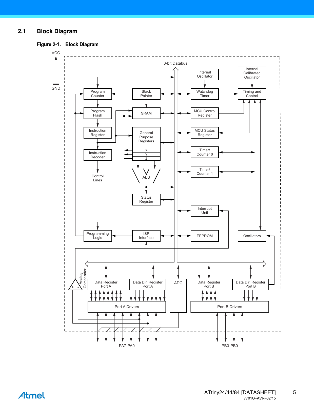 2.1Block DiagramFigure 2-1.Block Diagram VCC 8-bit Databus Internal Internal Calibrated Oscillator Oscillator GND Program Stack Watchdog Timing and Counter Pointer Timer Control Program MCU Control SRAM Flash Register Instruction MCU Status General Register Register Purpose Registers X Timer/ Instruction Y Counter 0 Decoder Z Timer/ Counter 1 Control ALU Lines Status Register Interrupt Unit Programming ISP EEPROM Oscillators Logic Interface Analog Data Register Data Dir. Register ADC Data Register Data Dir. Register + - Comparator Port A Port A Port B Port B Port A Drivers Port B Drivers PA7-PA0 PB3-PB0 ATtiny24/44/84 [DATASHEET] 5 7701G–AVR–02/15 Document Outline Features 1. Pin Configurations 1.1 Disclaimer 2. Overview 2.1 Block Diagram 2.2 Automotive Quality Grade 2.3 Pin Descriptions 2.3.1 VCC 2.3.2 GND 2.3.3 Port B (PB3...PB0) 2.3.4 RESET 2.3.5 Port A (PA7...PA0) 3. Resources 4. About Code Examples 5. CPU Core 5.1 Overview 5.2 Architectural Overview 5.3 ALU – Arithmetic Logic Unit 5.4 Status Register 5.4.1 SREG – AVR Status Register 5.5 General Purpose Register File 5.5.1 The X-register, Y-register, and Z-register 5.6 Stack Pointer 5.6.1 SPH and SPL – Stack Pointer High and Low 5.7 Instruction Execution Timing 5.8 Reset and Interrupt Handling 5.8.1 Interrupt Response Time 6. Memories 6.1 In-System Re-programmable Flash Program Memory 6.2 SRAM Data Memory 6.2.1 Data Memory Access Times 6.3 EEPROM Data Memory 6.3.1 EEPROM Read/Write Access 6.3.2 Atomic Byte Programming 6.3.3 Split Byte Programming 6.3.4 Erase 6.3.5 Write 6.3.6 Preventing EEPROM Corruption 6.4 I/O Memory 6.4.1 General Purpose I/O Registers 6.5 Register Description 6.5.1 EEARH – EEPROM Address Register 6.5.2 EEARL – EEPROM Address Register 6.5.3 EEDR – EEPROM Data Register 6.5.4 EECR – EEPROM Control Register 6.5.5 GPIOR2 – General Purpose I/O Register 2 6.5.6 GPIOR1 – General Purpose I/O Register 1 6.5.7 GPIOR0 – General Purpose I/O Register 0 7. System Clock and Clock Options 7.1 Clock Systems and their Distribution 7.1.1 CPU Clock – clkCPU 7.1.2 I/O Clock – clkI/O 7.1.3 Flash Clock – clkFLASH 7.1.4 ADC Clock – clkADC 7.2 Clock Sources 7.3 Default Clock Source 7.4 Crystal Oscillator 7.5 Low-frequency Crystal Oscillator 7.6 Calibrated Internal RC Oscillator 7.7 External Clock 7.8 128kHz Internal Oscillator 7.9 System Clock Prescaler 7.9.1 Switching Time 7.10 Register Description 7.10.1 Oscillator Calibration Register – OSCCAL 7.10.2 Clock Prescaler Register – CLKPR 8. Power Management and Sleep Modes 8.1 Sleep Modes 8.2 Idle Mode 8.3 ADC Noise Reduction Mode 8.4 Power-down Mode 8.5 Standby Mode 8.6 Software BOD Disable 8.7 Power Reduction Register 8.8 Minimizing Power Consumption 8.8.1 Analog-to-Digital Converter 8.8.2 Analog Comparator 8.8.3 Brown-out Detector 8.8.4 Internal Voltage Reference 8.8.5 Watchdog Timer 8.8.6 Port Pins 8.9 Register Description 8.9.1 MCUCR – MCU Control Register 8.9.2 PRR – Power Reduction Register 9. System Control and Reset 9.1 Resetting the AVR 9.2 Reset Sources 9.3 Power-on Reset 9.4 External Reset 9.5 Brown-out Detection 9.6 Watchdog Reset 9.7 Internal Voltage Reference 9.7.1 Voltage Reference Enable Signals and Start-up Time 9.8 Watchdog Timer 9.9 Timed Sequences for Changing the Configuration of the Watchdog Timer 9.9.1 Safety Level 1 9.9.2 Safety Level 2 9.10 Register Description 9.10.1 MCUSR – MCU Status Register 9.10.2 WDTCSR – Watchdog Timer Control and Status Register 10. Interrupts 10.1 Interrupt Vectors 11. External Interrupts 11.1 Pin Change Interrupt Timing 11.2 Register Description 11.2.1 MCUCR – MCU Control Register 11.2.2 GIMSK – General Interrupt Mask Register 11.2.3 GIFR – General Interrupt Flag Register 11.2.4 PCMSK1 – Pin Change Mask Register 1 11.2.5 PCMSK0 – Pin Change Mask Register 0 12. I/O Ports 12.1 Overview 12.2 Ports as General Digital I/O 12.2.1 Configuring the Pin 12.2.2 Toggling the Pin 12.2.3 Switching Between Input and Output 12.2.4 Reading the Pin Value 12.2.5 Digital Input Enable and Sleep Modes 12.2.6 Unconnected Pins 12.3 Alternate Port Functions 12.3.1 Alternate Functions of Port A 12.3.2 Alternate Functions of Port B 12.4 Register Description 12.4.1 MCUCR – MCU Control Register 12.4.2 PORTA – Port A Data Register 12.4.3 DDRA – Port A Data Direction Register 12.4.4 PINA – Port A Input Pins Address 12.4.5 PORTB – Port B Data Register 12.4.6 DDRB – Port B Data Direction Register 12.4.7 PINB – Port BInput Pins Address 13. 8-bit Timer/Counter0 with PWM 13.1 Features 13.2 Overview 13.2.1 Registers 13.2.2 Definitions 13.3 Timer/Counter Clock Sources 13.4 Counter Unit 13.5 Output Compare Unit 13.5.1 Force Output Compare 13.5.2 Compare Match Blocking by TCNT0 Write 13.5.3 Using the Output Compare Unit 13.6 Compare Match Output Unit 13.6.1 Compare Output Mode and Waveform Generation 13.7 Modes of Operation 13.7.1 Normal Mode 13.7.2 Clear Timer on Compare Match (CTC) Mode 13.7.3 Fast PWM Mode 13.7.4 Phase Correct PWM Mode 13.8 Timer/Counter Timing Diagrams 13.9 Register Description 13.9.1 TCCR0A – Timer/Counter Control Register A 13.9.2 TCCR0B – Timer/Counter Control Register B 13.9.3 TCNT0 – Timer/Counter Register 13.9.4 OCR0A – Output Compare Register A 13.9.5 OCR0B – Output Compare Register B 13.9.6 TIMSK0 – Timer/Counter 0 Interrupt Mask Register 13.9.7 TIFR0 – Timer/Counter 0 Interrupt Flag Register 14. 16-bit Timer/Counter1 14.1 Features 14.2 Overview 14.2.1 Registers 14.2.2 Definitions 14.2.3 Compatibility 14.3 Accessing 16-bit Registers 14.3.1 Reusing the Temporary High Byte Register 14.4 Timer/Counter Clock Sources 14.5 Counter Unit 14.6 Input Capture Unit 14.6.1 Input Capture Trigger Source 14.6.2 Noise Canceller 14.6.3 Using the Input Capture Unit 14.7 Output Compare Units 14.7.1 Force Output Compare 14.7.2 Compare Match Blocking by TCNT1 Write 14.7.3 Using the Output Compare Unit 14.8 Compare Match Output Unit 14.8.1 Compare Output Mode and Waveform Generation 14.9 Mode