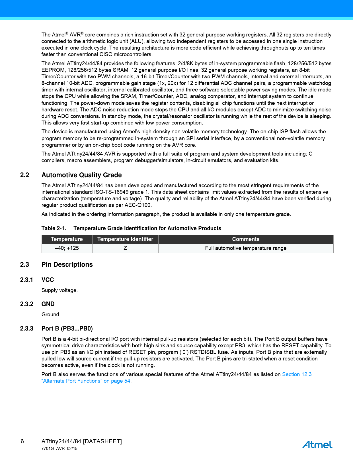link to page 54 link to page 54 The Atmel® AVR® core combines a rich instruction set with 32 general purpose working registers. All 32 registers are directly connected to the arithmetic logic unit (ALU), allowing two independent registers to be accessed in one single instruction executed in one clock cycle. The resulting architecture is more code efficient while achieving throughputs up to ten times faster than conventional CISC microcontrollers. The Atmel ATtiny24/44/84 provides the following features: 2/4/8K bytes of in-system programmable flash, 128/256/512 bytes EEPROM, 128/256/512 bytes SRAM, 12 general purpose I/O lines, 32 general purpose working registers, an 8-bit Timer/Counter with two PWM channels, a 16-bit Timer/Counter with two PWM channels, internal and external interrupts, an 8-channel 10-bit ADC, programmable gain stage (1x, 20x) for 12 differential ADC channel pairs, a programmable watchdog timer with internal oscillator, internal calibrated oscillator, and three software selectable power saving modes. The idle mode stops the CPU while allowing the SRAM, Timer/Counter, ADC, analog comparator, and interrupt system to continue functioning. The power-down mode saves the register contents, disabling all chip functions until the next interrupt or hardware reset. The ADC noise reduction mode stops the CPU and all I/O modules except ADC to minimize switching noise during ADC conversions. In standby mode, the crystal/resonator oscillator is running while the rest of the device is sleeping. This allows very fast start-up combined with low power consumption. The device is manufactured using Atmel's high-density non-volatile memory technology. The on-chip ISP flash allows the program memory to be re-programmed in-system through an SPI serial interface, by a conventional non-volatile memory programmer or by an on-chip boot code running on the AVR core. The Atmel ATtiny24/44/84 AVR is supported with a full suite of program and system development tools including: C compilers, macro assemblers, program debugger/simulators, in-circuit emulators, and evaluation kits. 2.2Automotive Quality Grade The Atmel ATtiny24/44/84 has been developed and manufactured according to the most stringent requirements of the international standard ISO-TS-16949 grade 1. This data sheet contains limit values extracted from the results of extensive characterization (temperature and voltage). The quality and reliability of the Atmel ATtiny24/44/84 have been verified during regular product qualification as per AEC-Q100. As indicated in the ordering information paragraph, the product is available in only one temperature grade. Table 2-1.Temperature Grade Identification for Automotive ProductsTemperatureTemperature IdentifierComments –40; +125 Z Full automotive temperature range 2.3Pin Descriptions2.3.1VCC Supply voltage. 2.3.2GND Ground. 2.3.3Port B (PB3...PB0) Port B is a 4-bit bi-directional I/O port with internal pull-up resistors (selected for each bit). The Port B output buffers have symmetrical drive characteristics with both high sink and source capability except PB3, which has the RESET capability. To use pin PB3 as an I/O pin instead of RESET pin, program (‘0’) RSTDISBL fuse. As inputs, Port B pins that are externally pulled low will source current if the pull-up resistors are activated. The Port B pins are tri-stated when a reset condition becomes active, even if the clock is not running. Port B also serves the functions of various special features of the Atmel ATtiny24/44/84 as listed on Section 12.3 “Alternate Port Functions” on page 54. 6 ATtiny24/44/84 [DATASHEET] 7701G–AVR–02/15 Document Outline Features 1. Pin Configurations 1.1 Disclaimer 2. Overview 2.1 Block Diagram 2.2 Automotive Quality Grade 2.3 Pin Descriptions 2.3.1 VCC 2.3.2 GND 2.3.3 Port B (PB3...PB0) 2.3.4 RESET 2.3.5 Port A (PA7...PA0) 3. Resources 4. About Code Examples 5. CPU Core 5.1 Overview 5.2 Architectural Overview 5.3 ALU – Arithmetic Logic Unit 5.4 Status Register 5.4.1 SREG – AVR Status Register 5.5 General Purpose Register File 5.5.1 The X-register, Y-register, and Z-register 5.6 Stack Pointer 5.6.1 SPH and SPL – Stack Pointer High and Low 5.7 Instruction Execution Timing 5.8 Reset and Interrupt Handling 5.8.1 Interrupt Response Time 6. Memories 6.1 In-System Re-programmable Flash Program Memory 6.2 SRAM Data Memory 6.2.1 Data Memory Access Times 6.3 EEPROM Data Memory 6.3.1 EEPROM Read/Write Access 6.3.2 Atomic Byte Programming 6.3.3 Split Byte Programming 6.3.4 Erase 6.3.5 Write 6.3.6 Preventing EEPROM Corruption 6.4 I/O Memory 6.4.1 General Purpose I/O Registers 6.5 Register Description 6.5.1 EEARH – EEPROM Address Register 6.5.2 EEARL – EEPROM Address Register 6.5.3 EEDR – EEPROM Data Register 6.5.4 EECR – EEPROM Control Register 6.5.5 GPIOR2 – General Purpose I/O Register 2 6.5.6 GPIOR1 – General Purpose I/O Register 1 6.5.7 GPIOR0 – General Purpose I/O Register 0 7. System Clock and Clock Options 7.1 Clock Systems and their Distribution 7.1.1 CPU Clock – clkCPU 7.1.2 I/O Clock – clkI/O 7.1.3 Flash Clock – clkFLASH 7.1.4 ADC Clock – clkADC 7.2 Clock Sources 7.3 Default Clock Source 7.4 Crystal Oscillator 7.5 Low-frequency Crystal Oscillator 7.6 Calibrated Internal RC Oscillator 7.7 External Clock 7.8 128kHz Internal Oscillator 7.9 System Clock Prescaler 7.9.1 Switching Time 7.10 Register Description 7.10.1 Oscillator Calibration Register – OSCCAL 7.10.2 Clock Prescaler Register – CLKPR 8. Power Management and Sleep Modes 8.1 Sleep Modes 8.2 Idle Mode 8.3 ADC Noise Reduction Mode 8.4 Power-down Mode 8.5 Standby Mode 8.6 Software BOD Disable 8.7 Power Reduction Register 8.8 Minimizing Power Consumption 8.8.1 Analog-to-Digital Converter 8.8.2 Analog Comparator 8.8.3 Brown-out Detector 8.8.4 Internal Voltage Reference 8.8.5 Watchdog Timer 8.8.6 Port Pins 8.9 Register Description 8.9.1 MCUCR – MCU Control Register 8.9.2 PRR – Power Reduction Register 9. System Control and 