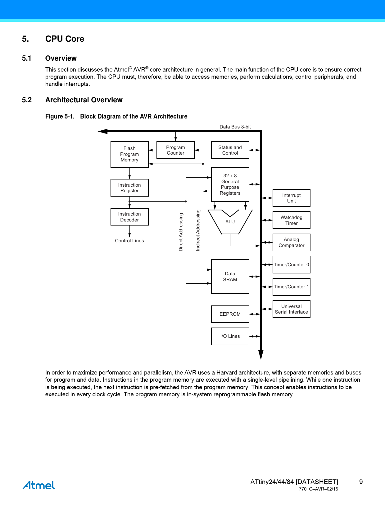 5.CPU Core5.1Overview This section discusses the Atmel® AVR® core architecture in general. The main function of the CPU core is to ensure correct program execution. The CPU must, therefore, be able to access memories, perform calculations, control peripherals, and handle interrupts. 5.2Architectural OverviewFigure 5-1.Block Diagram of the AVR Architecture Data Bus 8-bit Program Status and Flash Counter Control Program Memory 32 x 8 General Instruction Purpose Register Registers Interrupt Unit Instruction Watchdog Decoder ALU Timer Analog Control Lines Comparator Direct Addressing Indirect Addressing Timer/Counter 0 Data SRAM Timer/Counter 1 Universal Serial Interface EEPROM I/O Lines In order to maximize performance and parallelism, the AVR uses a Harvard architecture, with separate memories and buses for program and data. Instructions in the program memory are executed with a single-level pipelining. While one instruction is being executed, the next instruction is pre-fetched from the program memory. This concept enables instructions to be executed in every clock cycle. The program memory is in-system reprogrammable flash memory. ATtiny24/44/84 [DATASHEET] 9 7701G–AVR–02/15 Document Outline Features 1. Pin Configurations 1.1 Disclaimer 2. Overview 2.1 Block Diagram 2.2 Automotive Quality Grade 2.3 Pin Descriptions 2.3.1 VCC 2.3.2 GND 2.3.3 Port B (PB3...PB0) 2.3.4 RESET 2.3.5 Port A (PA7...PA0) 3. Resources 4. About Code Examples 5. CPU Core 5.1 Overview 5.2 Architectural Overview 5.3 ALU – Arithmetic Logic Unit 5.4 Status Register 5.4.1 SREG – AVR Status Register 5.5 General Purpose Register File 5.5.1 The X-register, Y-register, and Z-register 5.6 Stack Pointer 5.6.1 SPH and SPL – Stack Pointer High and Low 5.7 Instruction Execution Timing 5.8 Reset and Interrupt Handling 5.8.1 Interrupt Response Time 6. Memories 6.1 In-System Re-programmable Flash Program Memory 6.2 SRAM Data Memory 6.2.1 Data Memory Access Times 6.3 EEPROM Data Memory 6.3.1 EEPROM Read/Write Access 6.3.2 Atomic Byte Programming 6.3.3 Split Byte Programming 6.3.4 Erase 6.3.5 Write 6.3.6 Preventing EEPROM Corruption 6.4 I/O Memory 6.4.1 General Purpose I/O Registers 6.5 Register Description 6.5.1 EEARH – EEPROM Address Register 6.5.2 EEARL – EEPROM Address Register 6.5.3 EEDR – EEPROM Data Register 6.5.4 EECR – EEPROM Control Register 6.5.5 GPIOR2 – General Purpose I/O Register 2 6.5.6 GPIOR1 – General Purpose I/O Register 1 6.5.7 GPIOR0 – General Purpose I/O Register 0 7. System Clock and Clock Options 7.1 Clock Systems and their Distribution 7.1.1 CPU Clock – clkCPU 7.1.2 I/O Clock – clkI/O 7.1.3 Flash Clock – clkFLASH 7.1.4 ADC Clock – clkADC 7.2 Clock Sources 7.3 Default Clock Source 7.4 Crystal Oscillator 7.5 Low-frequency Crystal Oscillator 7.6 Calibrated Internal RC Oscillator 7.7 External Clock 7.8 128kHz Internal Oscillator 7.9 System Clock Prescaler 7.9.1 Switching Time 7.10 Register Description 7.10.1 Oscillator Calibration Register – OSCCAL 7.10.2 Clock Prescaler Register – CLKPR 8. Power Management and Sleep Modes 8.1 Sleep Modes 8.2 Idle Mode 8.3 ADC Noise Reduction Mode 8.4 Power-down Mode 8.5 Standby Mode 8.6 Software BOD Disable 8.7 Power Reduction Register 8.8 Minimizing Power Consumption 8.8.1 Analog-to-Digital Converter 8.8.2 Analog Comparator 8.8.3 Brown-out Detector 8.8.4 Internal Voltage Reference 8.8.5 Watchdog Timer 8.8.6 Port Pins 8.9 Register Description 8.9.1 MCUCR – MCU Control Register 8.9.2 PRR – Power Reduction Register 9. System Control and Reset 9.1 Resetting the AVR 9.2 Reset Sources 9.3 Power-on Reset 9.4 External Reset 9.5 Brown-out Detection 9.6 Watchdog Reset 9.7 Internal Voltage Reference 9.7.1 Voltage Reference Enable Signals and Start-up Time 9.8 Watchdog Timer 9.9 Timed Sequences for Changing the Configuration of the Watchdog Timer 9.9.1 Safety Level 1 9.9.2 Safety Level 2 9.10 Register Description 9.10.1 MCUSR – MCU Status Register 9.10.2 WDTCSR – Watchdog Timer Control and Status Register 10. Interrupts 10.1 Interrupt Vectors 11. External Interrupts 11.1 Pin Change Interrupt Timing 11.2 Register Description 11.2.1 MCUCR – MCU Control Register 11.2.2 GIMSK – General Interrupt Mask Register 11.2.3 GIFR – General Interrupt Flag Register 11.2.4 PCMSK1 – Pin Change Mask Register 1 11.2.5 PCMSK0 – Pin Change Mask Register 0 12. I/O Ports 12.1 Overview 12.2 Ports as General Digital I/O 12.2.1 Configuring the Pin 12.2.2 Toggling the Pin 12.2.3 Switching Between Input and Output 12.2.4 Reading the Pin Value 12.2.5 Digital Input Enable and Sleep Modes 12.2.6 Unconnected Pins 12.3 Alternate Port Functions 12.3.1 Alternate Functions of Port A 12.3.2 Alternate Functions of Port B 12.4 Register Description 12.4.1 MCUCR – MCU Control Register 12.4.2 PORTA – Port A Data Register 12.4.3 DDRA – Port A Data Direction Register 12.4.4 PINA – Port A Input Pins Address 12.4.5 PORTB – Port B Data Register 12.4.6 DDRB – Port B Data Direction Register 12.4.7 PINB – Port BInput Pins Address 13. 8-bit Timer/Counter0 with PWM 13.1 Features 13.2 Overview 13.2.1 Registers 13.2.2 Definitions 13.3 Timer/Counter Clock Sources 13.4 Counter Unit 13.5 Output Compare Unit 13.5.1 Force Output Compare 13.5.2 Compare Match Blocking by TCNT0 Write 13.5.3 Using the Output Compare Unit 13.6 Compare Match Output Unit 13.6.1 Compare Output Mode and Waveform Generation 13.7 Modes of Operation 13.7.1 Normal Mode 13.7.2 Clear Timer on Compare Match (CTC) Mode 13.7.3 Fast PWM Mode 13.7.4 Phase Correct PWM Mode 13.8 Timer/Counter Timing Diagrams 13.9 Register Description 13.9.1 TCCR0A – Timer/Counter Control Register A 13.9.2 TCCR0B – Timer/Counter Control Register B 13.9.3 TCNT0 – Timer/Counter Register 13.9.4 OCR0A – Output Compare Register A 13.9.5 OCR0B – Output Compare Register B 13.9.6 TIMSK0 – Timer/Counter 0 Interrupt Mask Register 13.9.7 TIFR0 – Timer/Counter 0 Interrupt Flag Register 14. 16-bit Timer/Counter1 14.1 Features 14.2 Ove