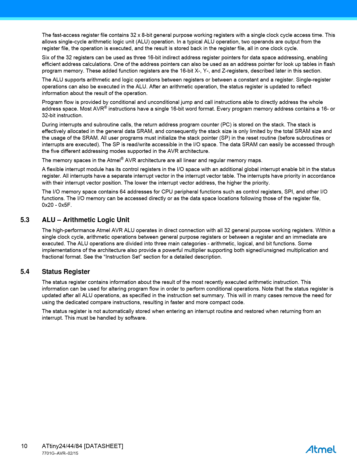 The fast-access register file contains 32 x 8-bit general purpose working registers with a single clock cycle access time. This allows single-cycle arithmetic logic unit (ALU) operation. In a typical ALU operation, two operands are output from the register file, the operation is executed, and the result is stored back in the register file, all in one clock cycle. Six of the 32 registers can be used as three 16-bit indirect address register pointers for data space addressing, enabling efficient address calculations. One of the address pointers can also be used as an address pointer for look up tables in flash program memory. These added function registers are the 16-bit X-, Y-, and Z-registers, described later in this section. The ALU supports arithmetic and logic operations between registers or between a constant and a register. Single-register operations can also be executed in the ALU. After an arithmetic operation, the status register is updated to reflect information about the result of the operation. Program flow is provided by conditional and unconditional jump and call instructions able to directly address the whole address space. Most AVR® instructions have a single 16-bit word format. Every program memory address contains a 16- or 32-bit instruction. During interrupts and subroutine calls, the return address program counter (PC) is stored on the stack. The stack is effectively allocated in the general data SRAM, and consequently the stack size is only limited by the total SRAM size and the usage of the SRAM. All user programs must initialize the stack pointer (SP) in the reset routine (before subroutines or interrupts are executed). The SP is read/write accessible in the I/O space. The data SRAM can easily be accessed through the five different addressing modes supported in the AVR architecture. The memory spaces in the Atmel® AVR architecture are all linear and regular memory maps. A flexible interrupt module has its control registers in the I/O space with an additional global interrupt enable bit in the status register. All interrupts have a separate interrupt vector in the interrupt vector table. The interrupts have priority in accordance with their interrupt vector position. The lower the interrupt vector address, the higher the priority. The I/O memory space contains 64 addresses for CPU peripheral functions such as control registers, SPI, and other I/O functions. The I/O memory can be accessed directly or as the data space locations following those of the register file, 0x20 - 0x5F. 5.3ALU – Arithmetic Logic Unit The high-performance Atmel AVR ALU operates in direct connection with all 32 general purpose working registers. Within a single clock cycle, arithmetic operations between general purpose registers or between a register and an immediate are executed. The ALU operations are divided into three main categories - arithmetic, logical, and bit functions. Some implementations of the architecture also provide a powerful multiplier supporting both signed/unsigned multiplication and fractional format. See the “Instruction Set” section for a detailed description. 5.4Status Register The status register contains information about the result of the most recently executed arithmetic instruction. This information can be used for altering program flow in order to perform conditional operations. Note that the status register is updated after all ALU operations, as specified in the instruction set summary. This will in many cases remove the need for using the dedicated compare instructions, resulting in faster and more compact code. The status register is not automatically stored when entering an interrupt routine and restored when returning from an interrupt. This must be handled by software. 10 ATtiny24/44/84 [DATASHEET] 7701G–AVR–02/15 Document Outline Features 1. Pin Configurations 1.1 Disclaimer 2. Overview 2.1 Block Diagram 2.2 Automotive Quality Grade 2.3 Pin Descriptions 2.3.1 VCC 2.3.2 GND 2.3.3 Port B (PB3...PB0) 2.3.4 RESET 2.3.5 Port A (PA7...PA0) 3. Resources 4. About Code Examples 5. CPU Core 5.1 Overview 5.2 Architectural Overview 5.3 ALU – Arithmetic Logic Unit 5.4 Status Register 5.4.1 SREG – AVR Status Register 5.5 General Purpose Register File 5.5.1 The X-register, Y-register, and Z-register 5.6 Stack Pointer 5.6.1 SPH and SPL – Stack Pointer High and Low 5.7 Instruction Execution Timing 5.8 Reset and Interrupt Handling 5.8.1 Interrupt Response Time 6. Memories 6.1 In-System Re-programmable Flash Program Memory 6.2 SRAM Data Memory 6.2.1 Data Memory Access Times 6.3 EEPROM Data Memory 6.3.1 EEPROM Read/Write Access 6.3.2 Atomic Byte Programming 6.3.3 Split Byte Programming 6.3.4 Erase 6.3.5 Write 6.3.6 Preventing EEPROM Corruption 6.4 I/O Memory 6.4.1 General Purpose I/O Registers 6.5 Register Description 6.5.1 EEARH – EEPROM Address Register 6.5.2 EEARL – EEPROM Address Register 6.5.3 EEDR – EEPROM Data Register 6.5.4 EECR – EEPROM Control Register 6.5.5 GPIOR2 – General Purpose I/O Register 2 6.5.6 GPIOR1 – General Purpose I/O Register 1 6.5.7 GPIOR0 – General Purpose I/O Register 0 7. System Clock and Clock Options 7.1 Clock Systems and their Distribution 7.1.1 CPU Clock – clkCPU 7.1.2 I/O Clock – clkI/O 7.1.3 Flash Clock – clkFLASH 7.1.4 ADC Clock – clkADC 7.2 Clock Sources 7.3 Default Clock Source 7.4 Crystal Oscillator 7.5 Low-frequency Crystal Oscillator 7.6 Calibrated Internal RC Oscillator 7.7 External Clock 7.8 128kHz Internal Oscillator 7.9 System Clock Prescaler 7.9.1 Switching Time 7.10 Register Description 7.10.1 Oscillator Calibration Register – OSCCAL 7.10.2 Clock Prescaler Register – CLKPR 8. Power Management and Sleep Modes 8.1 Sleep Modes 8.2 Idle Mode 8.3 ADC Noise Reduction Mode 8.4 Power-down Mode 8.5 Standby Mode 8.6 Software BOD Disable 8.7 Power Reduction Register 8.8 Minimizing Power Consumption 8.8.1 Analog-to-Digital Converter 8.8.2 Analog Comparator 8.8.3 Brown-out Detector 8.8.4 Internal Volt