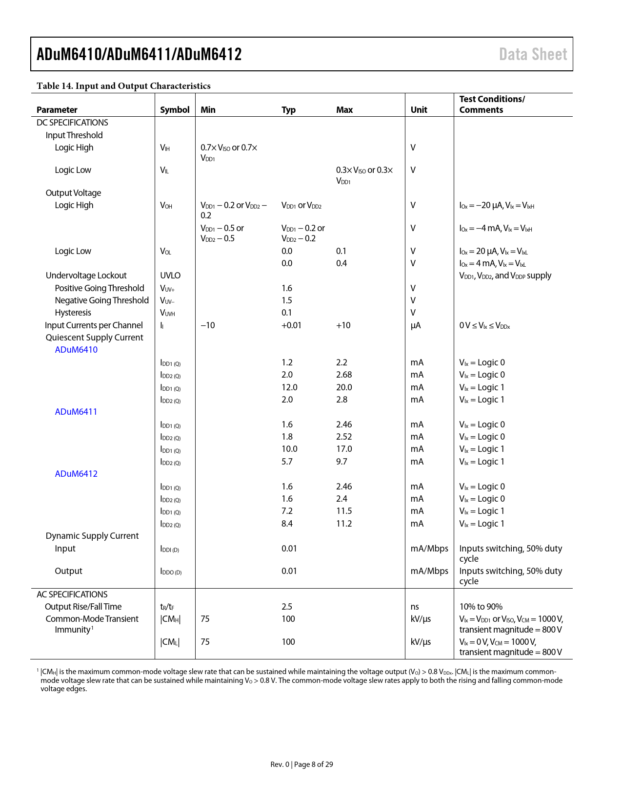 ADuM6410/ADuM6411/ADuM6412. Data Sheet. Table 14. Input and Output Characteristics. Test Conditions/. Parameter. Symbol Min. Typ. Max