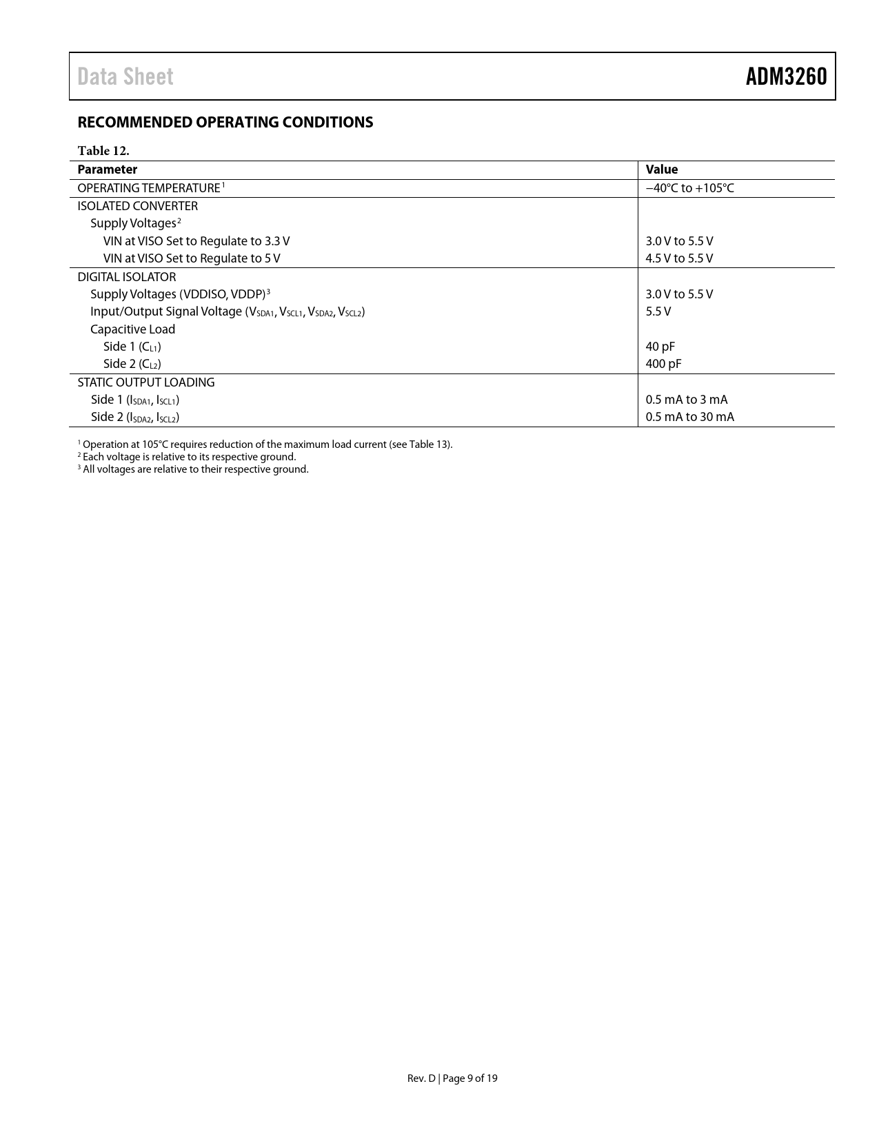 页数 / 页19 / 9 — Data Sheet. ADM3260. RECOMMENDED OPERATING CONDITIONS. Table 12. …