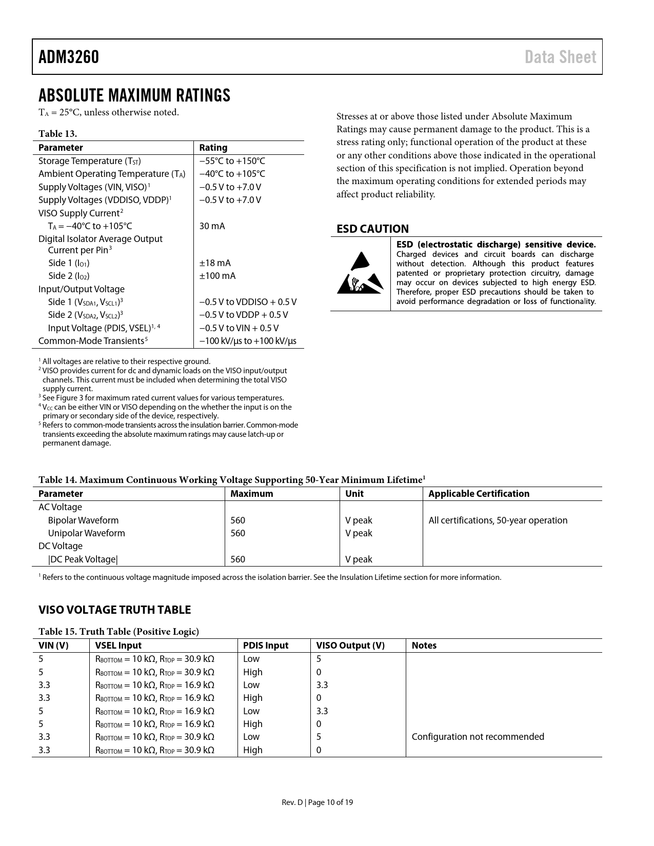 link to page 8 link to page 17 ADM3260Data SheetABSOLUTE MAXIMUM RATINGS TA = 25°C, unless otherwise noted. Stresses at or above those listed under Absolute Maximum Table 13. Ratings may cause permanent damage to the product. This is a ParameterRating stress rating only; functional operation of the product at these Storage Temperature (T or any other conditions above those indicated in the operational ST) −55°C to +150°C section of this specification is not implied. Operation beyond Ambient Operating Temperature (TA) −40°C to +105°C the maximum operating conditions for extended periods may Supply Voltages (VIN, VISO)1 −0.5 V to +7.0 V affect product reliability. Supply Voltages (VDDISO, VDDP)1 −0.5 V to +7.0 V VISO Supply Current2 TA = −40°C to +105°C 30 mA ESD CAUTION Digital Isolator Average Output Current per Pin3 Side 1 (IO1) ±18 mA Side 2 (IO2) ±100 mA Input/Output Voltage Side 1 (VSDA1, VSCL1)3 −0.5 V to VDDISO + 0.5 V Side 2 (VSDA2, VSCL2)3 −0.5 V to VDDP + 0.5 V Input Voltage (PDIS, VSEL)1, 4 −0.5 V to VIN + 0.5 V Common-Mode Transients5 −100 kV/µs to +100 kV/µs 1 All voltages are relative to their respective ground. 2 VISO provides current for dc and dynamic loads on the VISO input/output channels. This current must be included when determining the total VISO supply current. 3 See Figure 3 for maximum rated current values for various temperatures. 4 VCC can be either VIN or VISO depending on the whether the input is on the primary or secondary side of the device, respectively. 5 Refers to common-mode transients across the insulation barrier. Common-mode transients exceeding the absolute maximum ratings may cause latch-up or permanent damage. Table 14. Maximum Continuous Working Voltage Supporting 50-Year Minimum Lifetime1 ParameterMaximumUnitApplicable Certification AC Voltage Bipolar Waveform 560 V peak All certifications, 50-year operation Unipolar Waveform 560 V peak DC Voltage |DC Peak Voltage| 560 V peak 1 Refers to the continuous voltage magnitude imposed across the isolation barrier. See the Insulation Lifetime section for more information. VISO VOLTAGE TRUTH TABLETable 15. Truth Table (Positive Logic) VIN (V)VSEL InputPDIS InputVISO Output (V)Notes 5 RBOTTOM = 10 kΩ, RTOP = 30.9 kΩ Low 5 5 RBOTTOM = 10 kΩ, RTOP = 30.9 kΩ High 0 3.3 RBOTTOM = 10 kΩ, RTOP = 16.9 kΩ Low 3.3 3.3 RBOTTOM = 10 kΩ, RTOP = 16.9 kΩ High 0 5 RBOTTOM = 10 kΩ, RTOP = 16.9 kΩ Low 3.3 5 RBOTTOM = 10 kΩ, RTOP = 16.9 kΩ High 0 3.3 RBOTTOM = 10 kΩ, RTOP = 30.9 kΩ Low 5 Configuration not recommended 3.3 RBOTTOM = 10 kΩ, RTOP = 30.9 kΩ High 0 Rev. D | Page 10 of 19 Document Outline FEATURES APPLICATIONS FUNCTIONAL BLOCK DIAGRAM GENERAL DESCRIPTION REVISION HISTORY SPECIFICATIONS ELECTRICAL CHARACTERISTICS—5 V PRIMARY INPUT SUPPLY/5 V SECONDARY ISOLATED SUPPLY ELECTRICAL CHARACTERISTICS—5 V PRIMARY INPUT SUPPLY/3.3 V SECONDARY ISOLATED SUPPLY ELECTRICAL CHARACTERISTICS—3.3 V PRIMARY INPUT SUPPLY/3.3 V SECONDARY ISOLATED SUPPLY DC-TO-DC CONVERTER CHARACTERISTICS DIGITAL ISOLATOR DC SPECIFICATIONS DIGITAL ISOLATOR AC SPECIFICATIONS PACKAGE CHARACTERISTICS REGULATORY APPROVALS INSULATION AND SAFETY RELATED SPECIFICATIONS DIN V VDE V 0884-10 (VDE V 0884-10) INSULATION CHARACTERISTICS RECOMMENDED OPERATING CONDITIONS ABSOLUTE MAXIMUM RATINGS ESD CAUTION VISO VOLTAGE TRUTH TABLE PIN CONFIGURATION AND FUNCTION DESCRIPTIONS TYPICAL PERFORMANCE CHARACTERISTICS TEST CONDITION APPLICATIONS INFORMATION FUNCTIONAL DESCRIPTION DIGITAL ISOLATOR STARTUP TYPICAL APPLICATION DIAGRAM PCB LAYOUT THERMAL ANALYSIS EMI CONSIDERATIONS INSULATION LIFETIME APPLICATIONS EXAMPLE OUTLINE DIMENSIONS ORDERING GUIDE