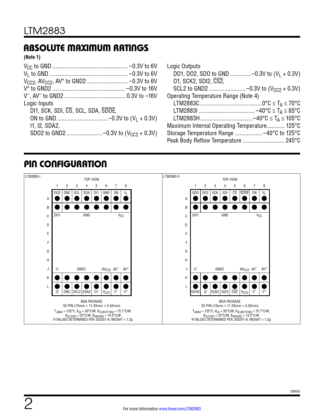 LTM2883-I LTM2883-S TOP VIEW TOP VIEW 1 2 3 4 5 6 7 8 1 2 3 4 5 6 7 8 DO2 DNC SCL SDA DI1 GND ON VL SDO DO2 SCK SDI CS SDOE ON VL A A B B DO1 GND V C CC DO1 GND V C CC D D E E F F G G H H J I1 AVCC2 AV+ AV– GND2 J I1 AVCC2 AV+ AV– GND2 K K L L I2 DNC SCL2 SDA2 O1 VCC2 V– V+ SDO2 I2 SCK2 SDI2 CS2 VCC2 V– V+ BGA PACKAGE BGA PACKAGE 32-PIN (15mm × 11.25mm × 3.42mm) 32-PIN (15mm × 11.25mm × 3.42mm) TJMAX = 125°C, θJA = 30°C/W, θJC(BOTTOM) = 15.7°C/W, TJMAX = 125°C, θJA = 30°C/W, θJC(BOTTOM) = 15.7°C/W, θJC(TOP) = 25°C/W, θJBOARD = 14.5°C/W θJC(TOP) = 25°C/W, θJBOARD = 14.5°C/W θ VALUES DETERMINED PER JESD51-9, WEIGHT = 1.2g θ VALUES DETERMINED PER JESD51-9, WEIGHT = 1.2g 2883fd 2 For more information www.linear.com/LTM2883 Document Outline Features Applications Description Typical Application Absolute Maximum Ratings Pin Configuration Order Information Electrical Characteristics Switching Characteristics Isolation Characteristics Typical Performance Characteristics Pin Functions Block Diagram Test Circuits Applications Information Package Description Typical Application Related Parts