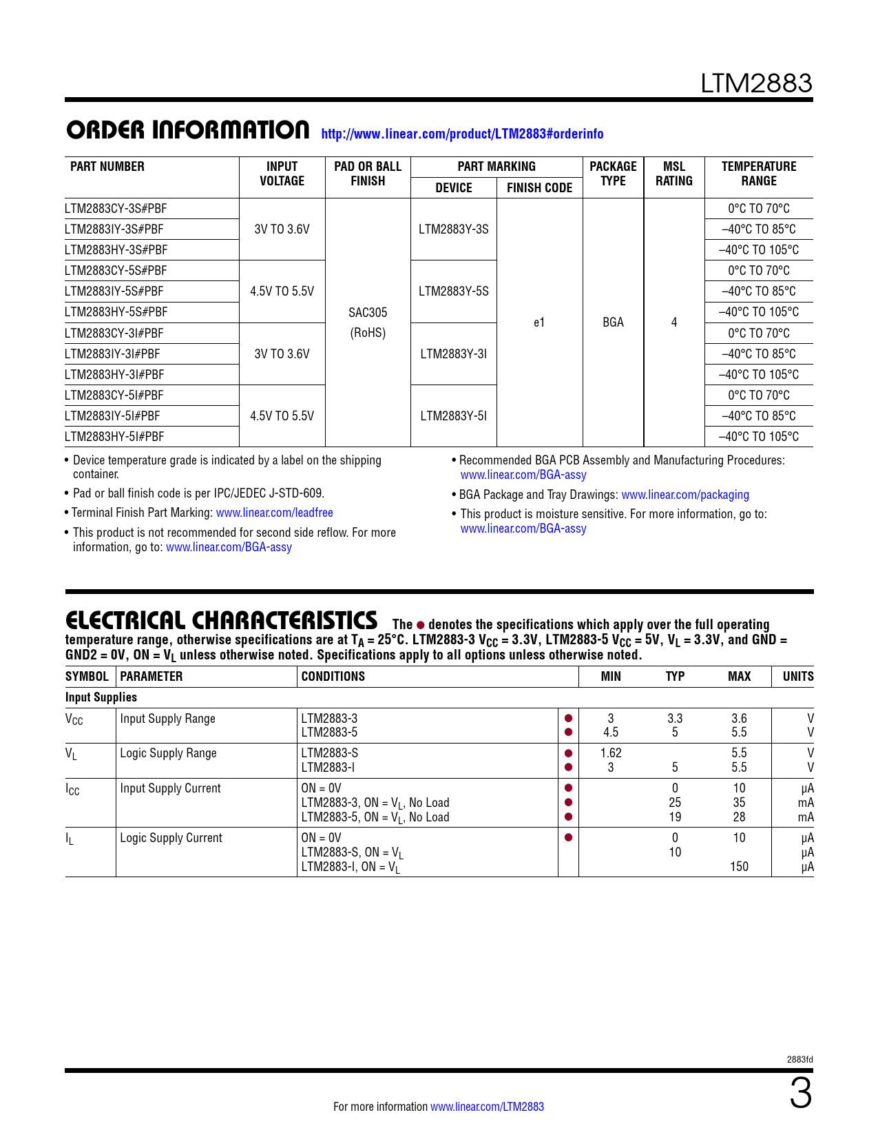 LTM2883 ORDER INFORMATION http://www.linear.com/product/LTM2883#orderinfoPART NUMBERINPUTPAD OR BALLPART MARKINGPACKAGEMSLTEMPERATUREVOLTAGEFINISHTYPERATINGRANGEDEVICEFINISH CODE LTM2883CY-3S#PBF 0°C TO 70°C LTM2883IY-3S#PBF 3V TO 3.6V LTM2883Y-3S –40°C TO 85°C LTM2883HY-3S#PBF –40°C TO 105°C LTM2883CY-5S#PBF 0°C TO 70°C LTM2883IY-5S#PBF 4.5V TO 5.5V LTM2883Y-5S –40°C TO 85°C LTM2883HY-5S#PBF SAC305 –40°C TO 105°C e1 BGA 4 LTM2883CY-3I#PBF (RoHS) 0°C TO 70°C LTM2883IY-3I#PBF 3V TO 3.6V LTM2883Y-3I –40°C TO 85°C LTM2883HY-3I#PBF –40°C TO 105°C LTM2883CY-5I#PBF 0°C TO 70°C LTM2883IY-5I#PBF 4.5V TO 5.5V LTM2883Y-5I –40°C TO 85°C LTM2883HY-5I#PBF –40°C TO 105°C • Device temperature grade is indicated by a label on the shipping • Recommended BGA PCB Assembly and Manufacturing Procedures: container. www.linear.com/BGA-assy • Pad or ball finish code is per IPC/JEDEC J-STD-609. • BGA Package and Tray Drawings: www.linear.com/packaging • Terminal Finish Part Marking: www.linear.com/leadfree • This product is moisture sensitive. For more information, go to: • This product is not recommended for second side reflow. For more www.linear.com/BGA-assy information, go to: www.linear.com/BGA-assy ELECTRICALCHARACTERISTICS The l denotes the specifications which apply over the full operatingtemperature range, otherwise specifications are at TA = 25°C. LTM2883-3 VCC = 3.3V, LTM2883-5 VCC = 5V, VL = 3.3V, and GND =GND2 = 0V, ON = VL unless otherwise noted. Specifications apply to all options unless otherwise noted. SYMBOL PARAMETERCONDITIONSMINTYPMAXUNITSInput Supplies VCC Input Supply Range LTM2883-3 l 3 3.3 3.6 V LTM2883-5 l 4.5 5 5.5 V VL Logic Supply Range LTM2883-S l 1.62 5.5 V LTM2883-I l 3 5 5.5 V ICC Input Supply Current ON = 0V l 0 10 µA LTM2883-3, ON = VL, No Load l 25 35 mA LTM2883-5, ON = VL, No Load l 19 28 mA IL Logic Supply Current ON = 0V l 0 10 µA LTM2883-S, ON = VL 10 µA LTM2883-I, ON = VL 150 µA 2883fd For more information www.linear.com/LTM2883 3 Document Outline Features Applications Description Typical Application Absolute Maximum Ratings Pin Configuration Order Information Electrical Characteristics Switching Characteristics Isolation Characteristics Typical Performance Characteristics Pin Functions Block Diagram Test Circuits Applications Information Package Description Typical Application Related Parts
