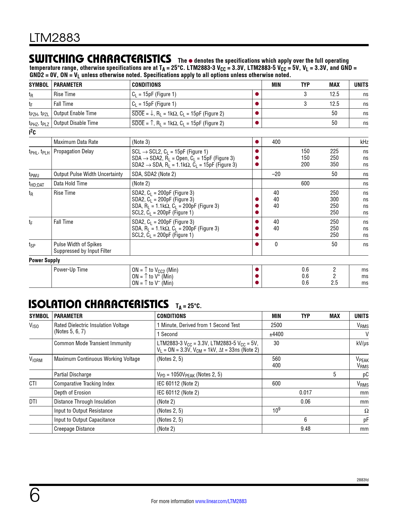 VISO Rated Dielectric Insulation Voltage 1 Minute, Derived from 1 Second Test 2500 VRMS (Notes 5, 6, 7) 1 Second ±4400 V Common Mode Transient Immunity LTM2883-3 VCC = 3.3V, LTM2883-5 VCC = 5V, 30 kV/µs VL = ON = 3.3V, VCM = 1kV, Δt = 33ns (Note 2) VIORM Maximum Continuous Working Voltage (Notes 2, 5) 560 VPEAK 400 VRMS Partial Discharge VPD = 1050VPEAK (Notes 2, 5) 5 pC CTI Comparative Tracking Index IEC 60112 (Note 2) 600 VRMS Depth of Erosion IEC 60112 (Note 2) 0.017 mm DTI Distance Through Insulation (Note 2) 0.06 mm Input to Output Resistance (Notes 2, 5) 109 Ω Input to Output Capacitance (Notes 2, 5) 6 pF Creepage Distance (Note 2) 9.48 mm 2883fd 6 For more information www.linear.com/LTM2883 Document Outline Features Applications Description Typical Application Absolute Maximum Ratings Pin Configuration Order Information Electrical Characteristics Switching Characteristics Isolation Characteristics Typical Performance Characteristics Pin Functions Block Diagram Test Circuits Applications Information Package Description Typical Application Related Parts