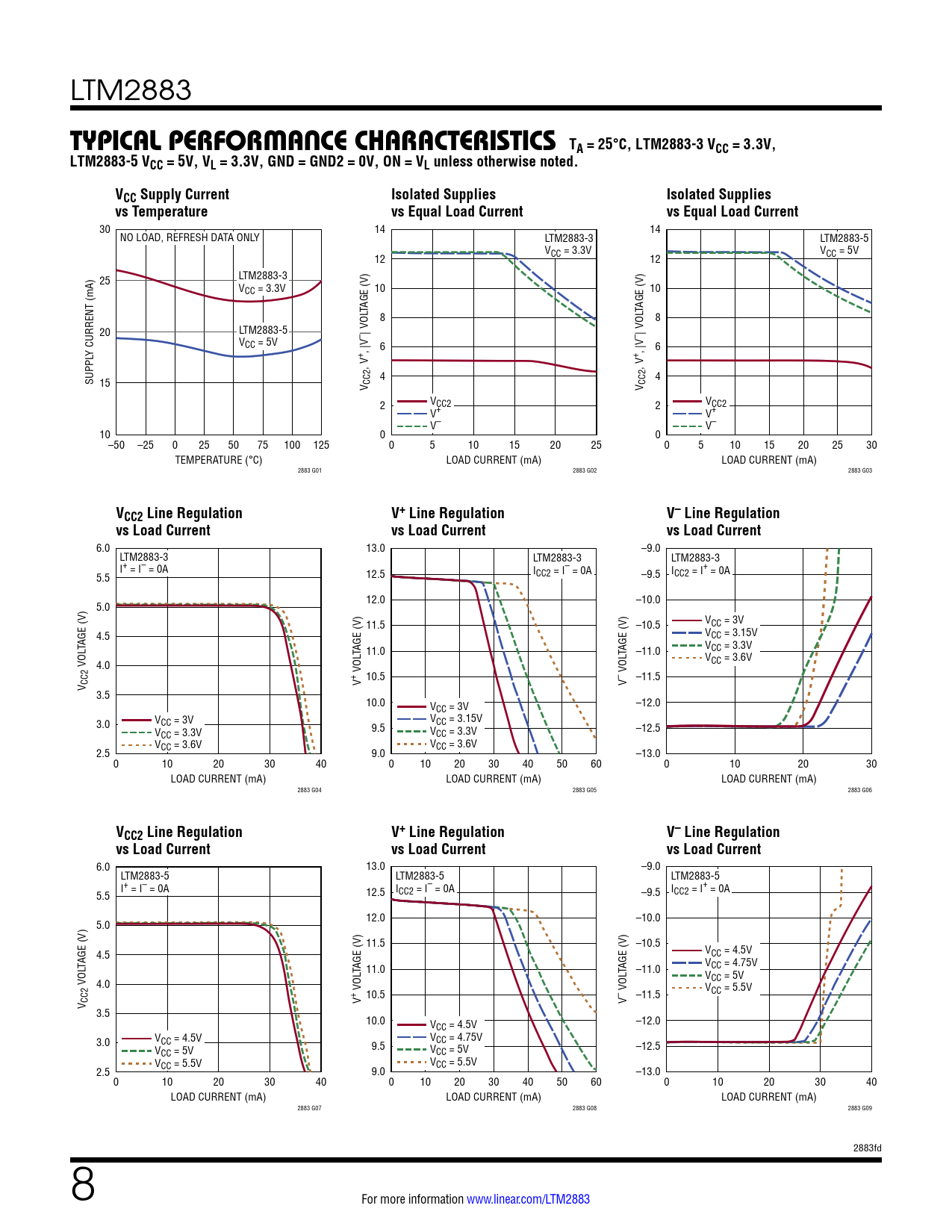 TYPICAL PERFORMANCE CHARACTERISTICS TA = 25°C, LTM2883-3 VCC = 3.3V, LTM2883-5 VCC = 5V, VL = 3.3V, GND = GND2 = 0V, ON = VL unless otherwise noted. VCC Supply Current Isolated Supplies Isolated Supplies vs Temperature vs Equal Load Current vs Equal Load Current
