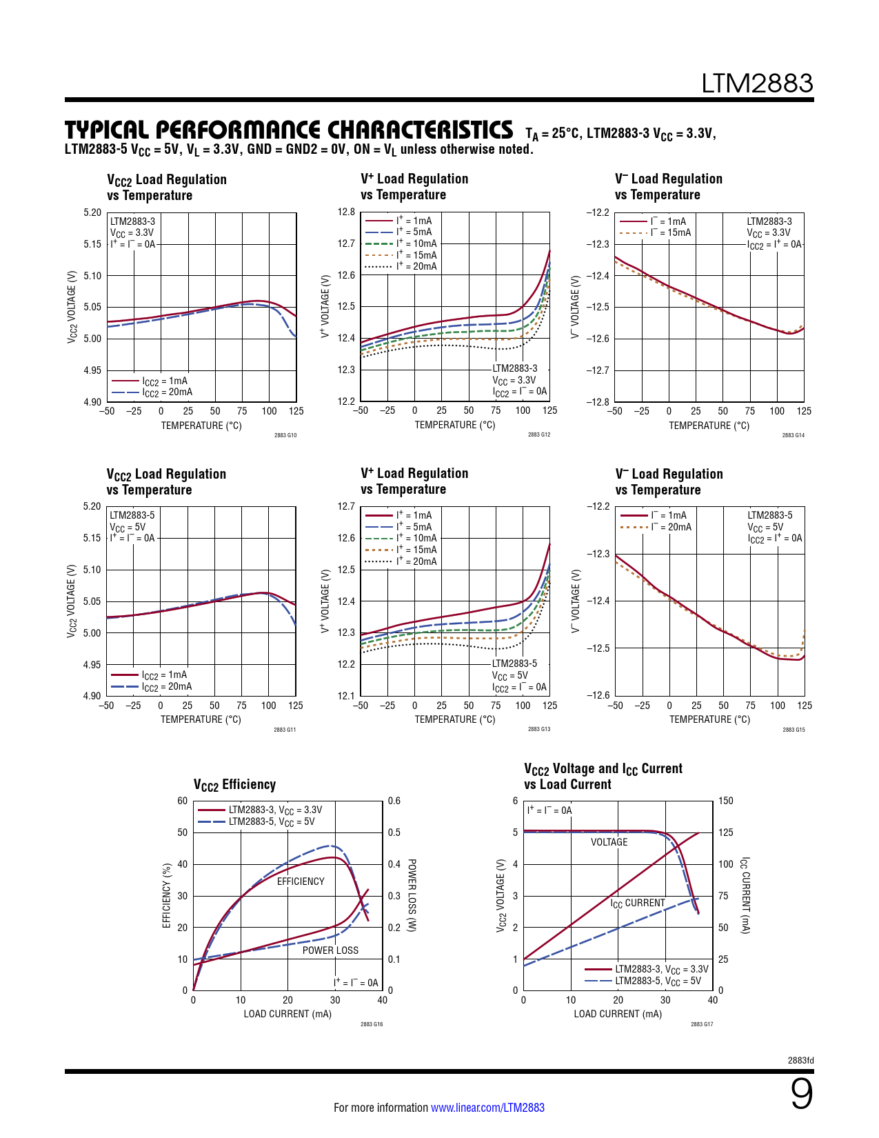 TYPICAL PERFORMANCE CHARACTERISTICS TA = 25°C, LTM2883-3 VCC = 3.3V, LTM2883-5 VCC = 5V, VL = 3.3V, GND = GND2 = 0V, ON = VL unless otherwise noted. V V+ Load Regulation V– Load Regulation CC2 Load Regulation vs Temperature vs Temperature vs Temperature