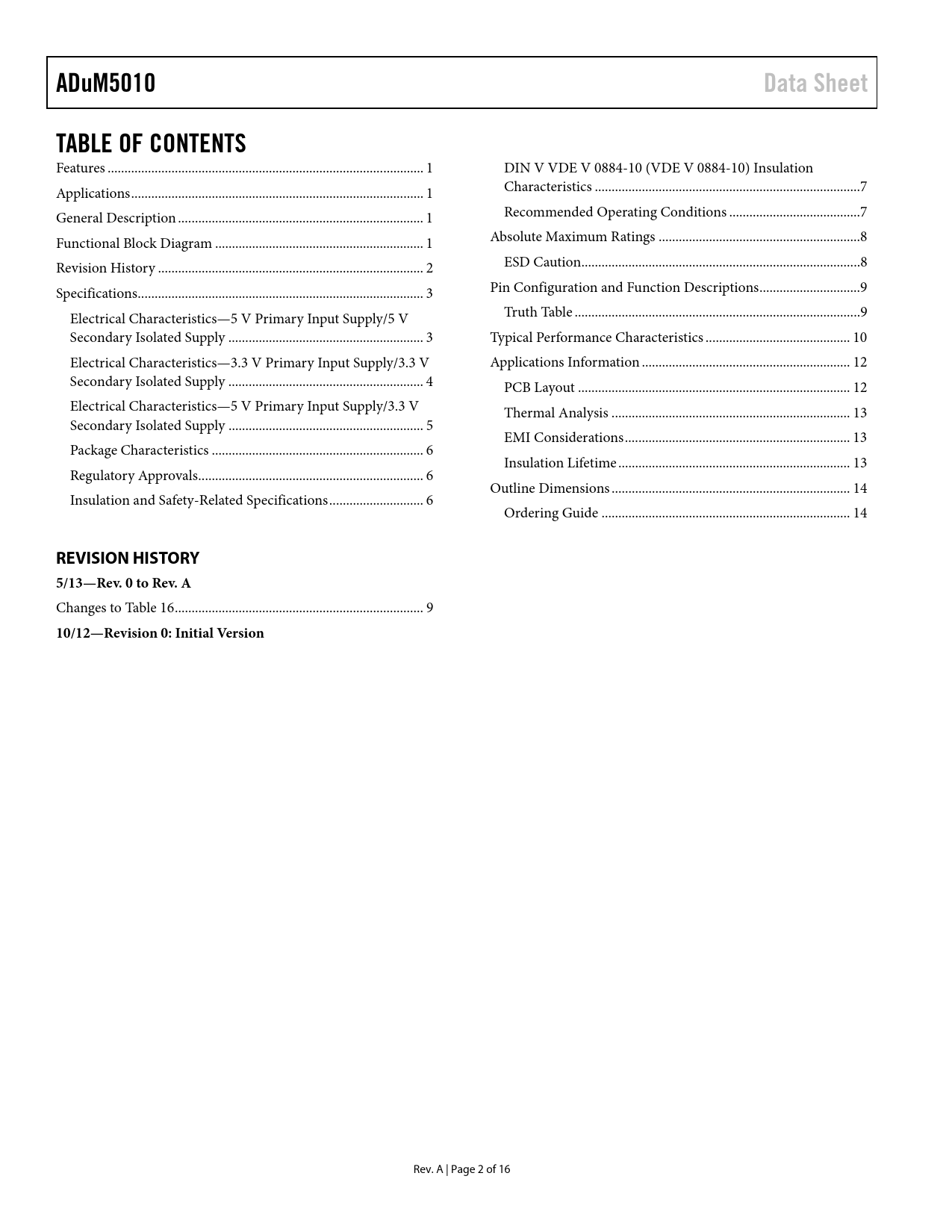 页数 / 页16 / 2 — ADuM5010. Data Sheet. TABLE OF CONTENTS. REVISION HISTORY 5/13—Rev. 0 to …